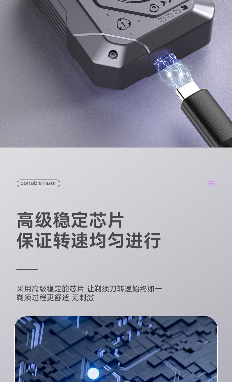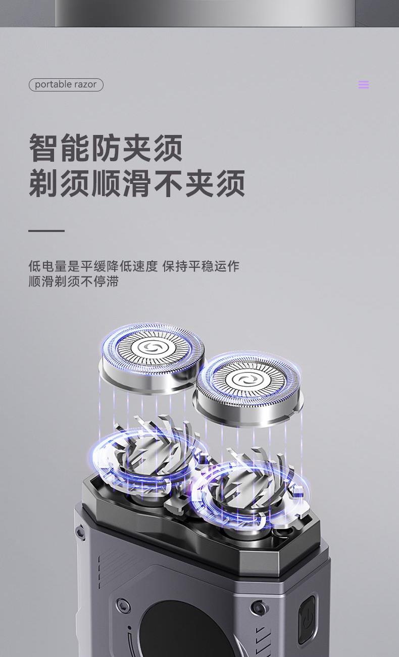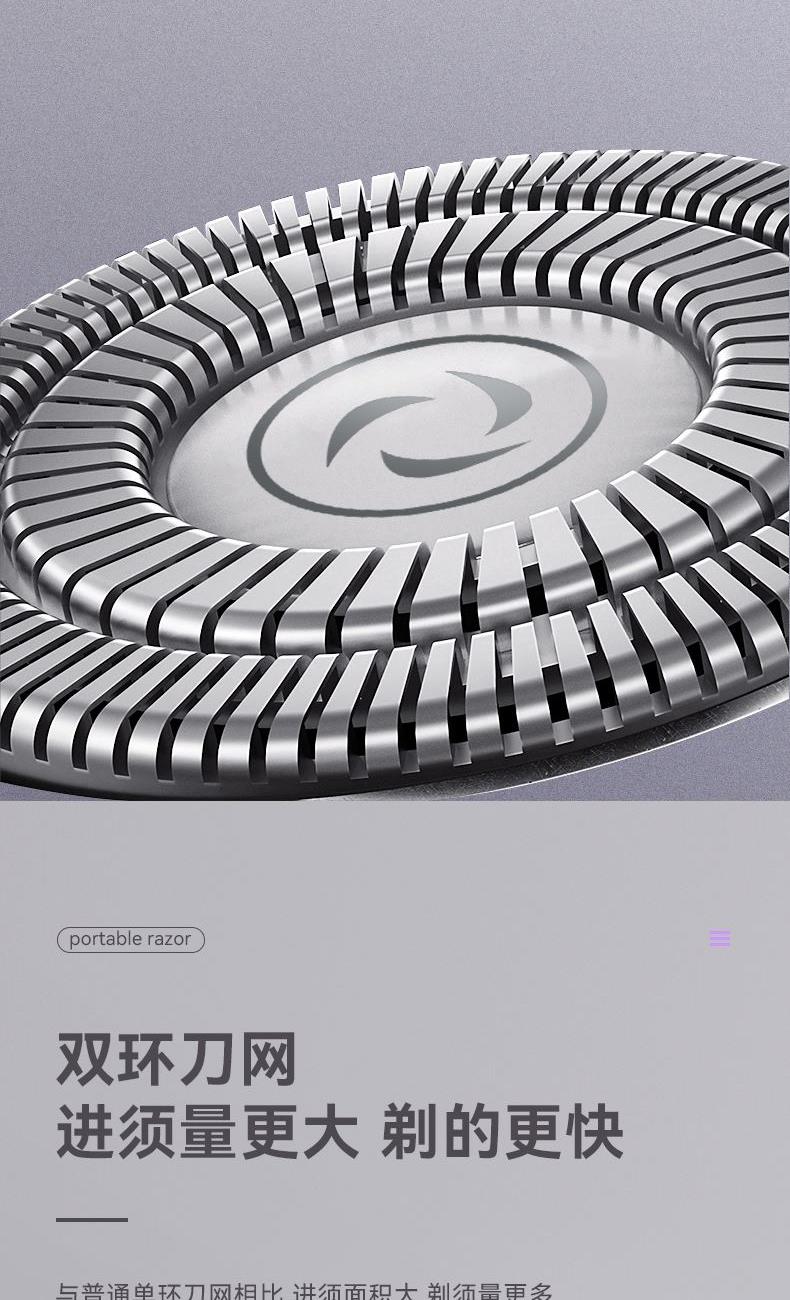 额定电压:3.7V⎓ 额定功率:5W 额定输入:5V~1A 电池容量:400mAh 防水等级:IPX7 包装清单:剃须刀,说明书,Type-C充电线,清洁刷 迷你便携,单手可握 双环浮动刀网,双倍提升进须量 TYPE-C快充,60天长效续航 IPX7级防水,机身随心洗 刀头磁吸设计,灵活好拆洗