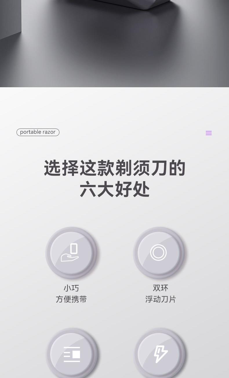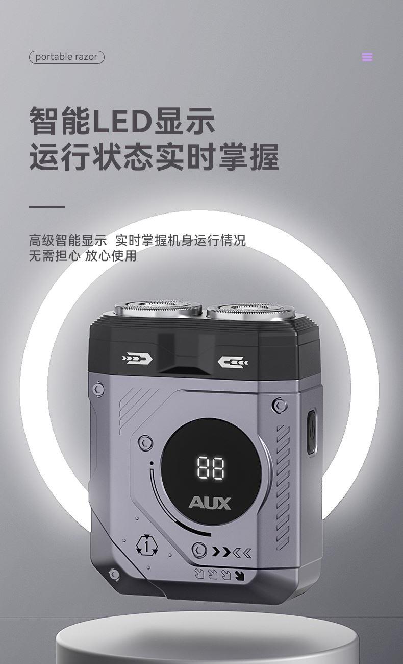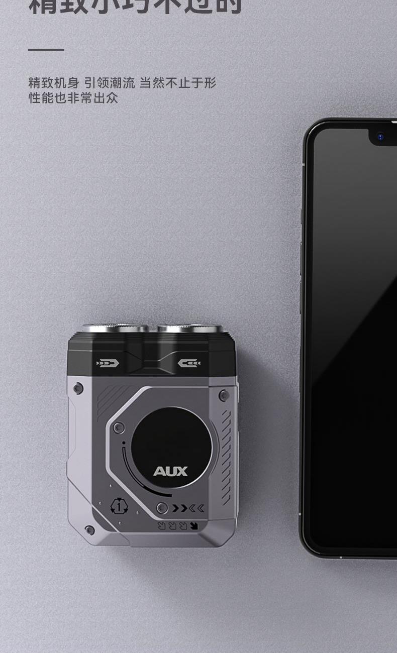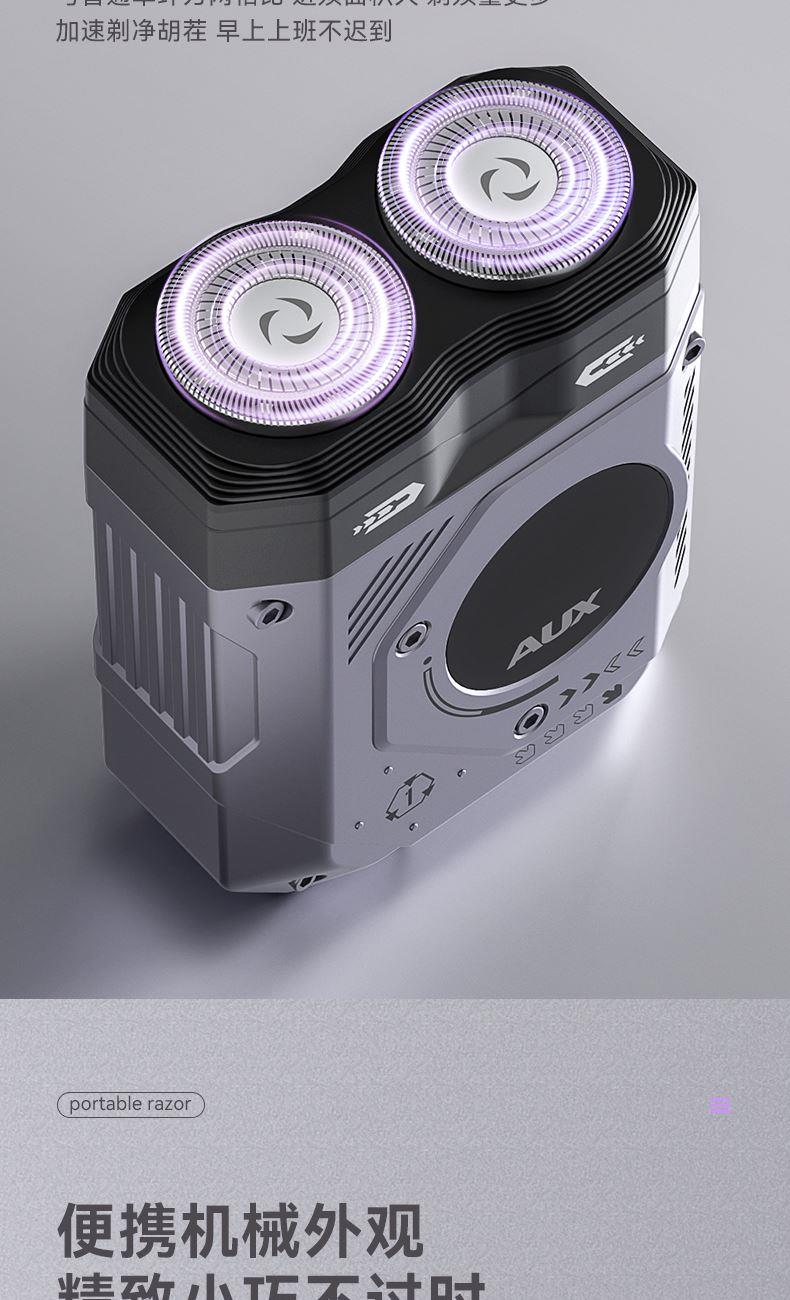 额定电压:3.7V⎓ 额定功率:5W 额定输入:5V~1A 电池容量:400mAh 防水等级:IPX7 包装清单:剃须刀,说明书,Type-C充电线,清洁刷 迷你便携,单手可握 双环浮动刀网,双倍提升进须量 TYPE-C快充,60天长效续航 IPX7级防水,机身随心洗 刀头磁吸设计,灵活好拆洗