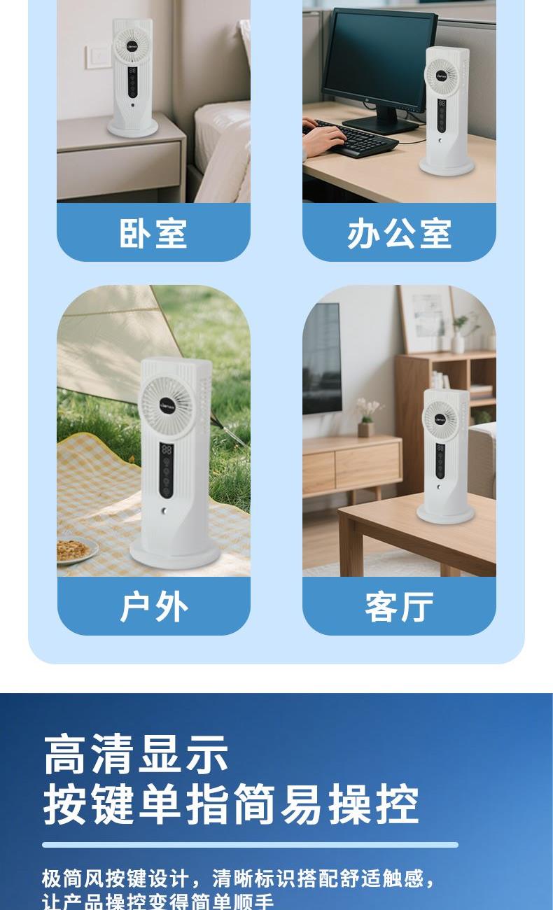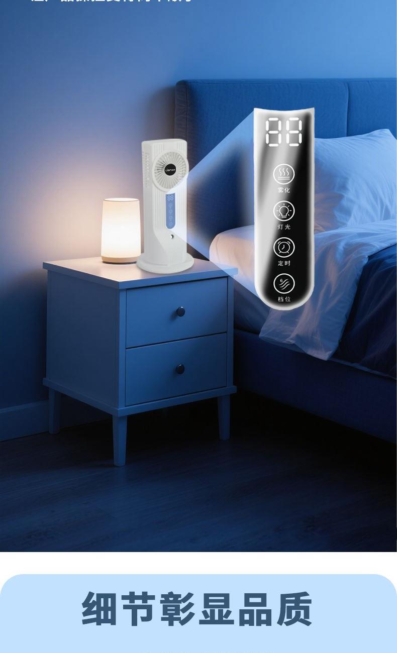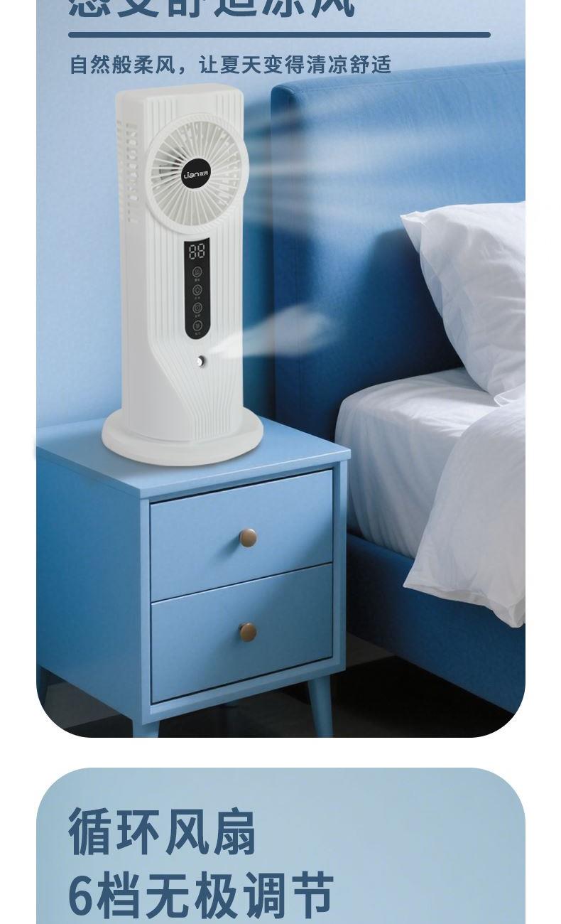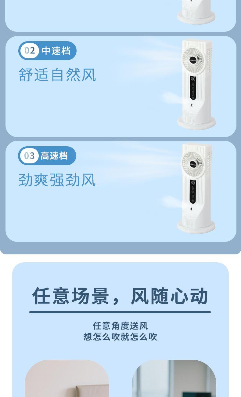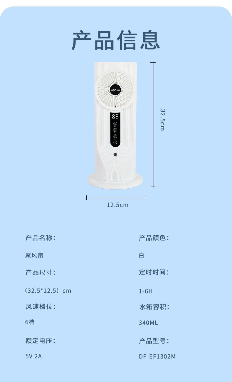 产品参数 额定电压:5V 输入电源:2A 额定功率:10w 水箱容量:340ml 雾化量:30mL/h 产品净重:700g 产品毛重:800g 产品尺寸:325×125×125mm 彩盒尺寸:340×160×165mm 产品特点 1、旋涡式出风口,风力集中且方向聚焦。 2、六档风速随心选,满足多元清凉需求。 3、小时定时,智能掌控风扇运行时长。 4、湿喷雾,吹风同时润泽空气。 5、面精巧适配,便捷置于各类台面使用。