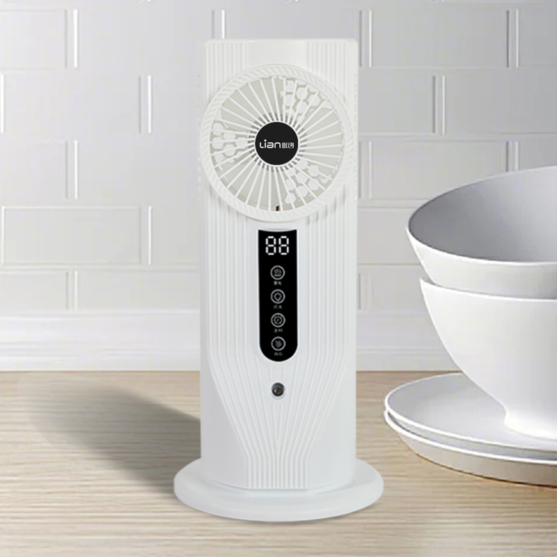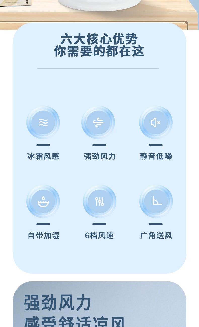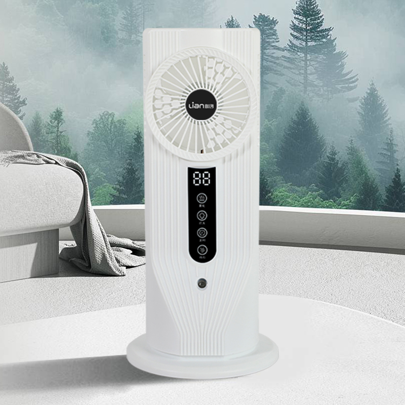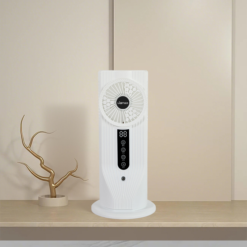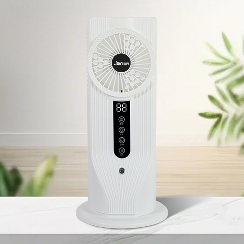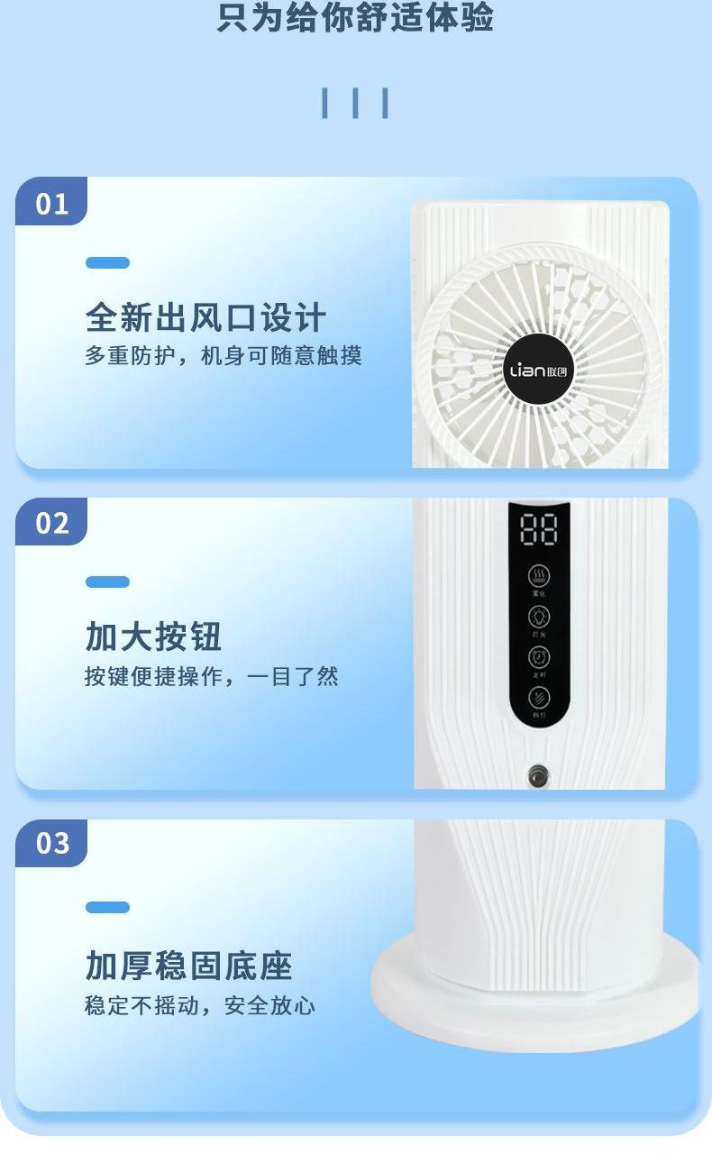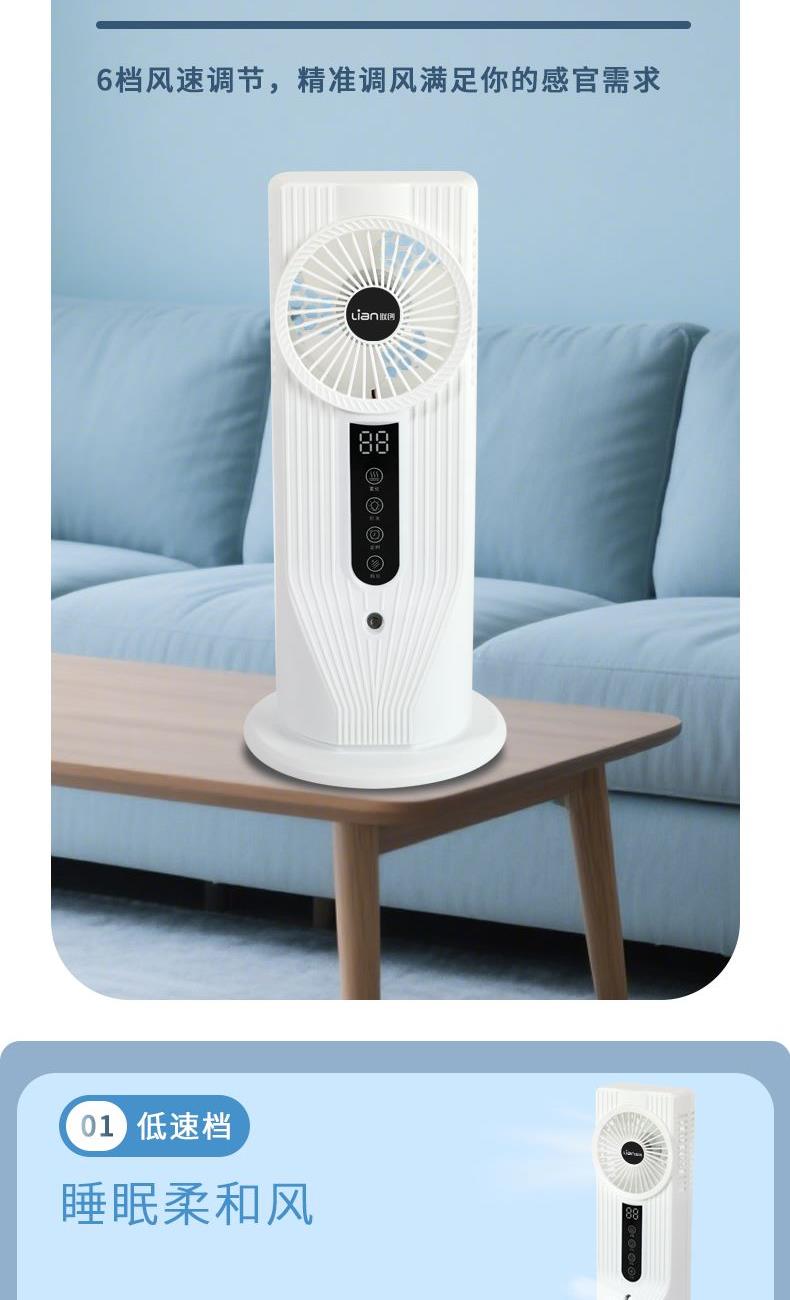 产品参数 额定电压:5V 输入电源:2A 额定功率:10w 水箱容量:340ml 雾化量:30mL/h 产品净重:700g 产品毛重:800g 产品尺寸:325×125×125mm 彩盒尺寸:340×160×165mm 产品特点 1、旋涡式出风口,风力集中且方向聚焦。 2、六档风速随心选,满足多元清凉需求。 3、小时定时,智能掌控风扇运行时长。 4、湿喷雾,吹风同时润泽空气。 5、面精巧适配,便捷置于各类台面使用。