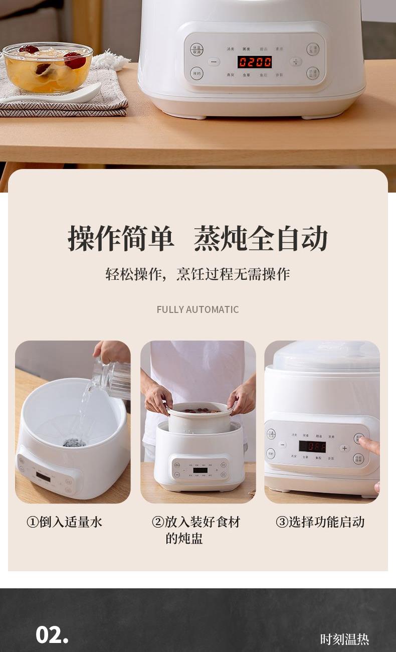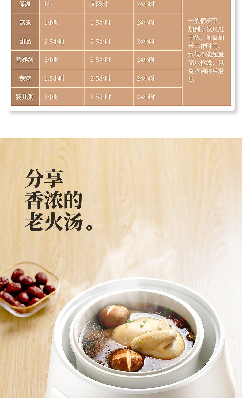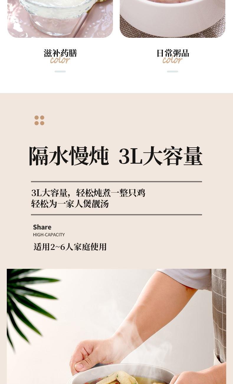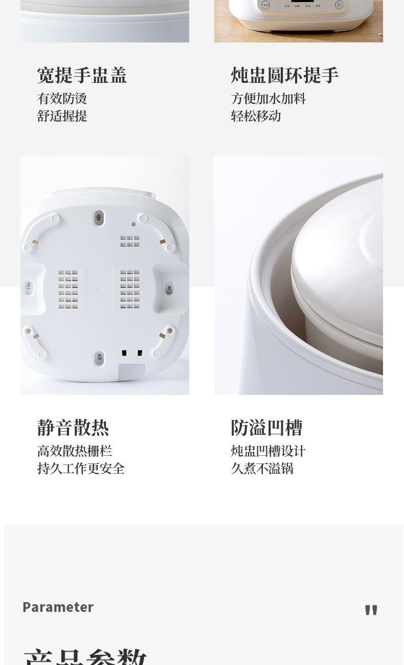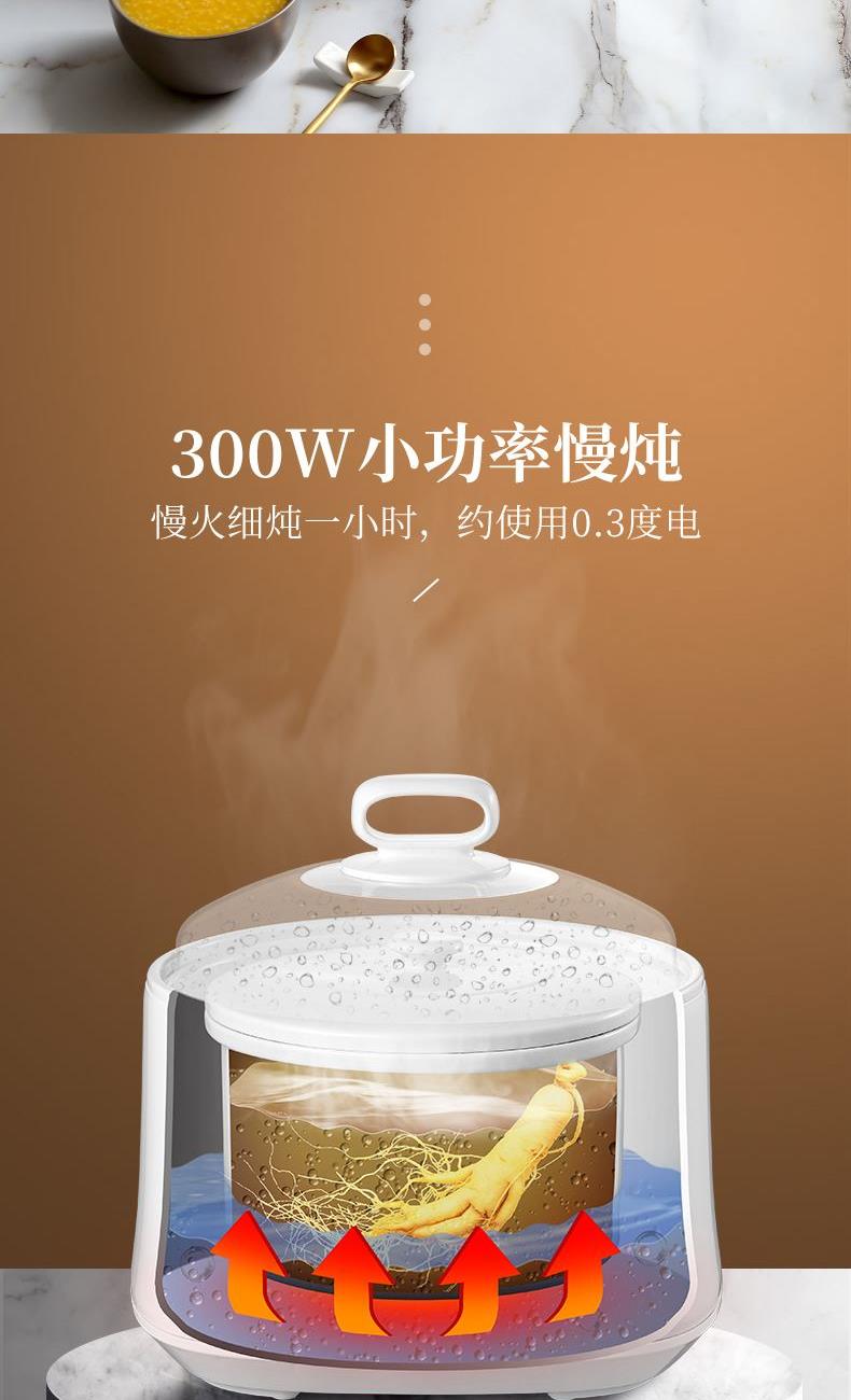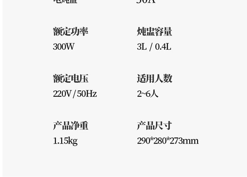 额定功率:300W 额定电压:220V/50Hz 产品净重:1.15kg 炖盅容量:3L/0.4L 适用人数:2~6人 产品尺寸:290*280*273mm 8 大滋补菜单 + 隔水精炖,喝出素颜好气色 3L 大容量,2~6 人家庭炖汤 / 蒸菜一锅搞定 24h 预约全自动,不用盯锅也能喝热汤 45℃长效保温,时刻喝到温热滋补靓汤 300W 小功率慢炖,省电不心疼 PTC 防烧干断电,缺水自动停,安全更安心 35dB 静音柔炖,炖汤不吵不扰家 分体式结构 + 宽提手,取出即洗防烫超省心 炖盅圆环手提,加水加料移动超方便 防溢凹槽设计,久煮不溢锅,省心无烦恼