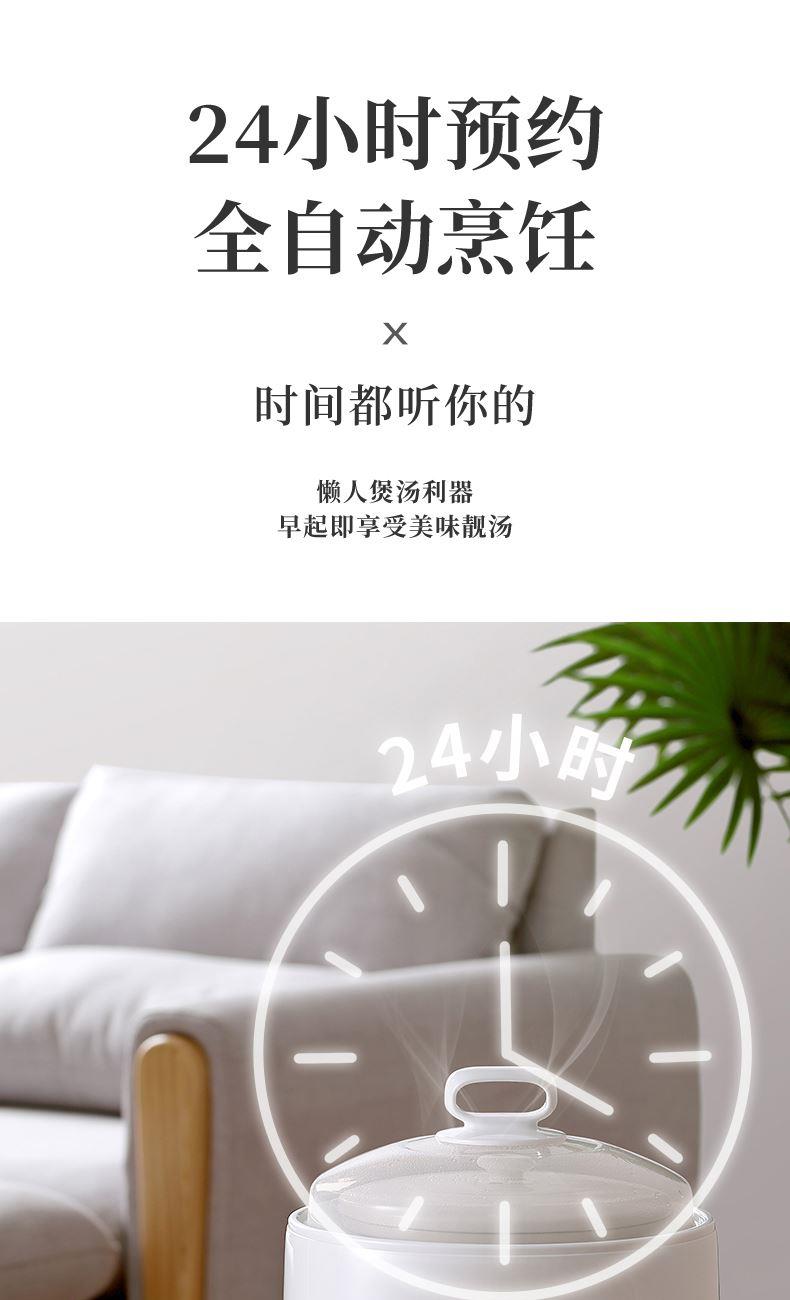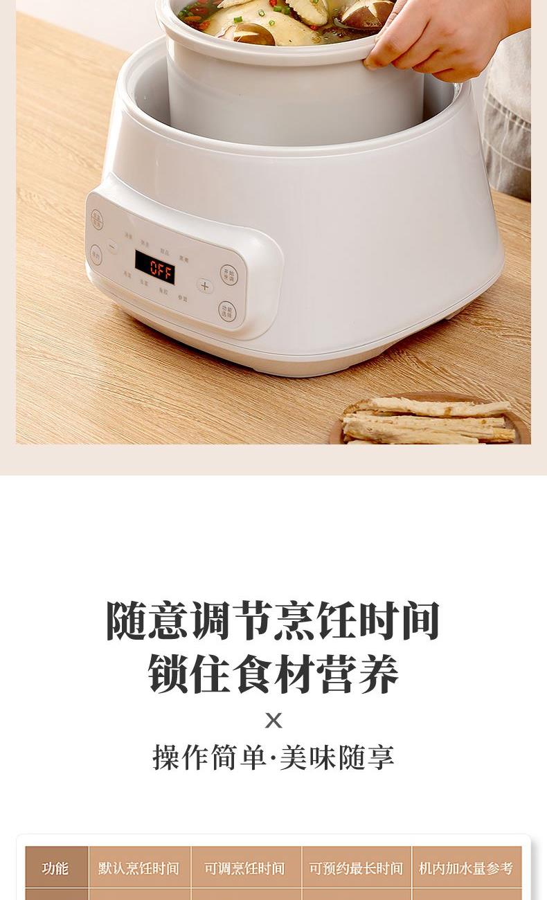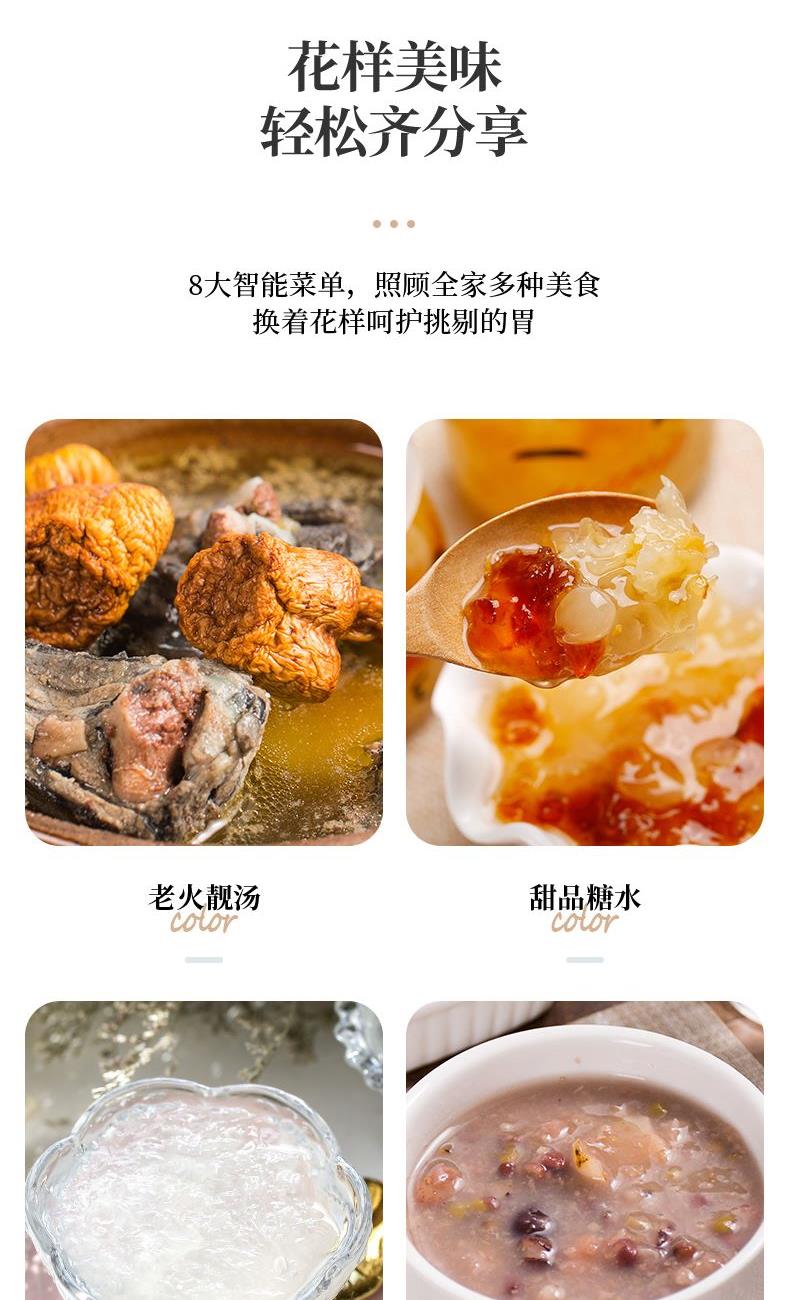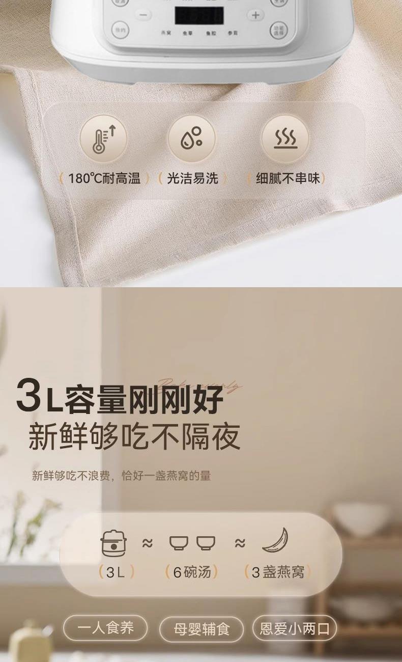 额定功率:300W 额定电压:220V/50Hz 产品净重:1.15kg 炖盅容量:3L/0.4L 适用人数:2~6人 产品尺寸:290*280*273mm 8 大滋补菜单 + 隔水精炖,喝出素颜好气色 3L 大容量,2~6 人家庭炖汤 / 蒸菜一锅搞定 24h 预约全自动,不用盯锅也能喝热汤 45℃长效保温,时刻喝到温热滋补靓汤 300W 小功率慢炖,省电不心疼 PTC 防烧干断电,缺水自动停,安全更安心 35dB 静音柔炖,炖汤不吵不扰家 分体式结构 + 宽提手,取出即洗防烫超省心 炖盅圆环手提,加水加料移动超方便 防溢凹槽设计,久煮不溢锅,省心无烦恼