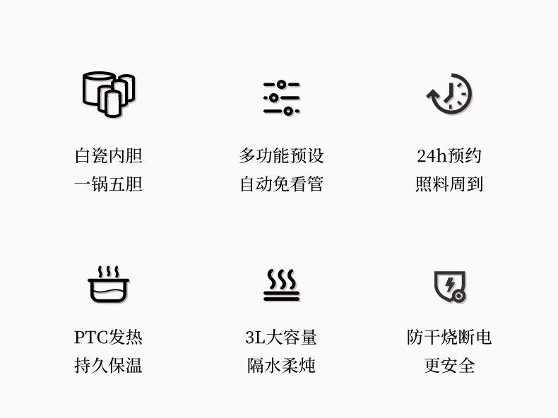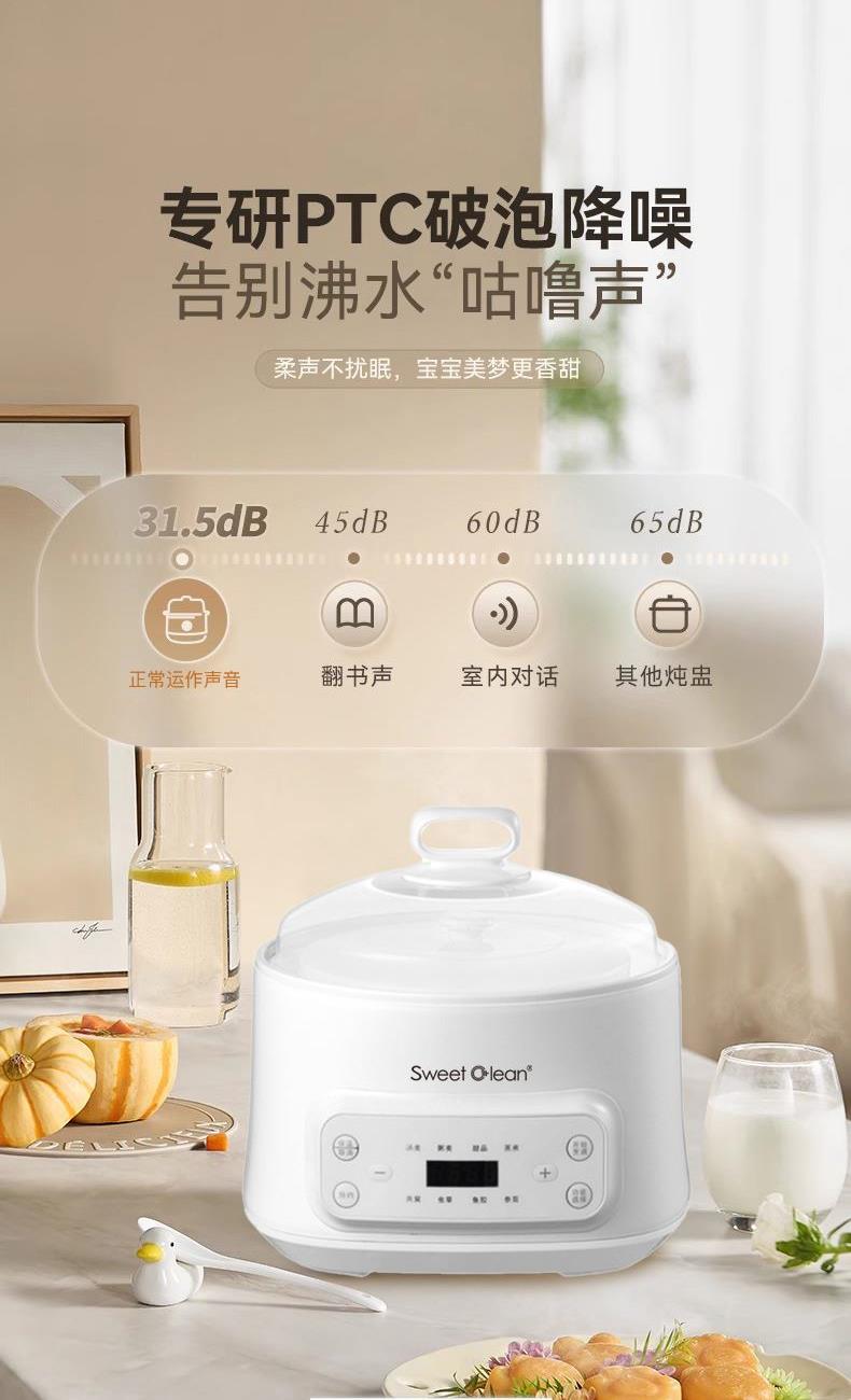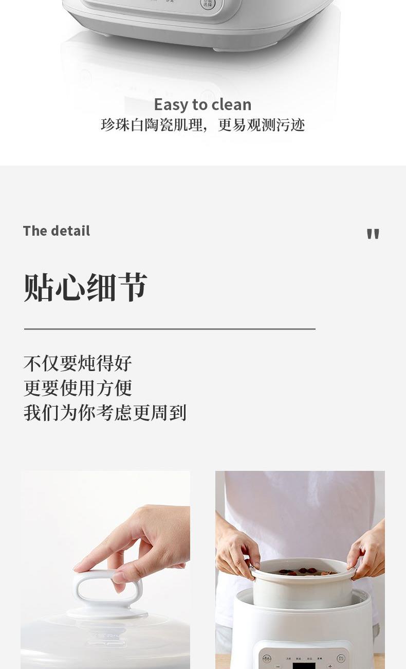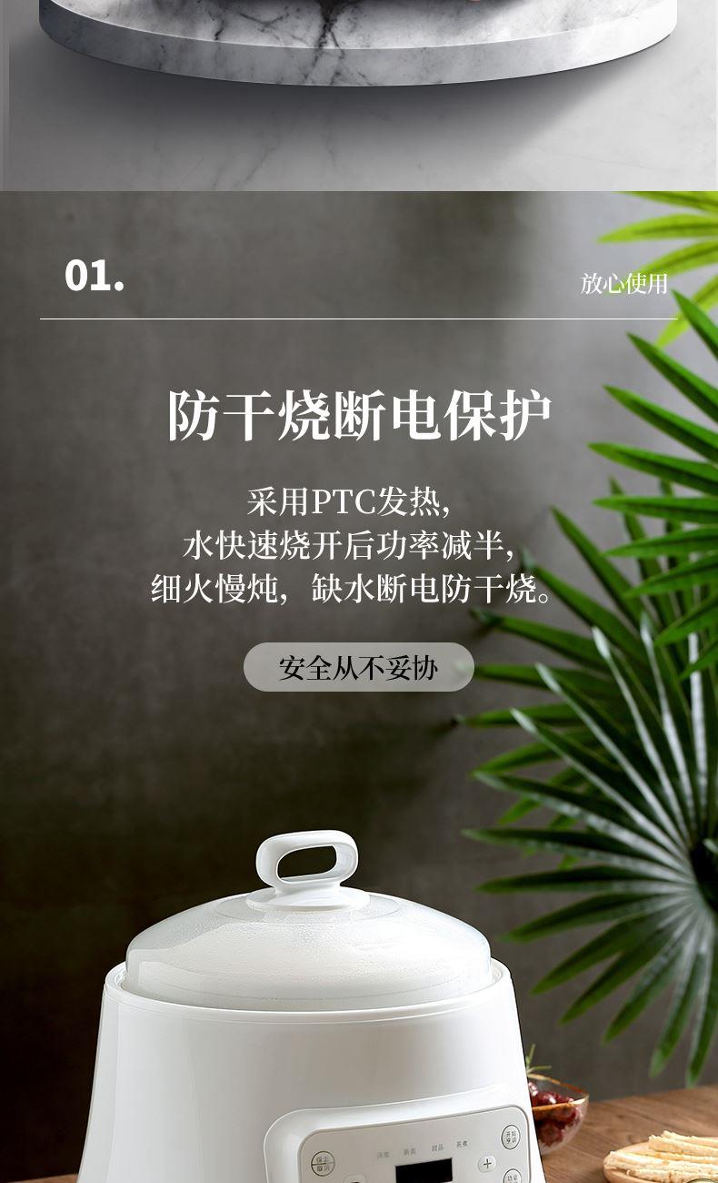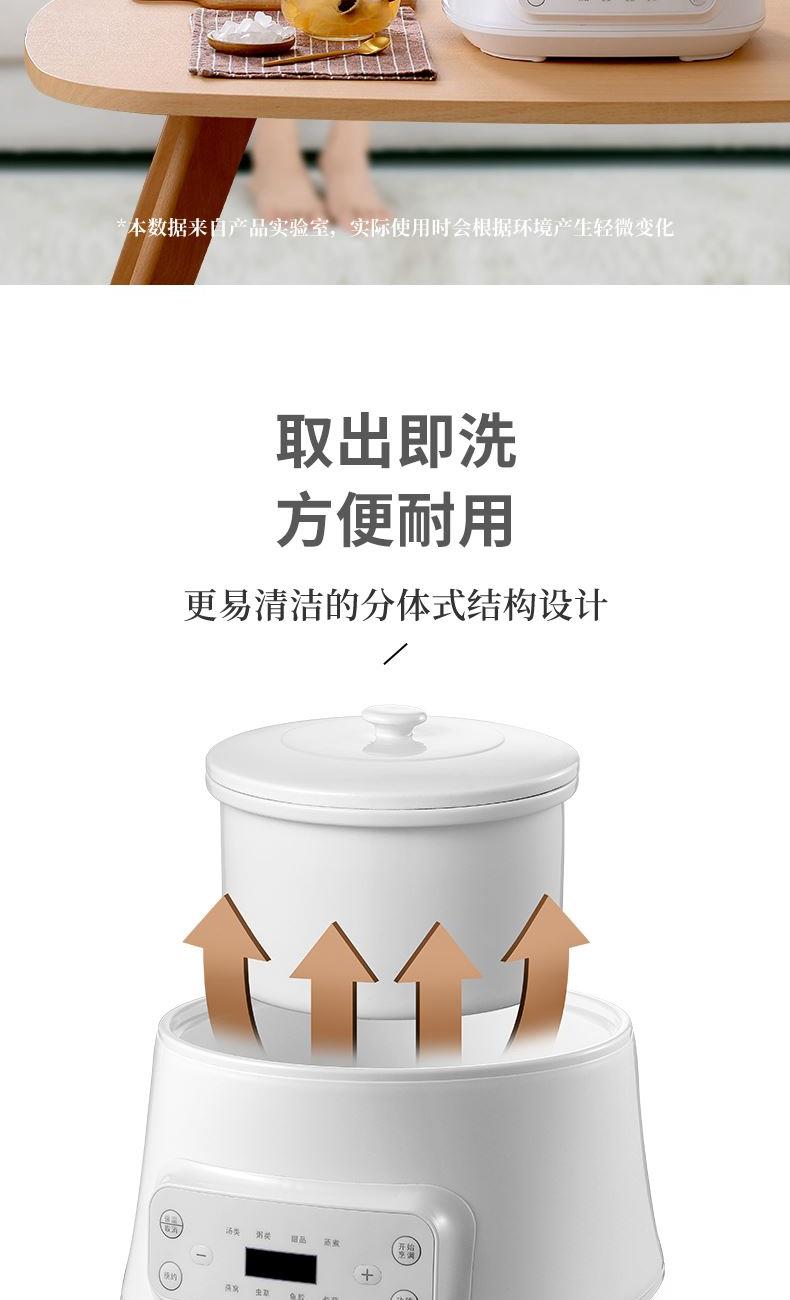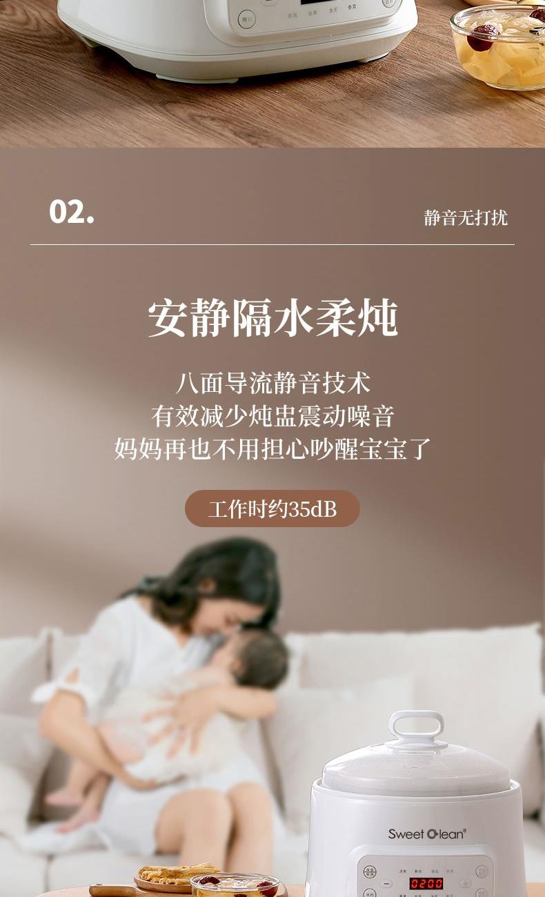 额定功率:300W 额定电压:220V/50Hz 产品净重:1.15kg 炖盅容量:3L/0.4L 适用人数:2~6人 产品尺寸:290*280*273mm 8 大滋补菜单 + 隔水精炖,喝出素颜好气色 3L 大容量,2~6 人家庭炖汤 / 蒸菜一锅搞定 24h 预约全自动,不用盯锅也能喝热汤 45℃长效保温,时刻喝到温热滋补靓汤 300W 小功率慢炖,省电不心疼 PTC 防烧干断电,缺水自动停,安全更安心 35dB 静音柔炖,炖汤不吵不扰家 分体式结构 + 宽提手,取出即洗防烫超省心 炖盅圆环手提,加水加料移动超方便 防溢凹槽设计,久煮不溢锅,省心无烦恼
