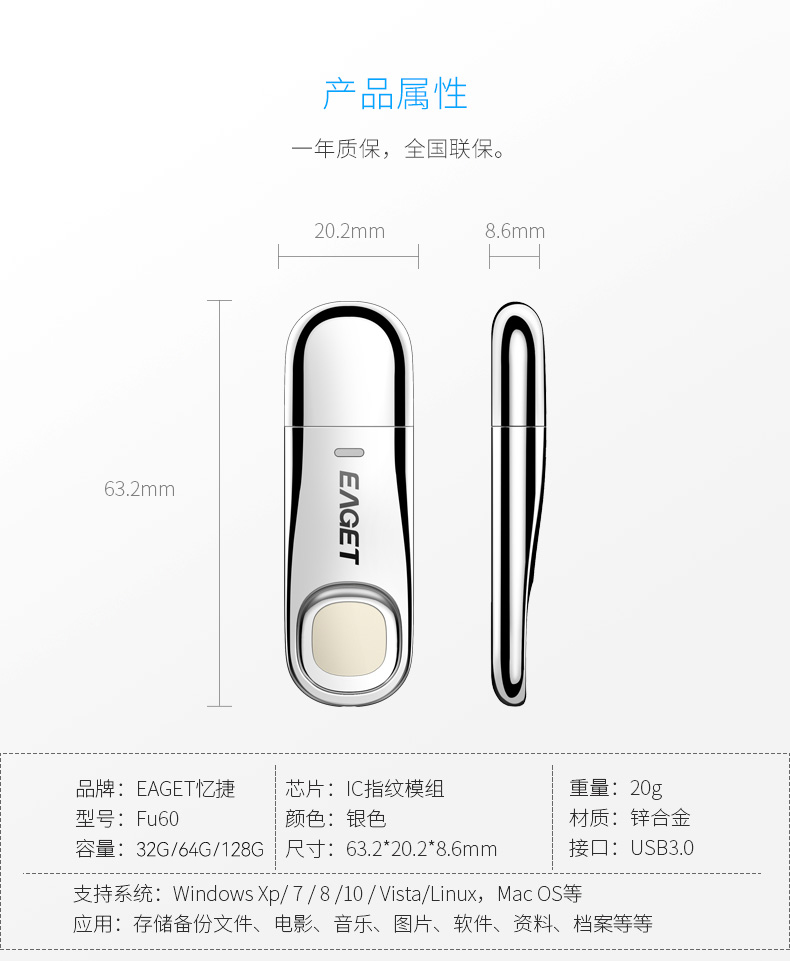 USB3.0接口 采用AES256加密算法,360度指纹识别。 快准识别,即插即用。 防刮防磨,银色金属效果,美观大气 专属礼盒包装,送礼佳品。 产品尺寸:63.2*20.2*8.6mm 包装尺寸:135*80*30mm 单品重量:20g