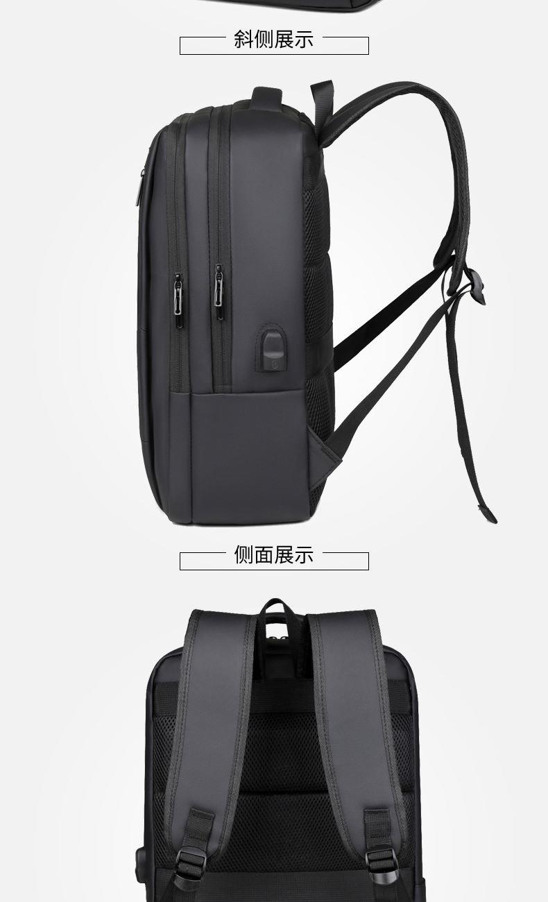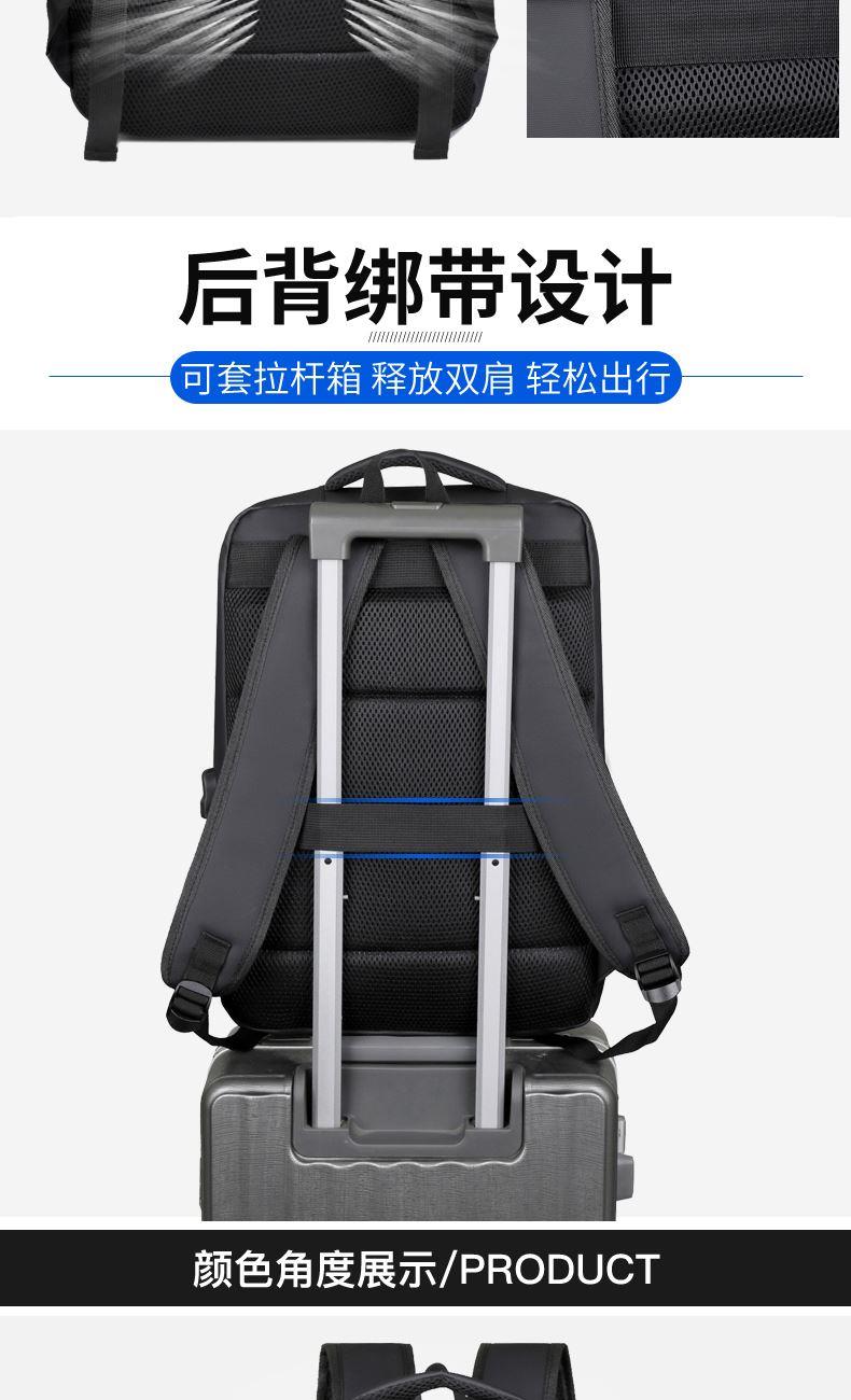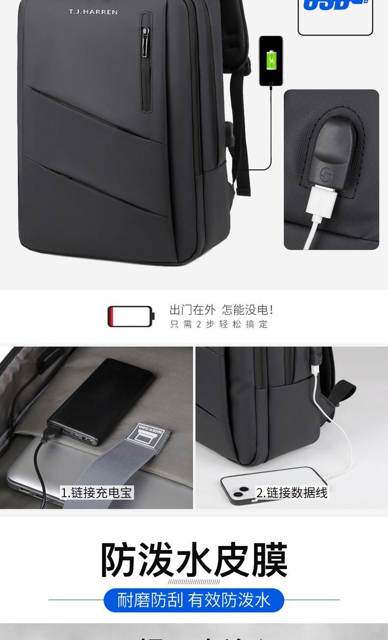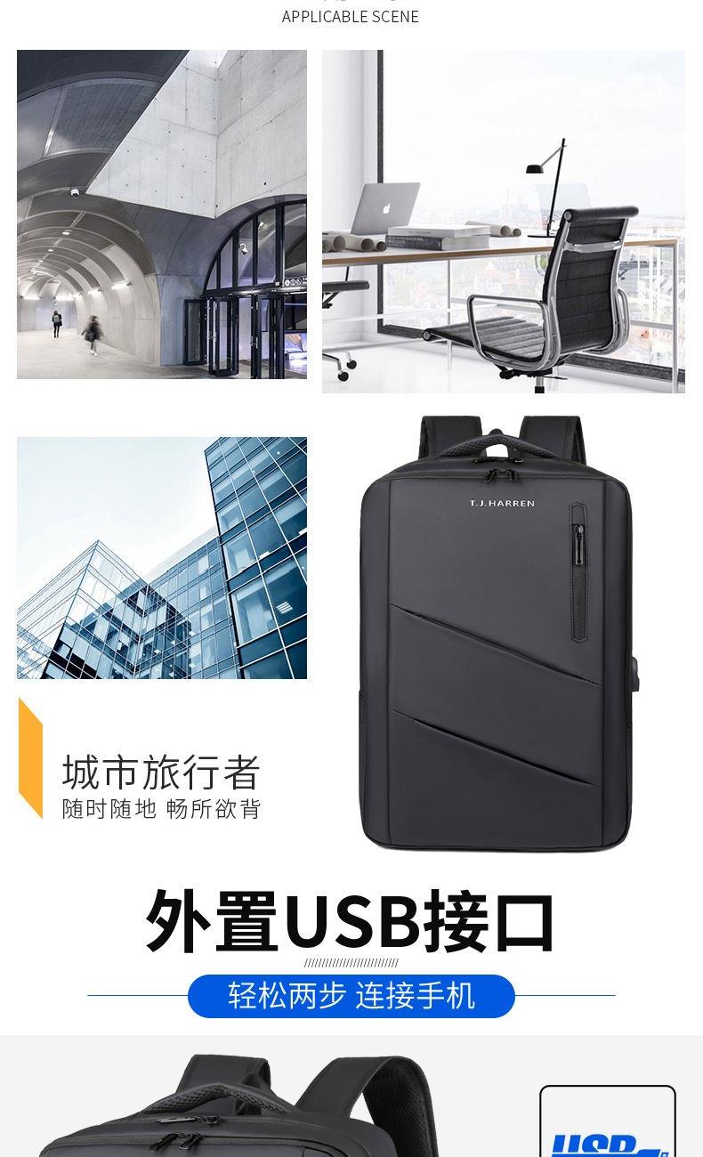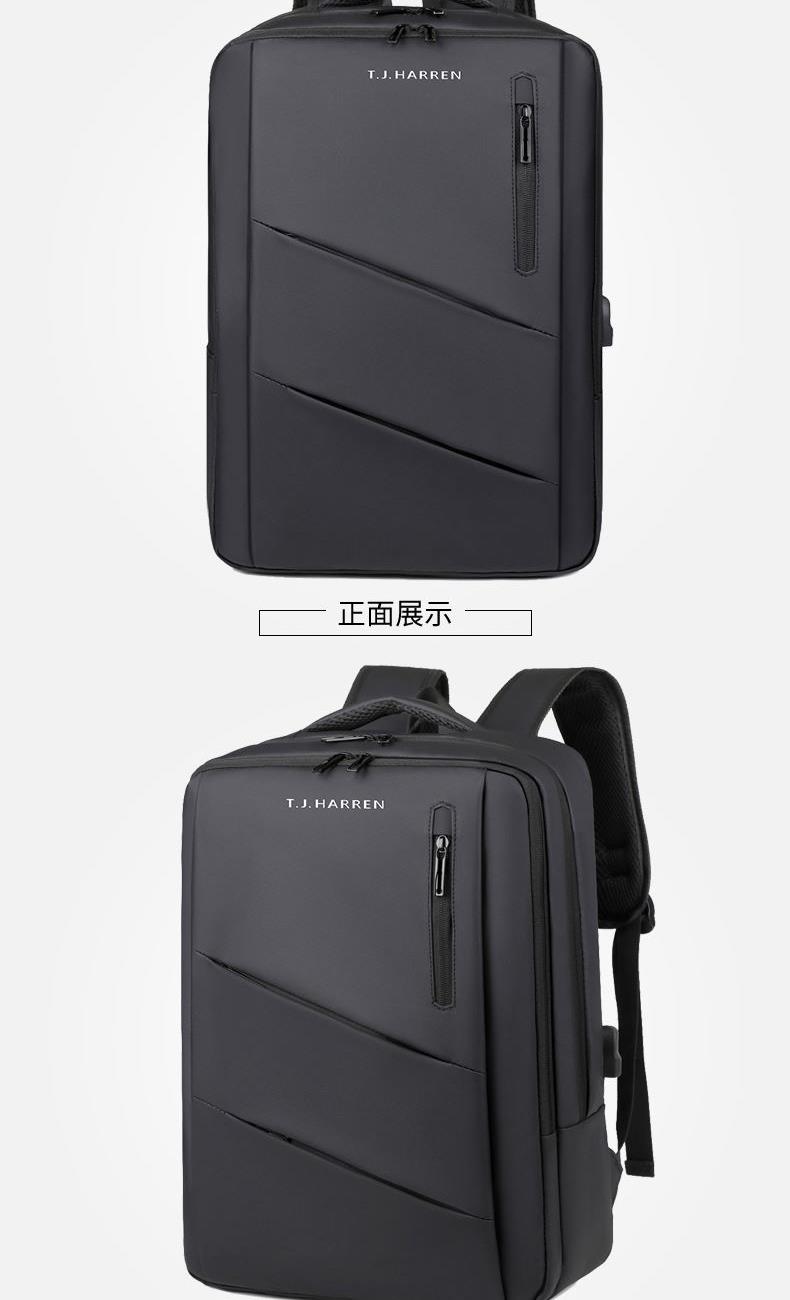型号:TJ8504 颜色:黑色 尺寸:约45*32*15CM 容量:约21L 面料:柔性防水皮膜织物 里料:织物 重量:约0.7KG 等级:一等合格品 执行标准:QB/T 1333-2018 产品特点: 1、新款多功能设计,时尚大方,旅行休闲商务三用;2、柔性防水皮膜面料,一擦即干,轻松打理;3、多隔层结构,分区合理,轻松收纳;4、双主袋共约21L大容量,装的更多;5、独立加棉加厚电脑隔层袋,可放置15.6寸电脑;6、3个前置拉链袋加1个侧袋,放置贴身物品;7、带USB充电接口,充电更方便;8、多个内置物袋,方便收纳放置更多小物件;9、拉杆固定束带设计,解放双手;10、透气背负系统,配合加大加厚提手与肩带,可背可提、透气干爽,舒适减压出行;11、支持客户定制。