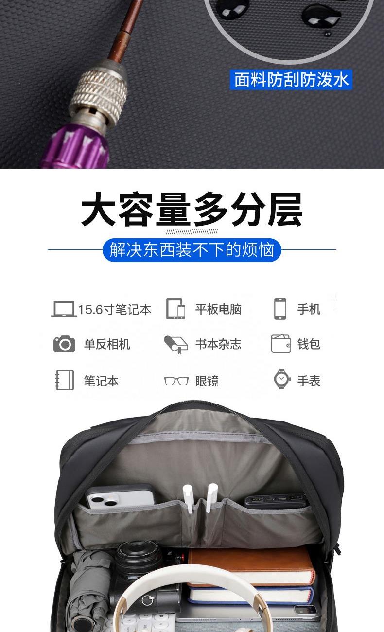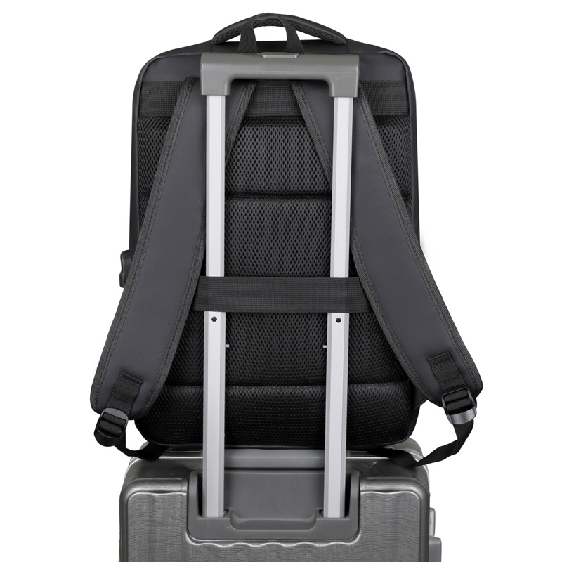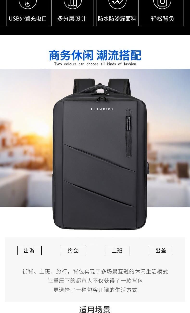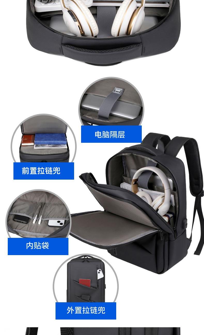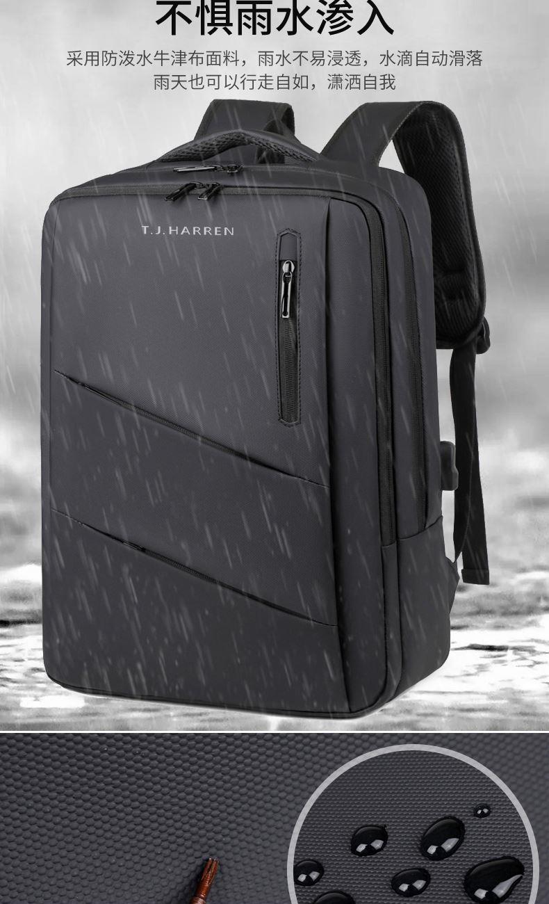 型号:TJ8504 颜色:黑色 尺寸:约45*32*15CM 容量:约21L 面料:柔性防水皮膜织物 里料:织物 重量:约0.7KG 等级:一等合格品 执行标准:QB/T 1333-2018 产品特点: 1、新款多功能设计,时尚大方,旅行休闲商务三用;2、柔性防水皮膜面料,一擦即干,轻松打理;3、多隔层结构,分区合理,轻松收纳;4、双主袋共约21L大容量,装的更多;5、独立加棉加厚电脑隔层袋,可放置15.6寸电脑;6、3个前置拉链袋加1个侧袋,放置贴身物品;7、带USB充电接口,充电更方便;8、多个内置物袋,方便收纳放置更多小物件;9、拉杆固定束带设计,解放双手;10、透气背负系统,配合加大加厚提手与肩带,可背可提、透气干爽,舒适减压出行;11、支持客户定制。