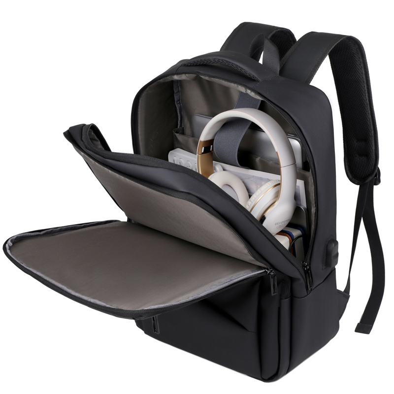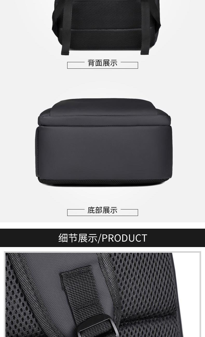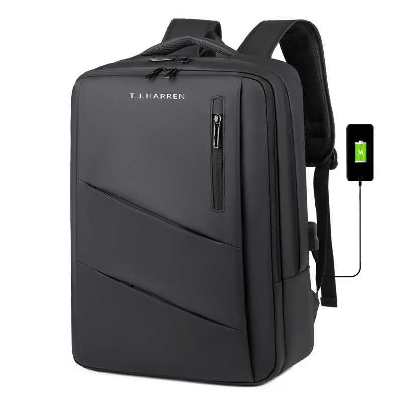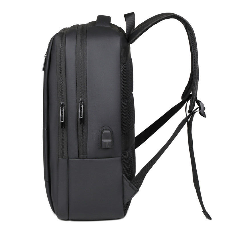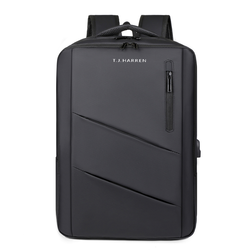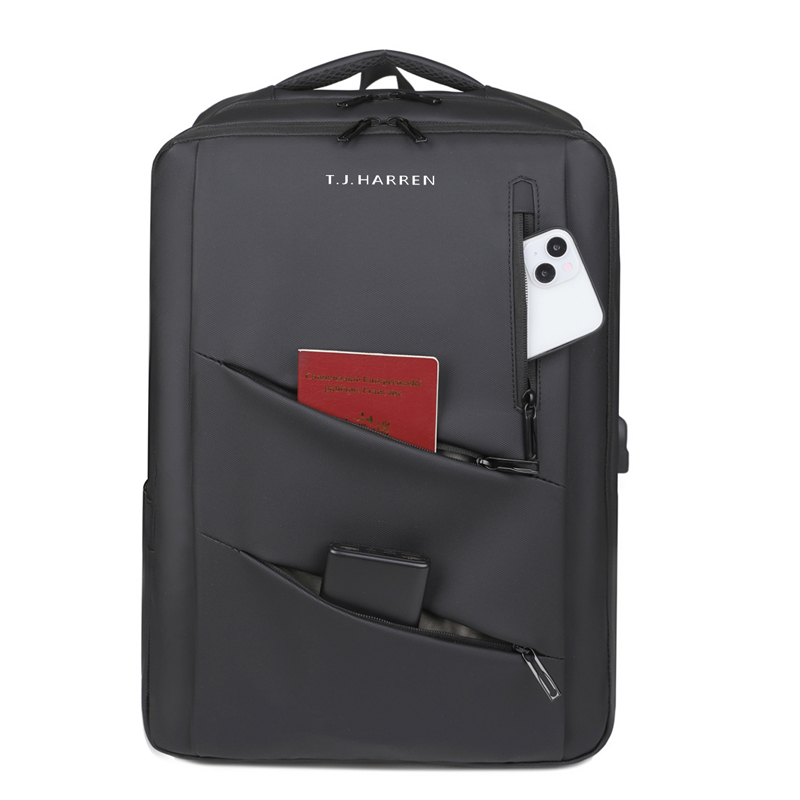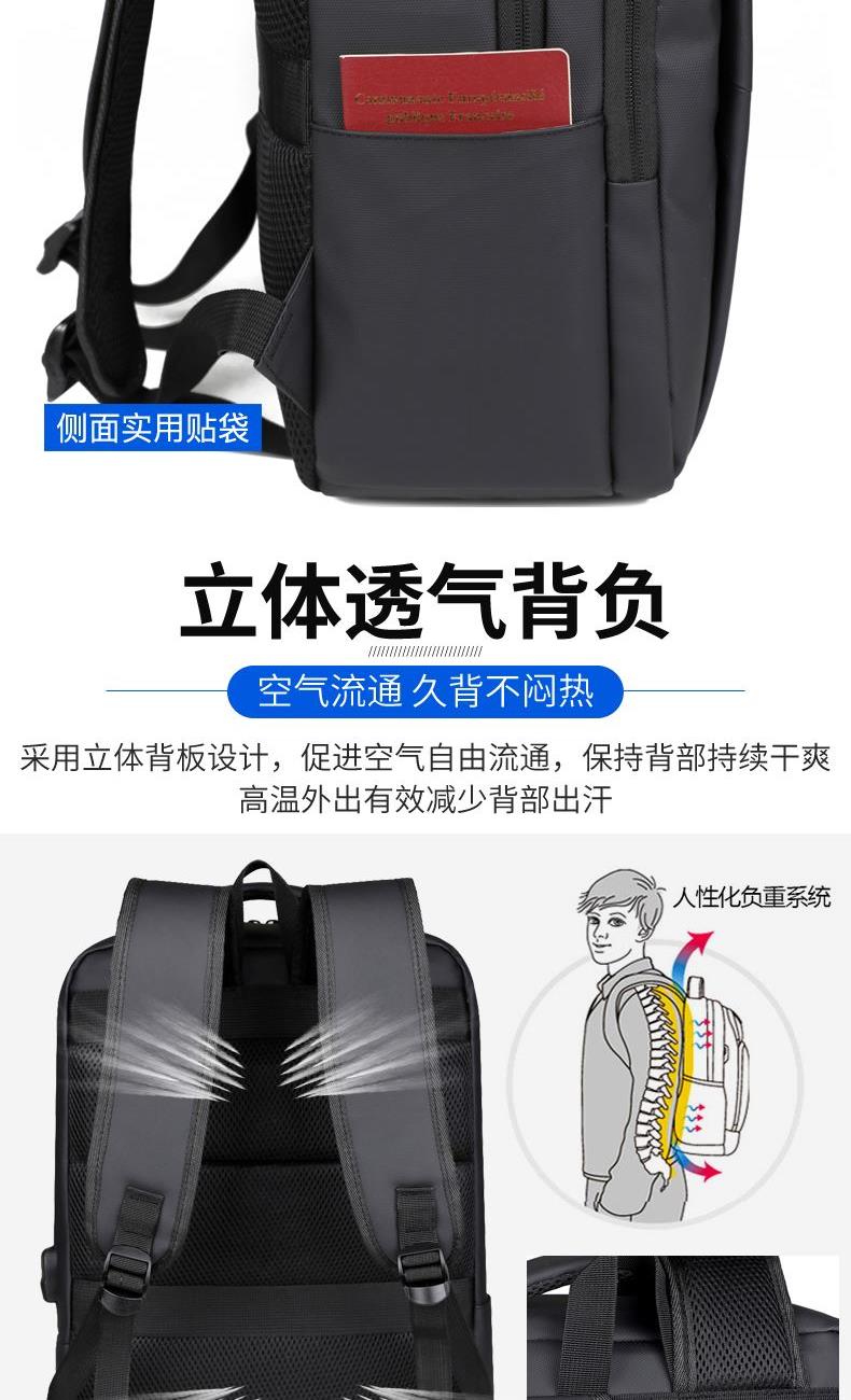 型号:TJ8504 颜色:黑色 尺寸:约45*32*15CM 容量:约21L 面料:柔性防水皮膜织物 里料:织物 重量:约0.7KG 等级:一等合格品 执行标准:QB/T 1333-2018 产品特点: 1、新款多功能设计,时尚大方,旅行休闲商务三用;2、柔性防水皮膜面料,一擦即干,轻松打理;3、多隔层结构,分区合理,轻松收纳;4、双主袋共约21L大容量,装的更多;5、独立加棉加厚电脑隔层袋,可放置15.6寸电脑;6、3个前置拉链袋加1个侧袋,放置贴身物品;7、带USB充电接口,充电更方便;8、多个内置物袋,方便收纳放置更多小物件;9、拉杆固定束带设计,解放双手;10、透气背负系统,配合加大加厚提手与肩带,可背可提、透气干爽,舒适减压出行;11、支持客户定制。