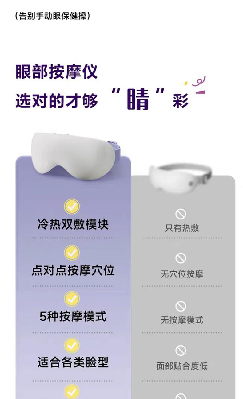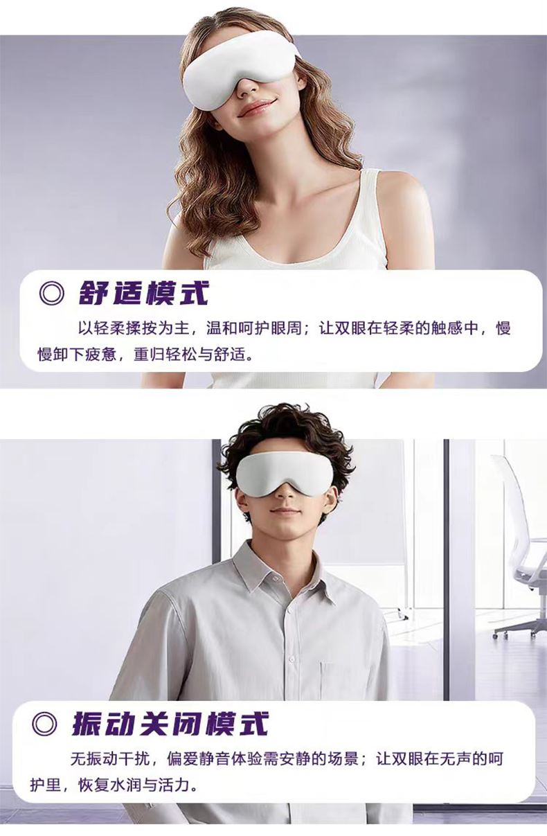 - 轻盈便携,随地“充电”:重量比手机还轻,折叠起来塞进包里毫无压力。办公室午休、差旅途中、追剧间隙都能戴,再也不用专门抽时间去做眼部SPA。