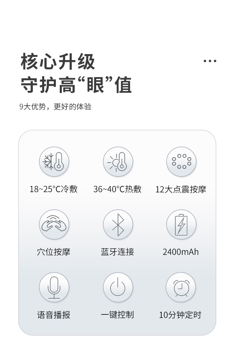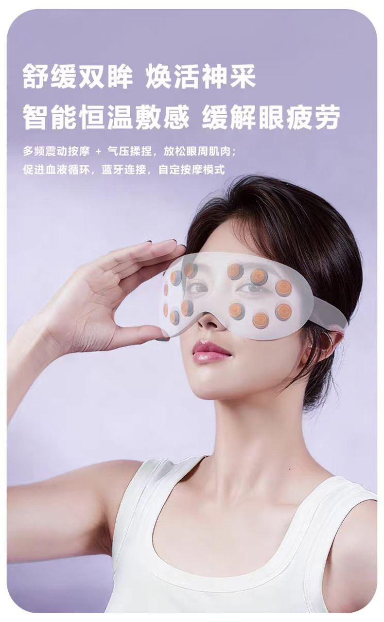 - 律动点震按摩,按准穴位才有效:内置智能震动芯片,对准太阳穴、睛明穴等6大眼部穴位,不是乱震一通的“震动棒”,是模仿人工按摩的韵律感,酥酥麻麻的力道刚好,紧绷的眼周肌肉瞬间放松。