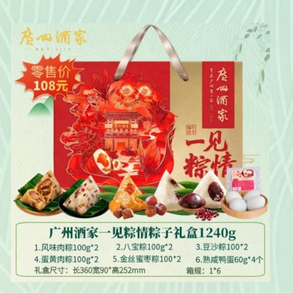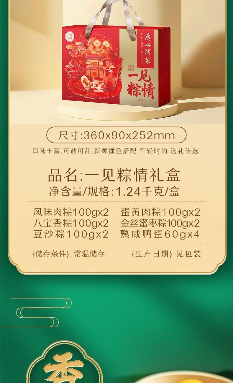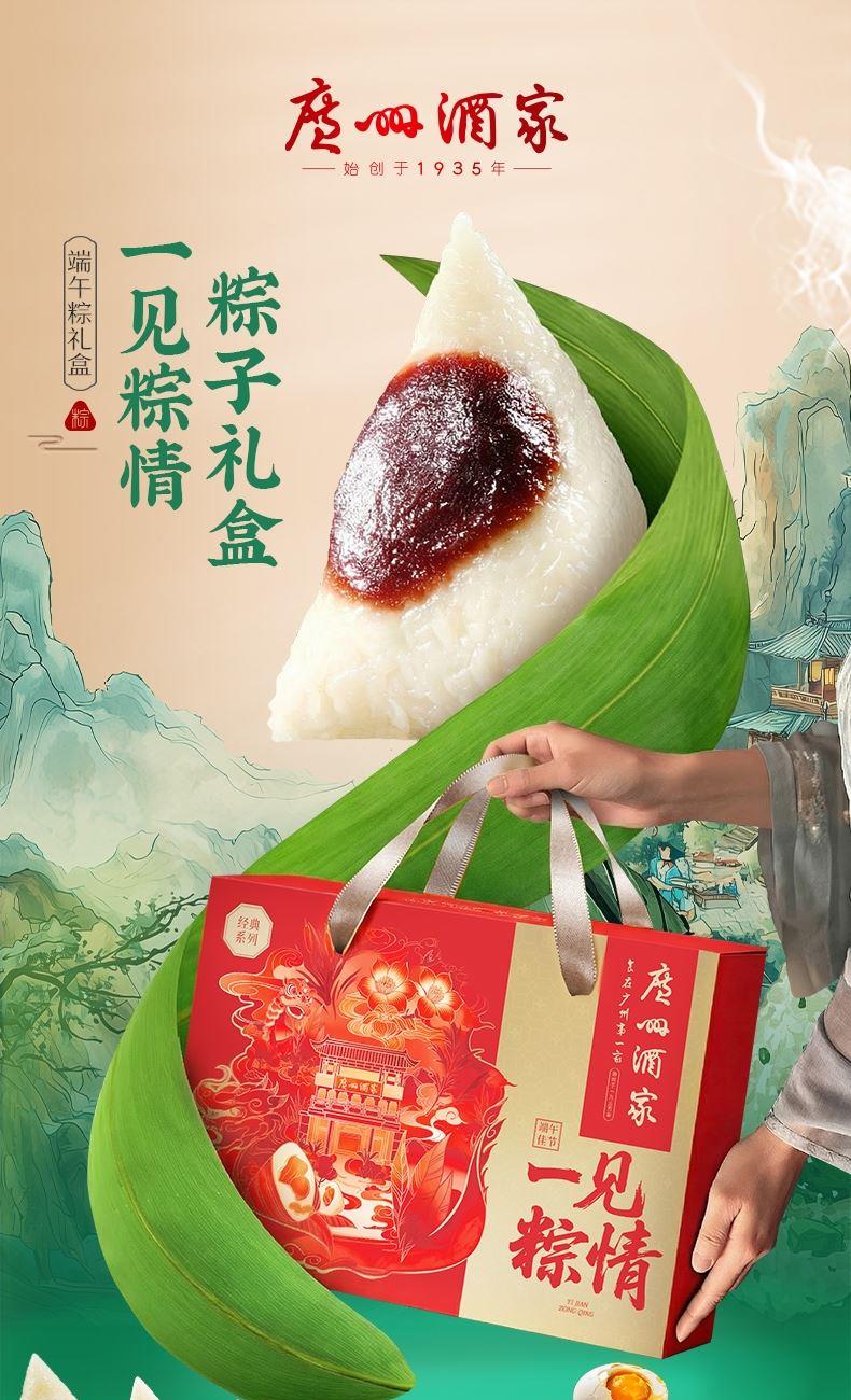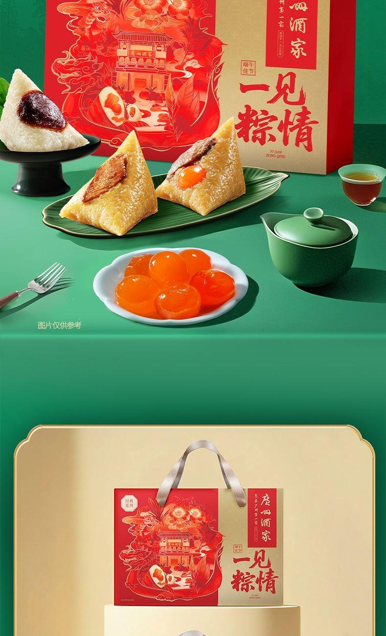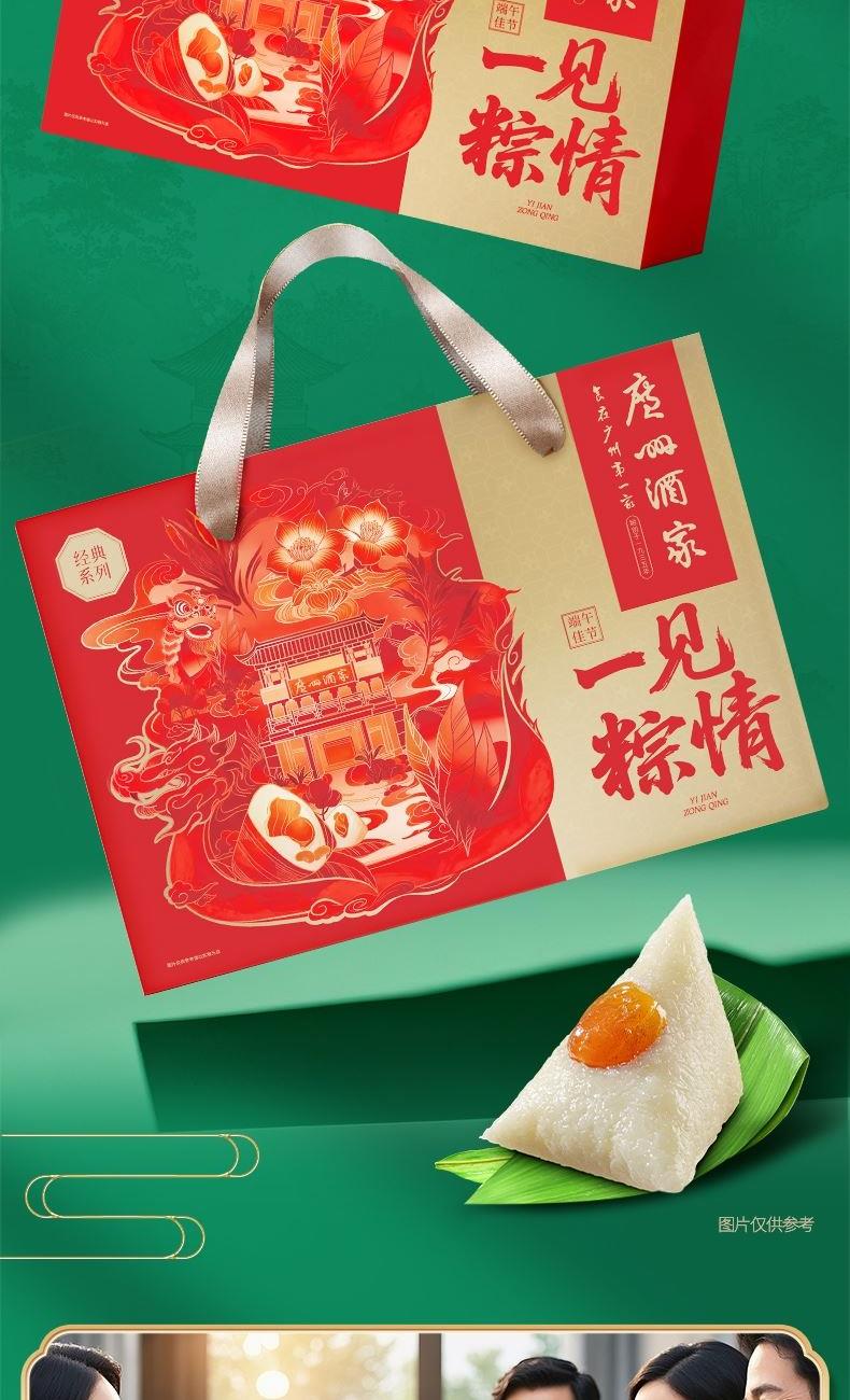 广州酒家"一见粽情"礼盒汇聚六味经典——风味肉粽、蛋黄肉粽、八宝香粽、金丝蜜枣粽、豆沙粽各100g×2,搭配熟咸鸭蛋60g×4,咸甜兼备、荤素相宜,以近九十年匠心工艺呈现正宗广府风味,满足家庭分享与礼赠多元场景。
