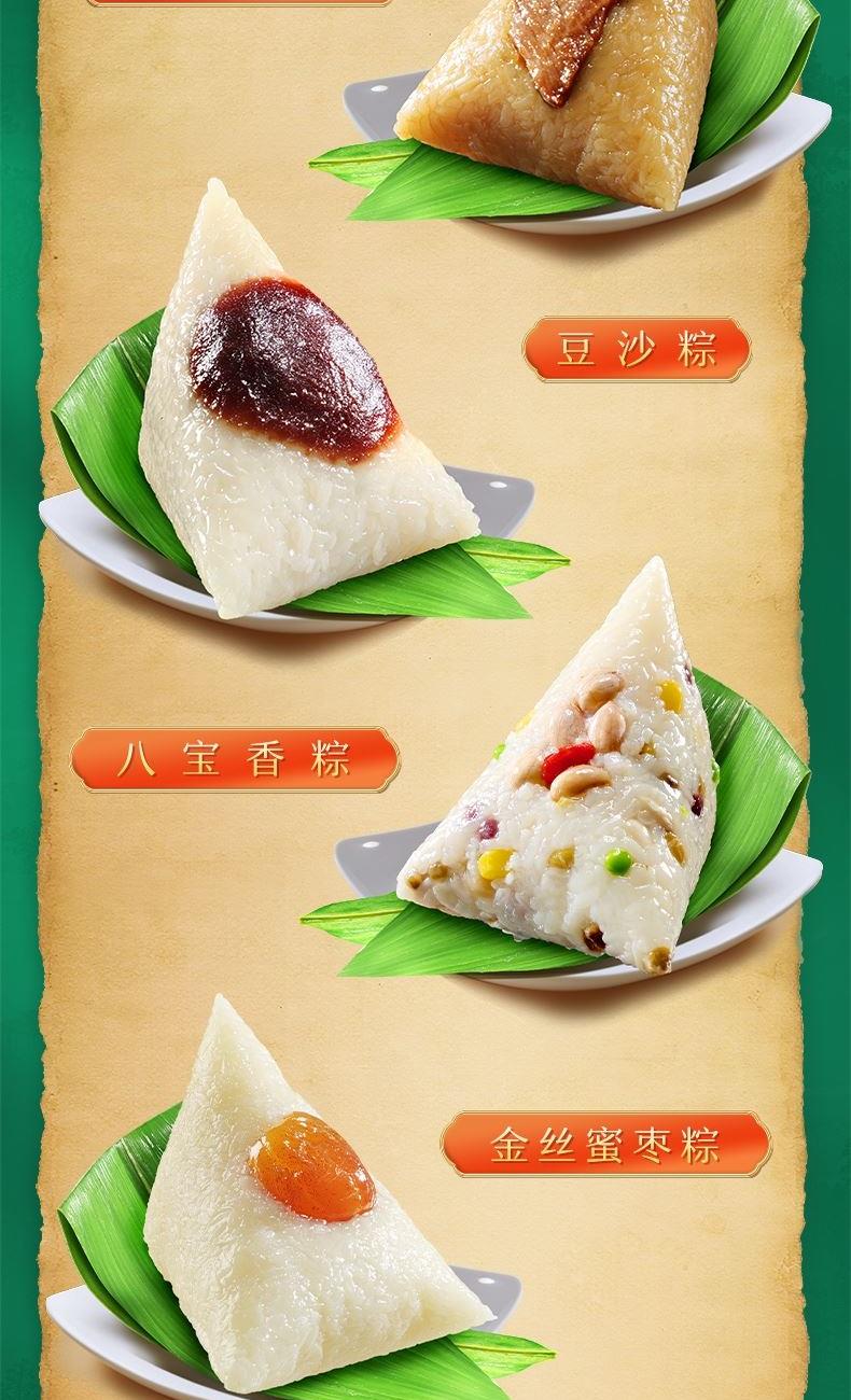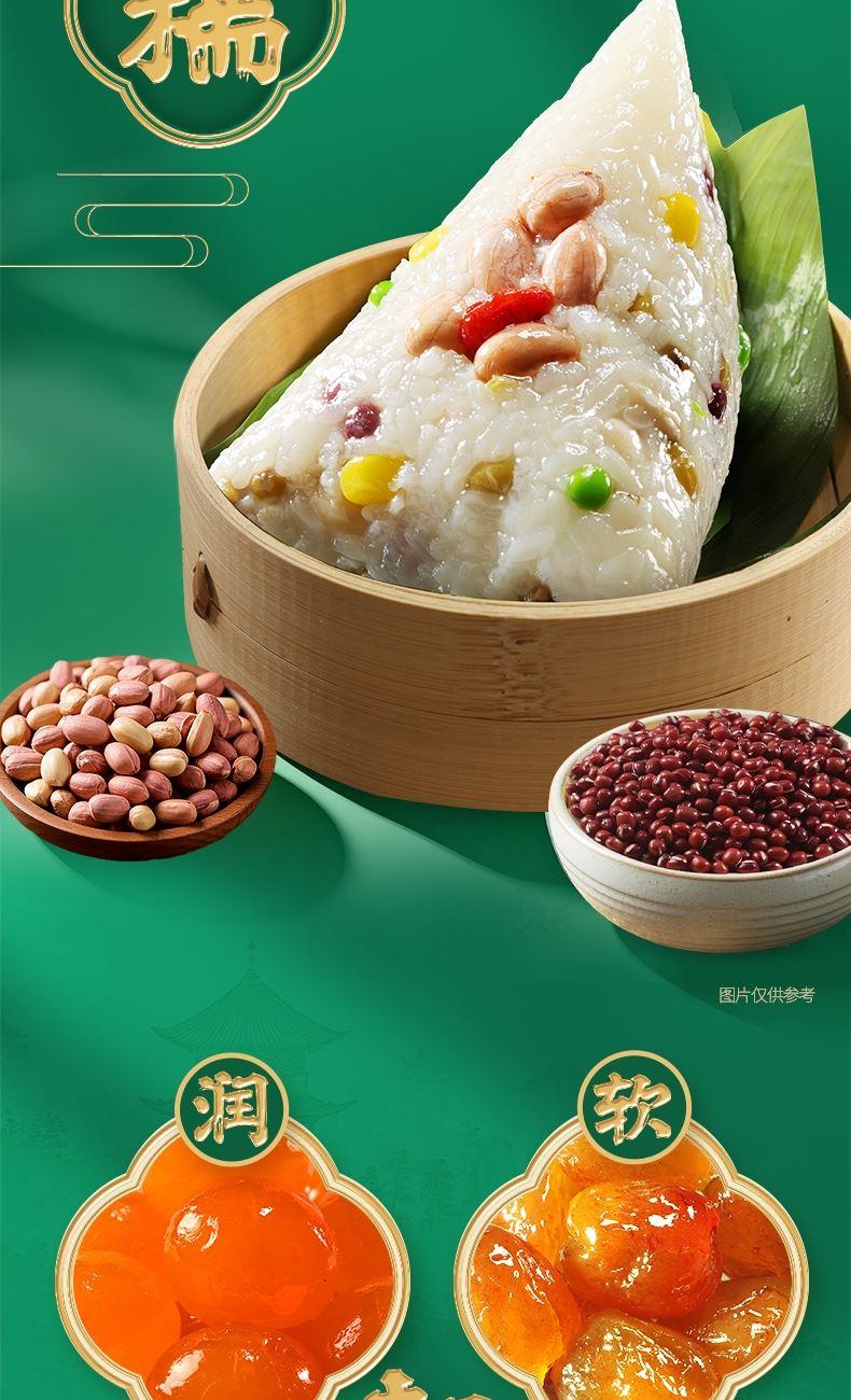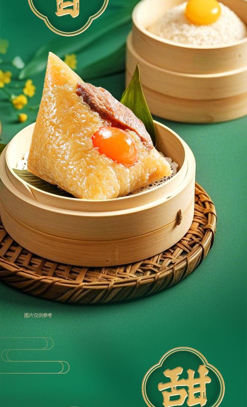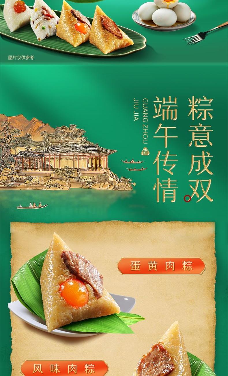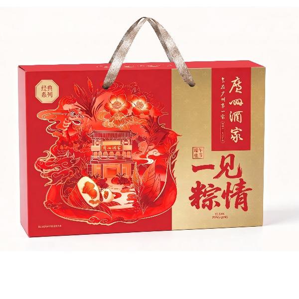 广州酒家"一见粽情"礼盒汇聚六味经典——风味肉粽、蛋黄肉粽、八宝香粽、金丝蜜枣粽、豆沙粽各100g×2,搭配熟咸鸭蛋60g×4,咸甜兼备、荤素相宜,以近九十年匠心工艺呈现正宗广府风味,满足家庭分享与礼赠多元场景。