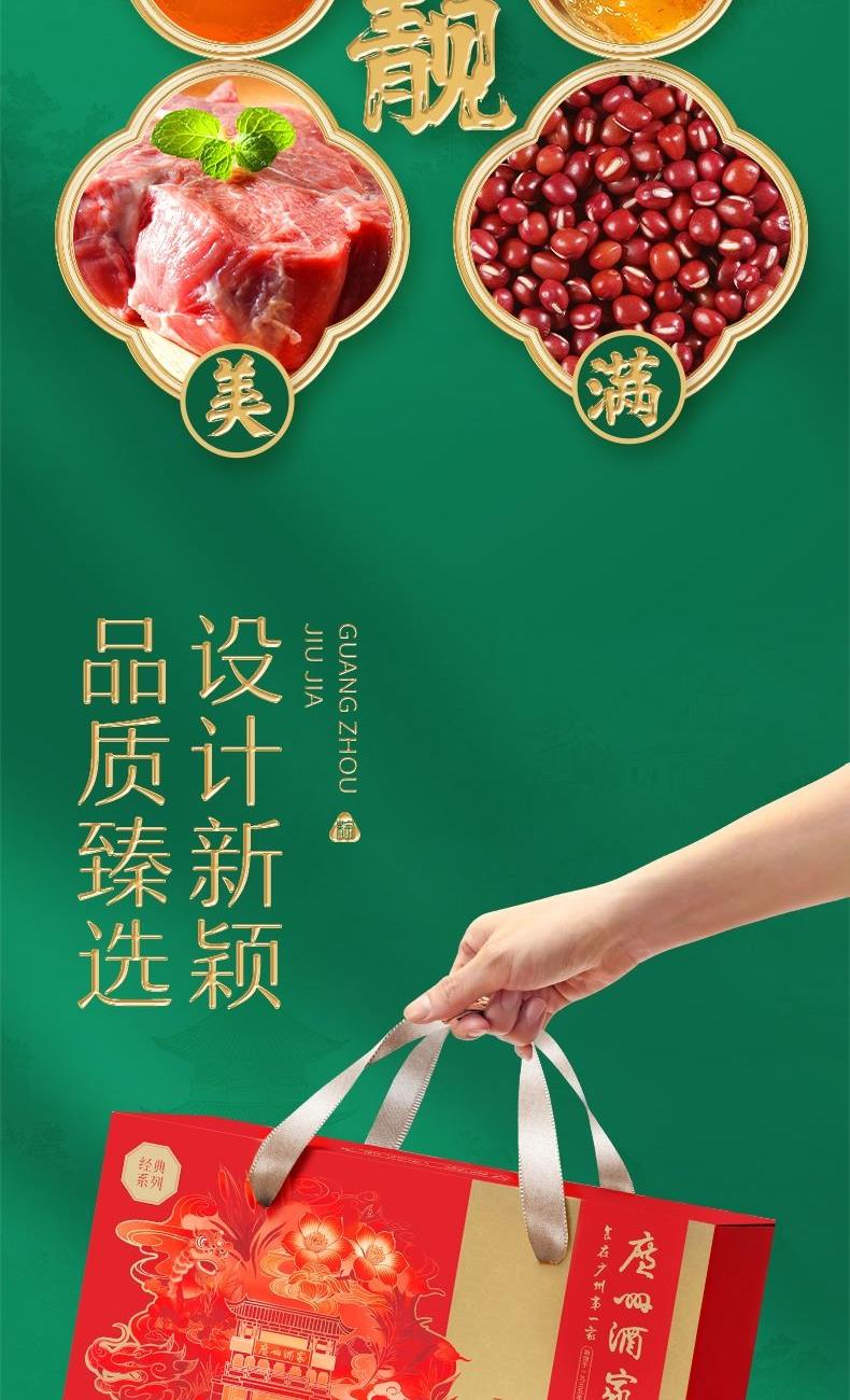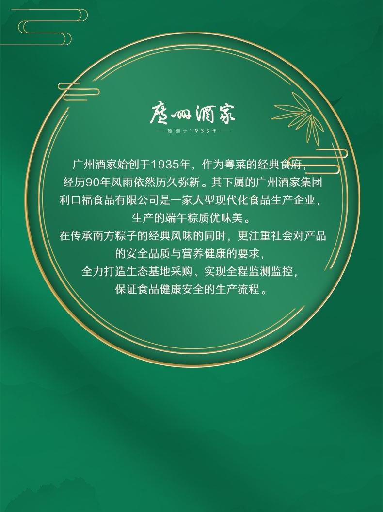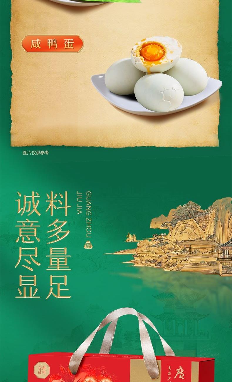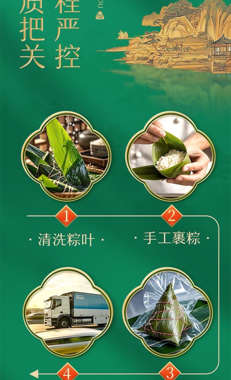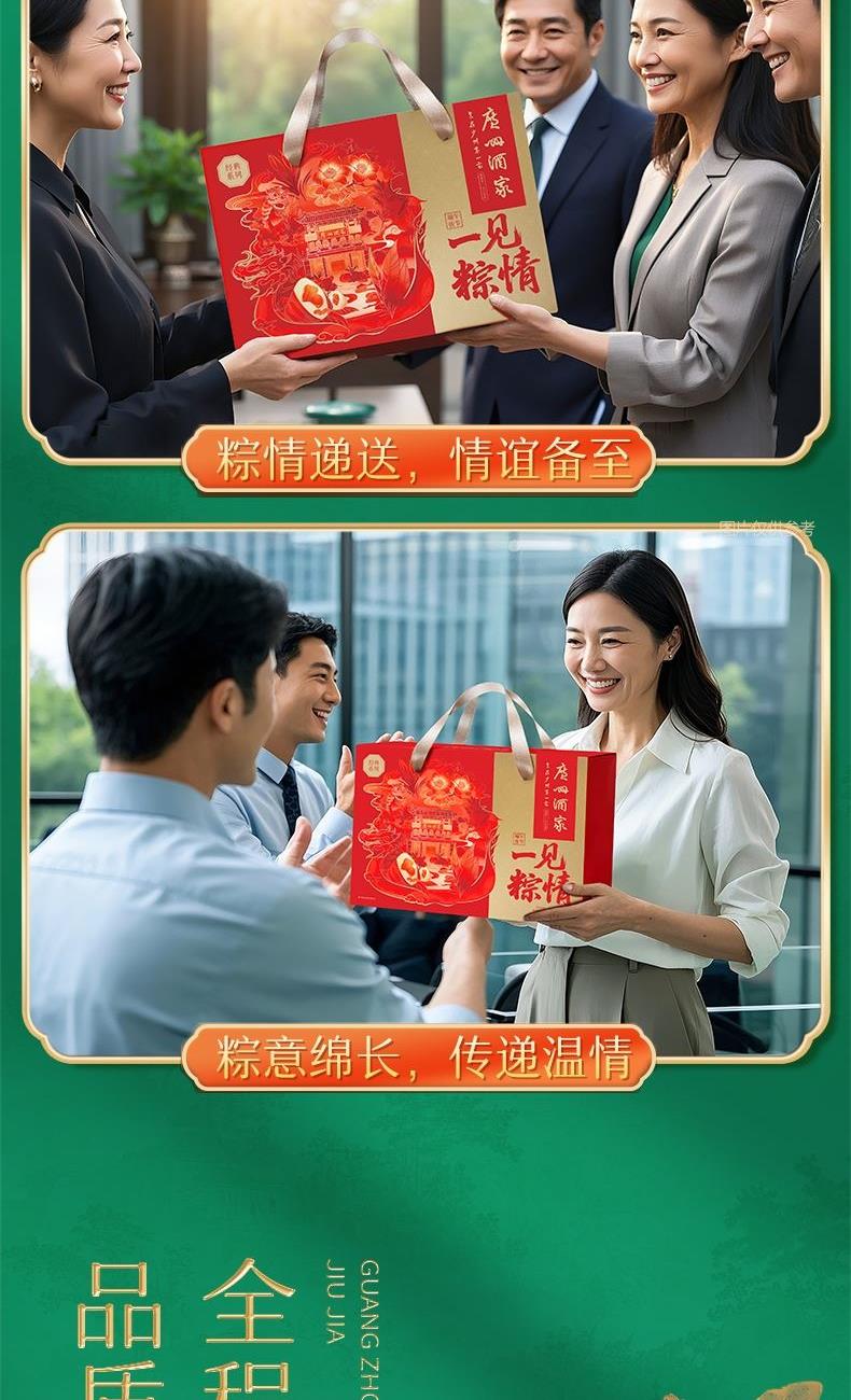 广州酒家"一见粽情"礼盒汇聚六味经典——风味肉粽、蛋黄肉粽、八宝香粽、金丝蜜枣粽、豆沙粽各100g×2,搭配熟咸鸭蛋60g×4,咸甜兼备、荤素相宜,以近九十年匠心工艺呈现正宗广府风味,满足家庭分享与礼赠多元场景。