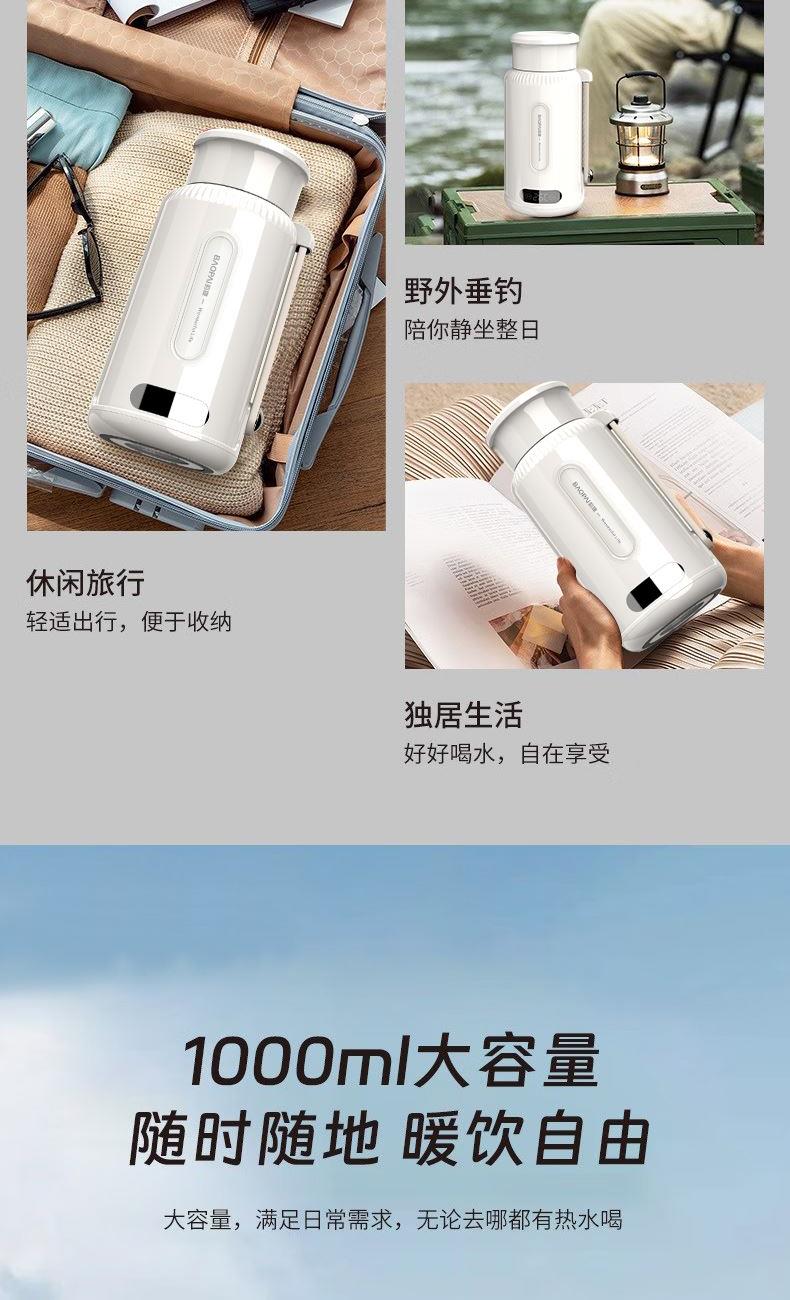 一杯双盖,烧水盖、直饮盖二合一 1000ml容量,满足出行所需 800W大功率,6分钟快速煮水 316不锈钢内胆,健康安全 NTC智能温控,六段调温 加宽提手设计,携带方便、省力 产品材质:PC+ABS+PP+316不锈钢 额定功率:800W 额定容量:1.0L 额定电压:220V~50Hz 产品重量:1.28kg 产品尺寸:130*120*255(mm) 包装尺寸:163*163*280(mm) 箱/数量:16台 外箱尺寸:727*361*615(mm)