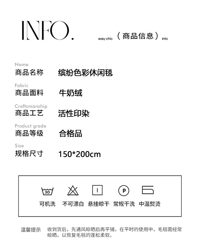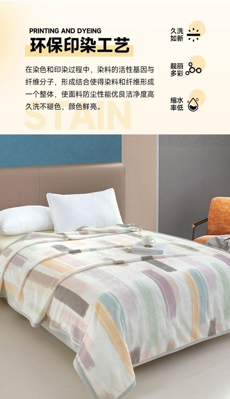 规格:150*200cm 面料:牛奶绒 克重:1000g 产品包装:精美礼盒 包装尺寸:48*35*16cm 特点:牛奶绒面料,充分吸收汗气蒸发产生的热量, 舒适透气,精美大方,绒感细腻,呵护您娇嫩 肌肤新型植绒技术,绒毛结构丰盈紧实,不 易掉毛告别掉毛烦恼。