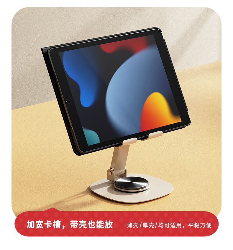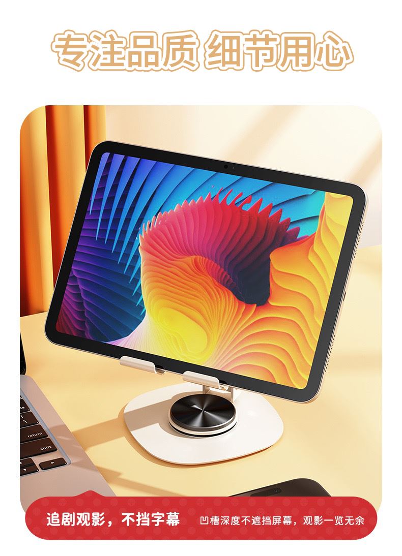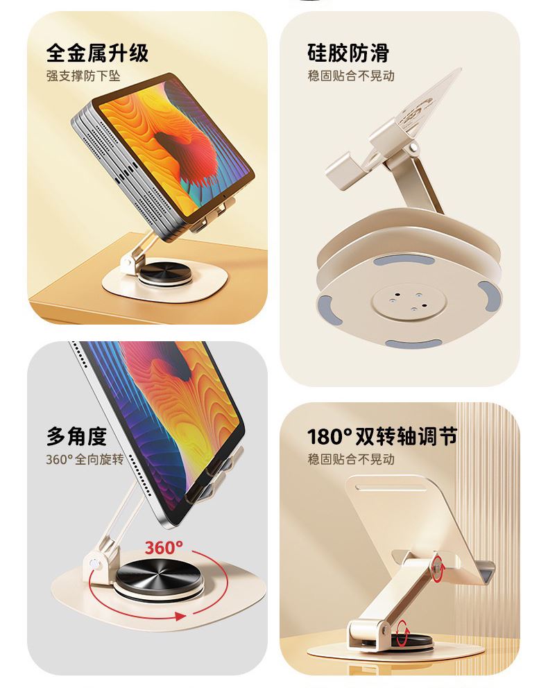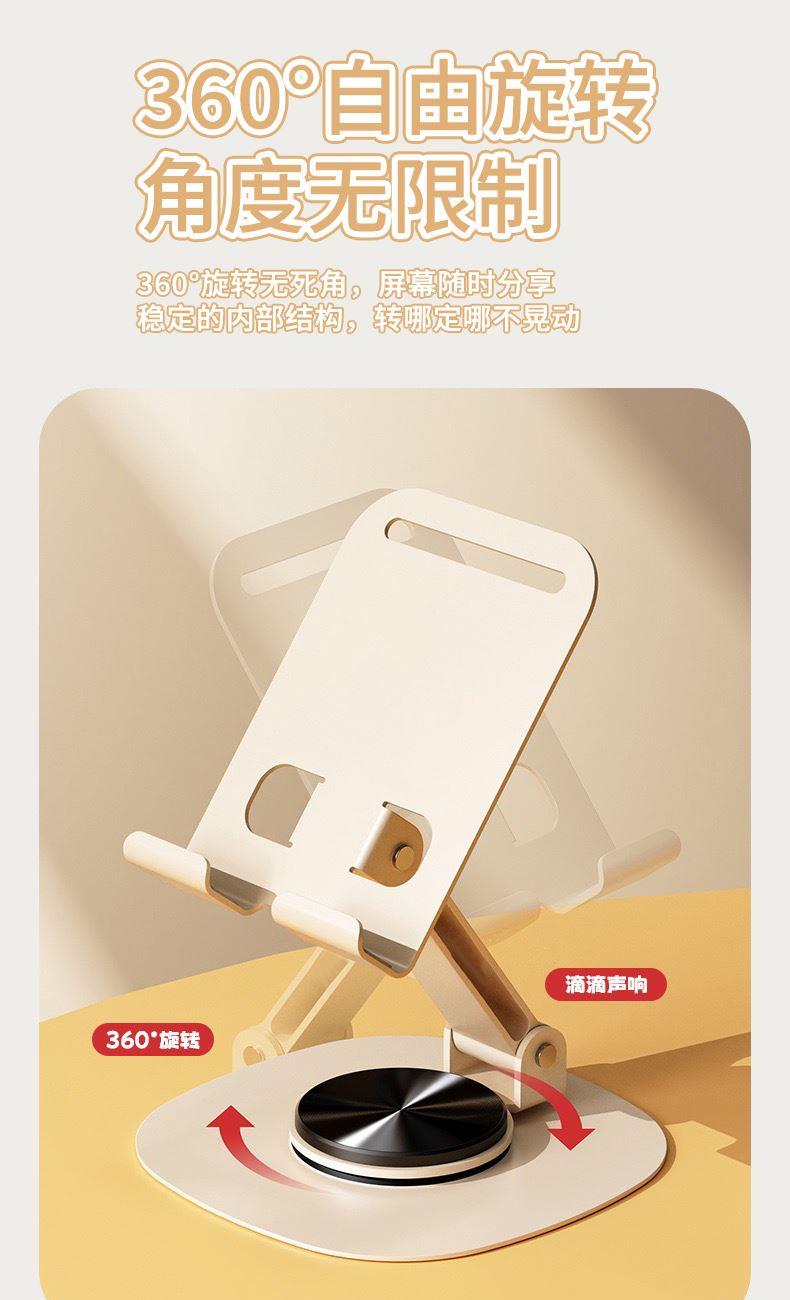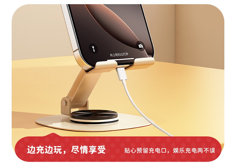 金属材料支架,增加防滑脚垫 360°可旋转底座 支撑力强劲,手机/平板通用 预留充电位,边用边充