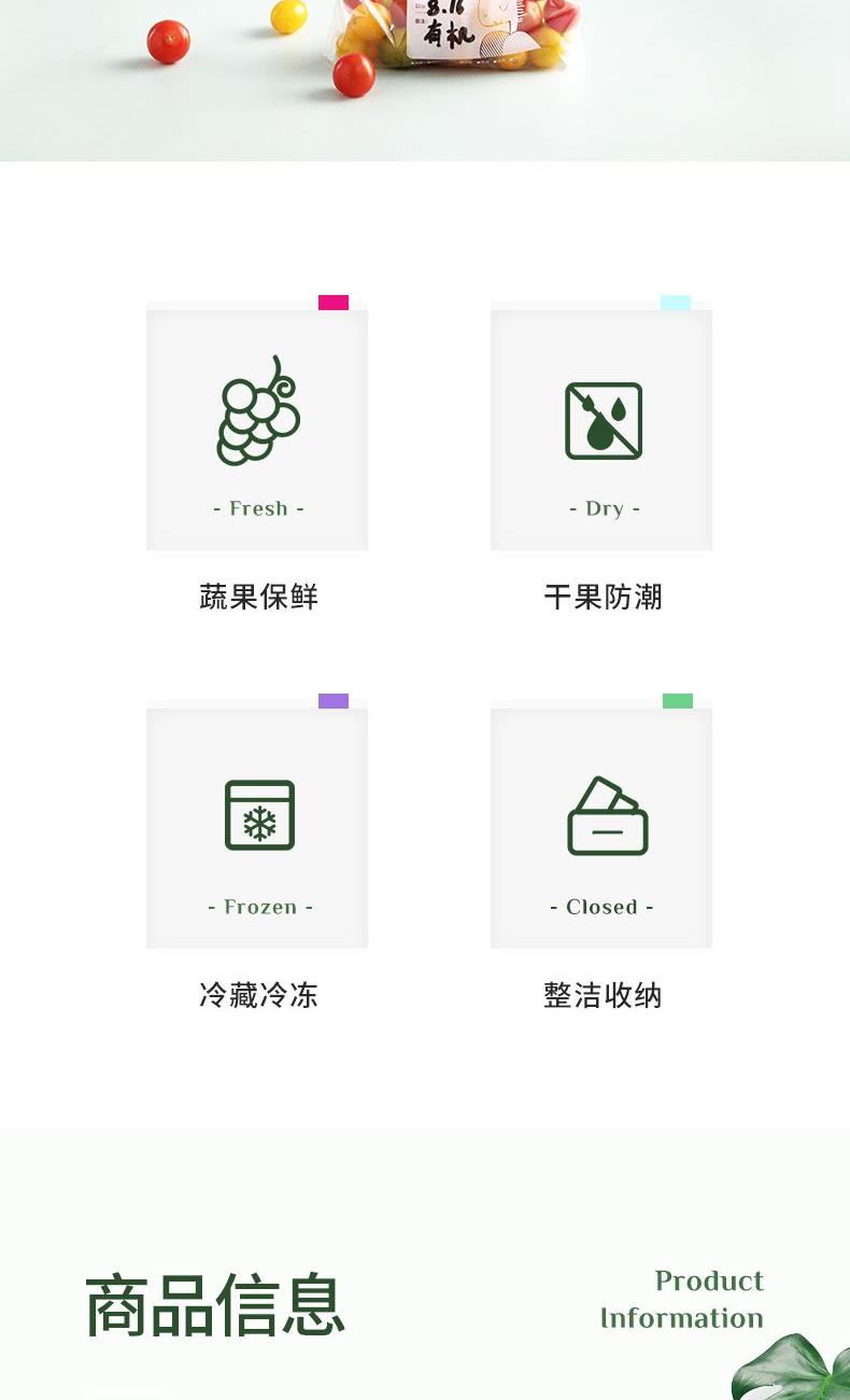 产品货号:990101 产品尺寸:26.5*32.5*0.006 产品材质:LDPE 产品克重:199g 外箱尺寸:38*28*30 包装方式:15 Pcs/Color Box 果蔬保鲜,冰箱收纳; 低温储物,冷藏保鲜; 贴心标签,随心记录。