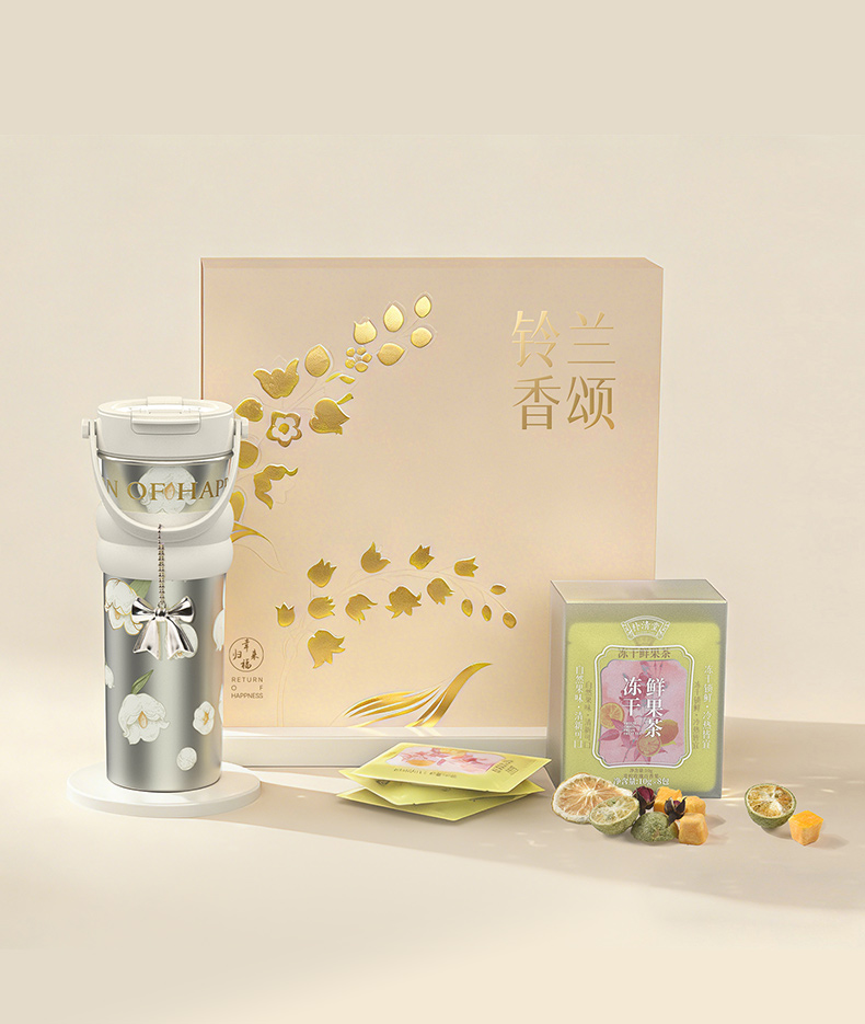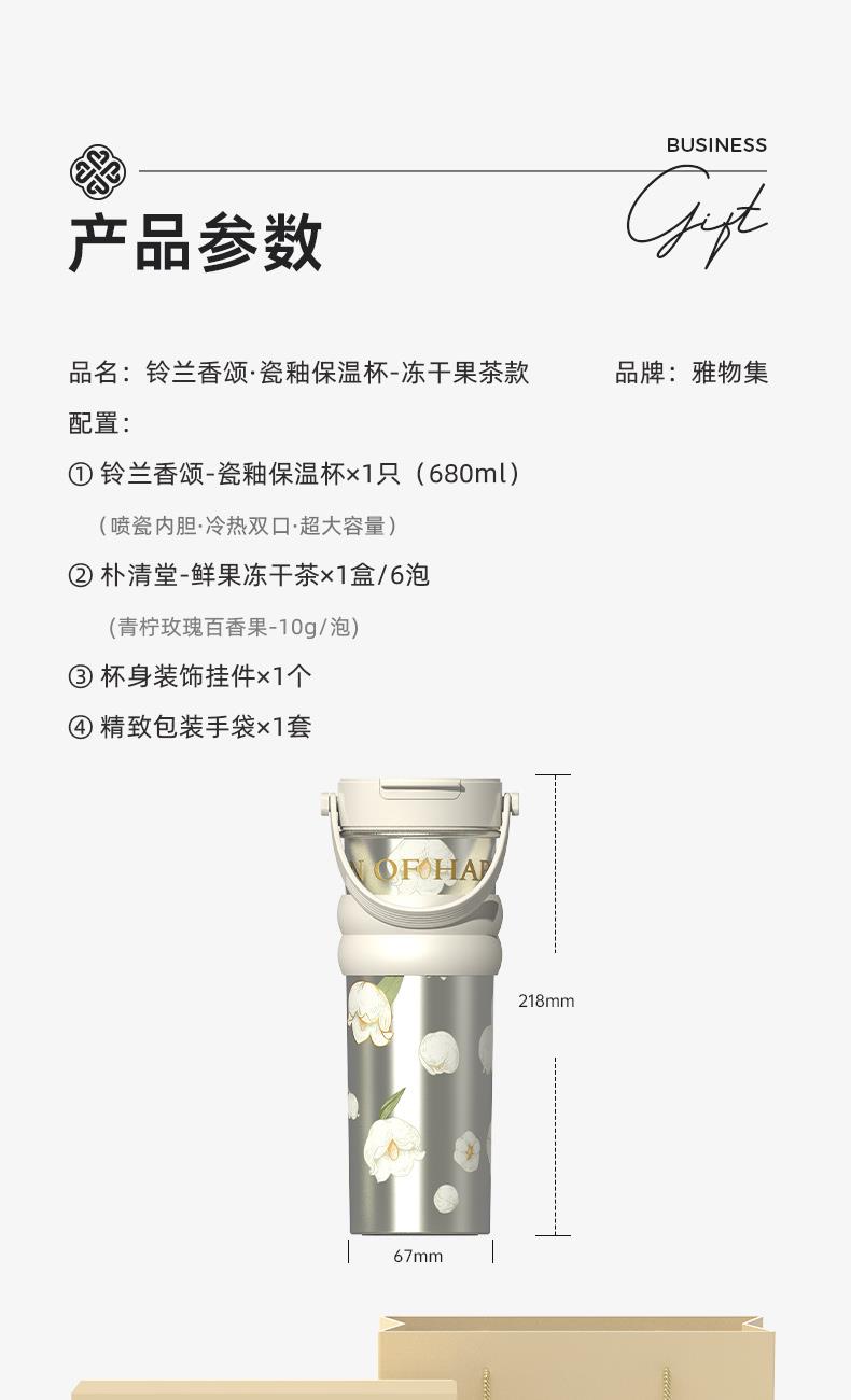 ① 铃兰香颂-瓷釉保温杯×1只(680ml) (喷瓷内胆·冷热双口·超大容量) ② 朴清堂-鲜果冻干茶×1盒/6泡 ·青柠玫瑰百香果-10g/泡 ③ 杯身装饰挂件×1个 ④ 精致包装手袋×1套 职场里的“维C能量站” 超大容量瓷釉杯邂逅瞬锁鲜萃 让忙碌间隙也满溢果香与温润关怀。
