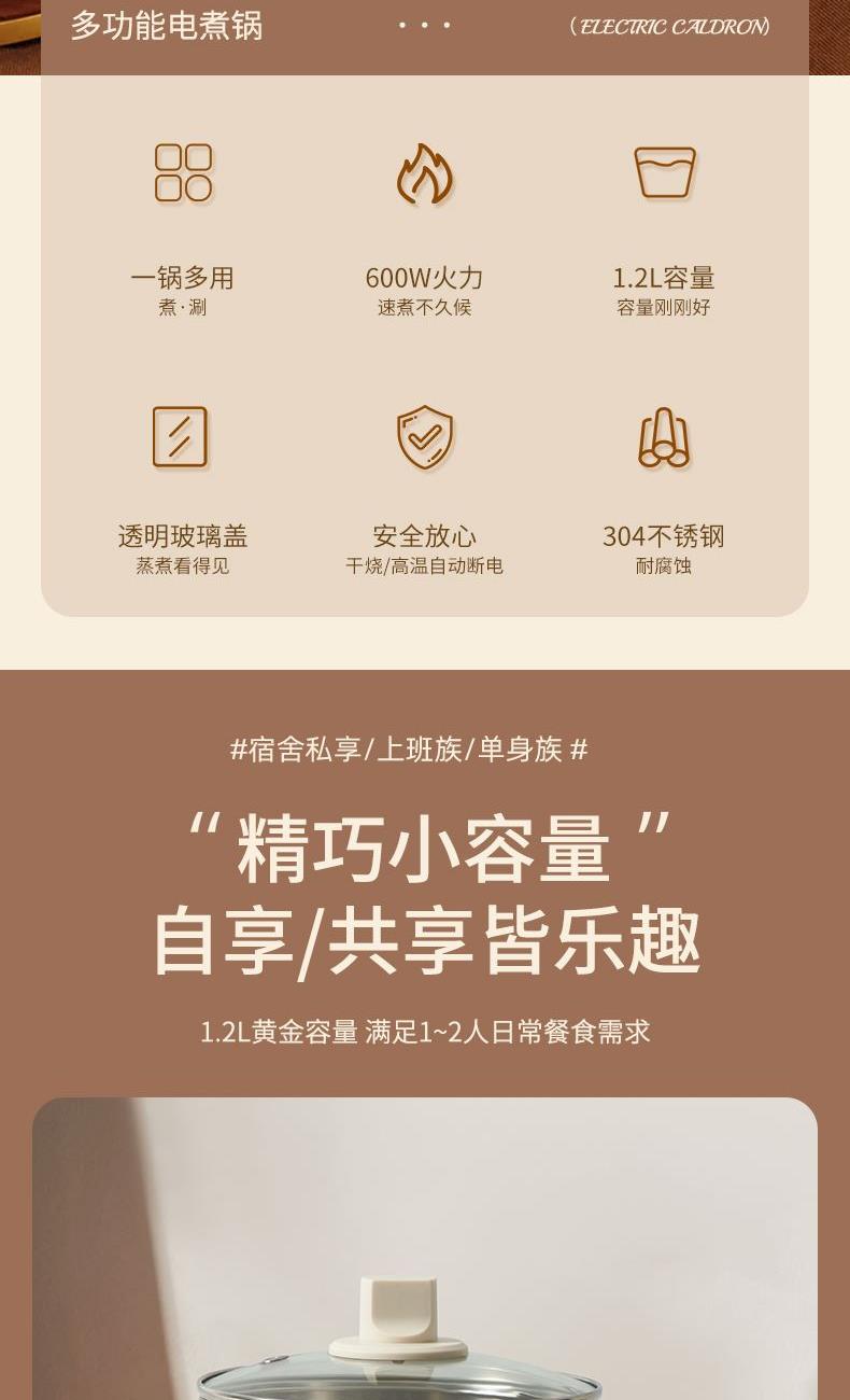 额定电压:220V 额定频率:50Hz 额定功率:600W 容量:1.2L 条形码:6907778938280 彩盒尺寸:186*184*155mm 1.1.2L黄金容量 2.花样功能 蒸、煮、涮、煲 3.钢化透明玻璃盖,蒸煮看得见 4.双重温控保护,安全放心 5.304不锈钢,耐腐蚀 食品级材质 6.防烫舒适手柄,人体工程学设计, 握感舒适