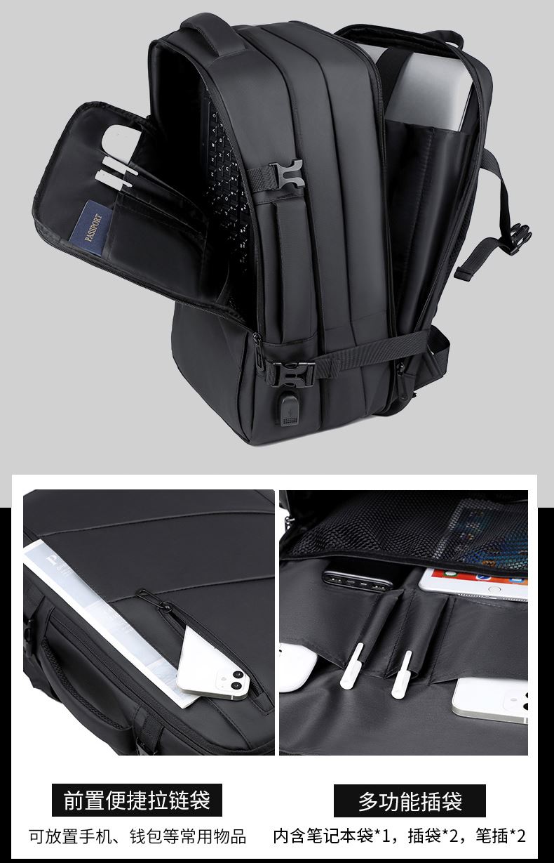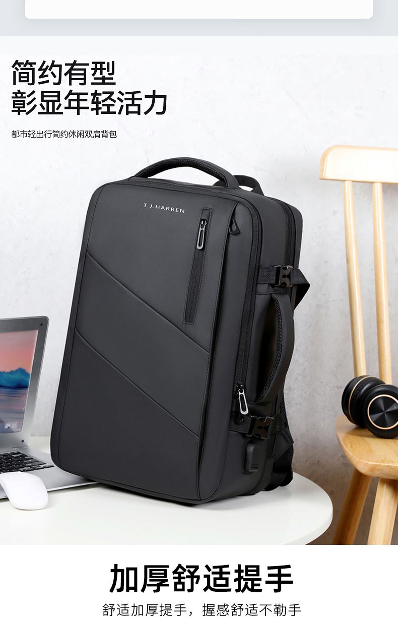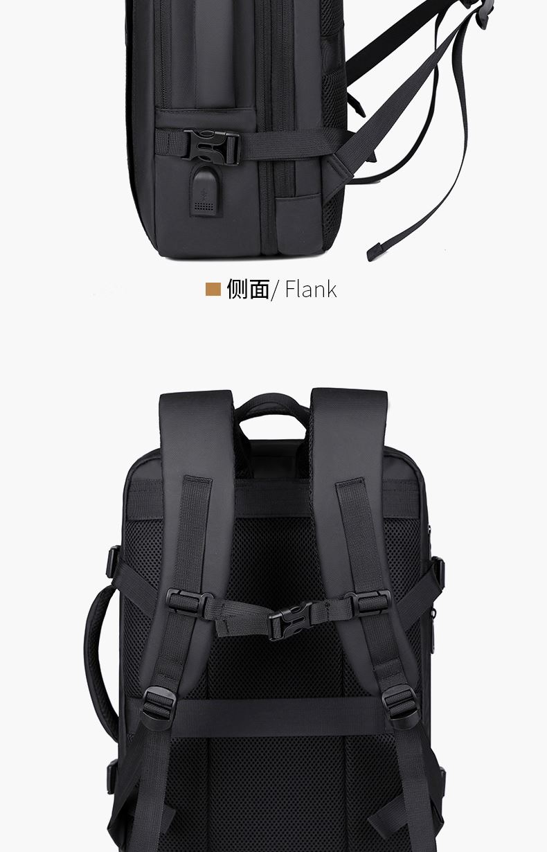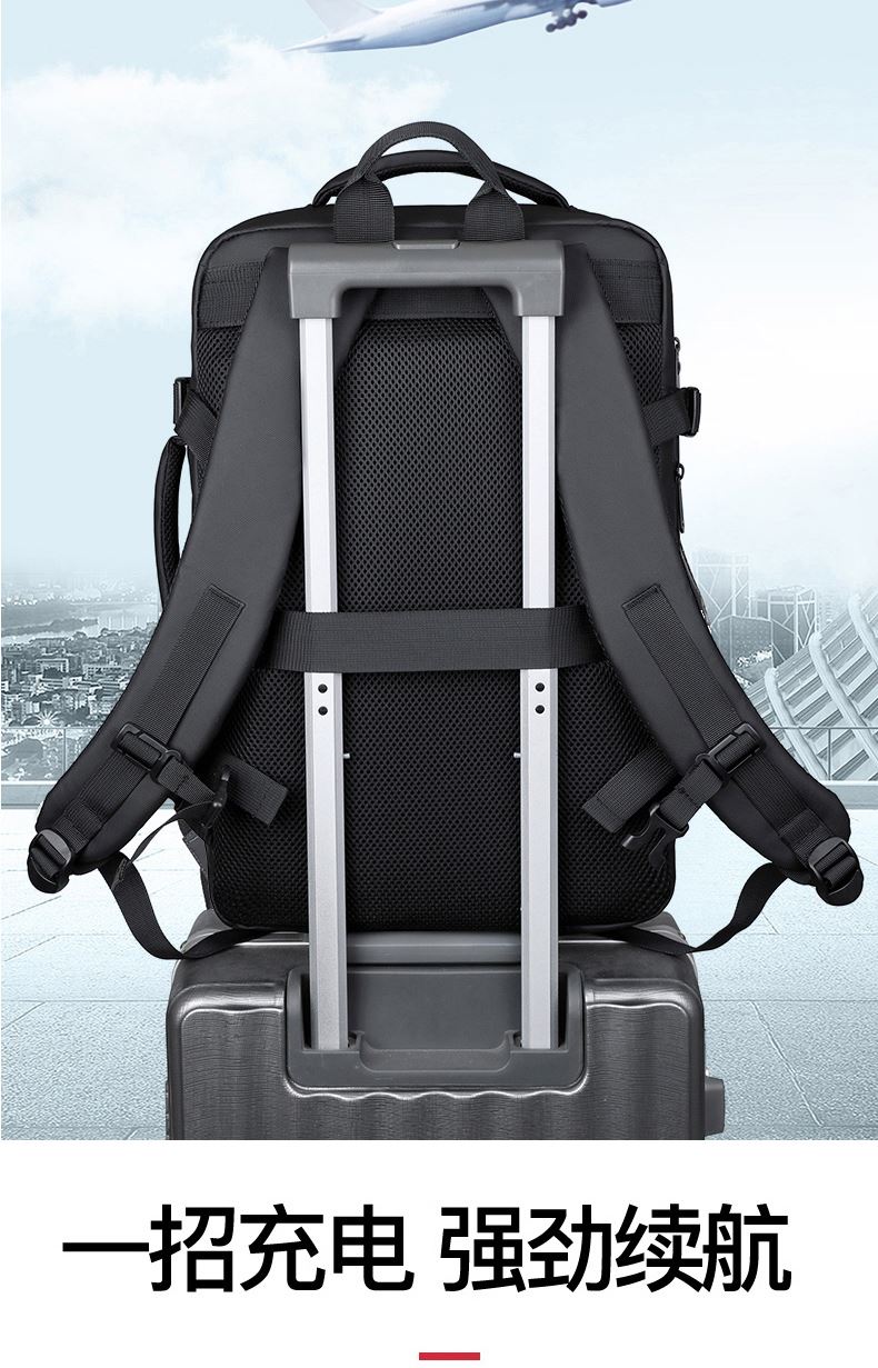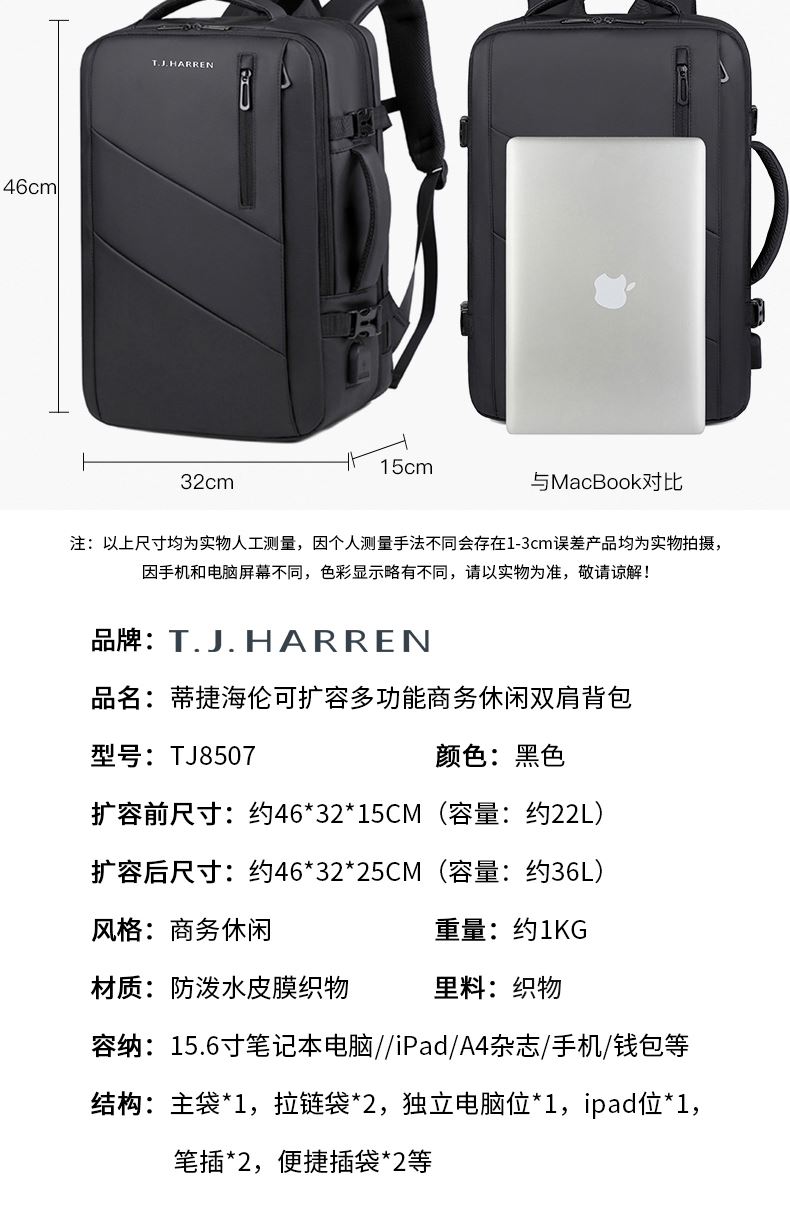 型号:TJ8507 颜色:黑色 面料:柔性防水皮膜织物 里料:织物 扩容前尺寸:约46*32*15CM(容量:约22L) 扩容后尺寸:约46*32*25CM(容量:约36L) 重量:约1KG 等级:一等合格品 执行标准:QB/T 1333-2018 产品特点: 1、新款多功能可扩容设计,超大容量,旅行休闲商务三用;2、柔性防水皮膜面料,一擦即干,轻松打理;3、多隔层结构,分区合理,轻松收纳;4、双主袋扩容前共约22L大容量,适合日常通勤;5、双主袋扩容后共约36L大容量,适合长途旅行;6、独立加棉加厚电脑隔层袋,可放置15.6寸电脑;7、2个大容量前置拉链袋,放置贴身物品;8、带USB充电接口,充电更方便;9、多个内置物袋,方便收纳放置更多小物件;10、拉杆固定束带设计,解放双手;11、透气背负系统,配合加大加厚提手与肩带,可背可提、透气干爽,舒适减压出行;12、支持客户定制。