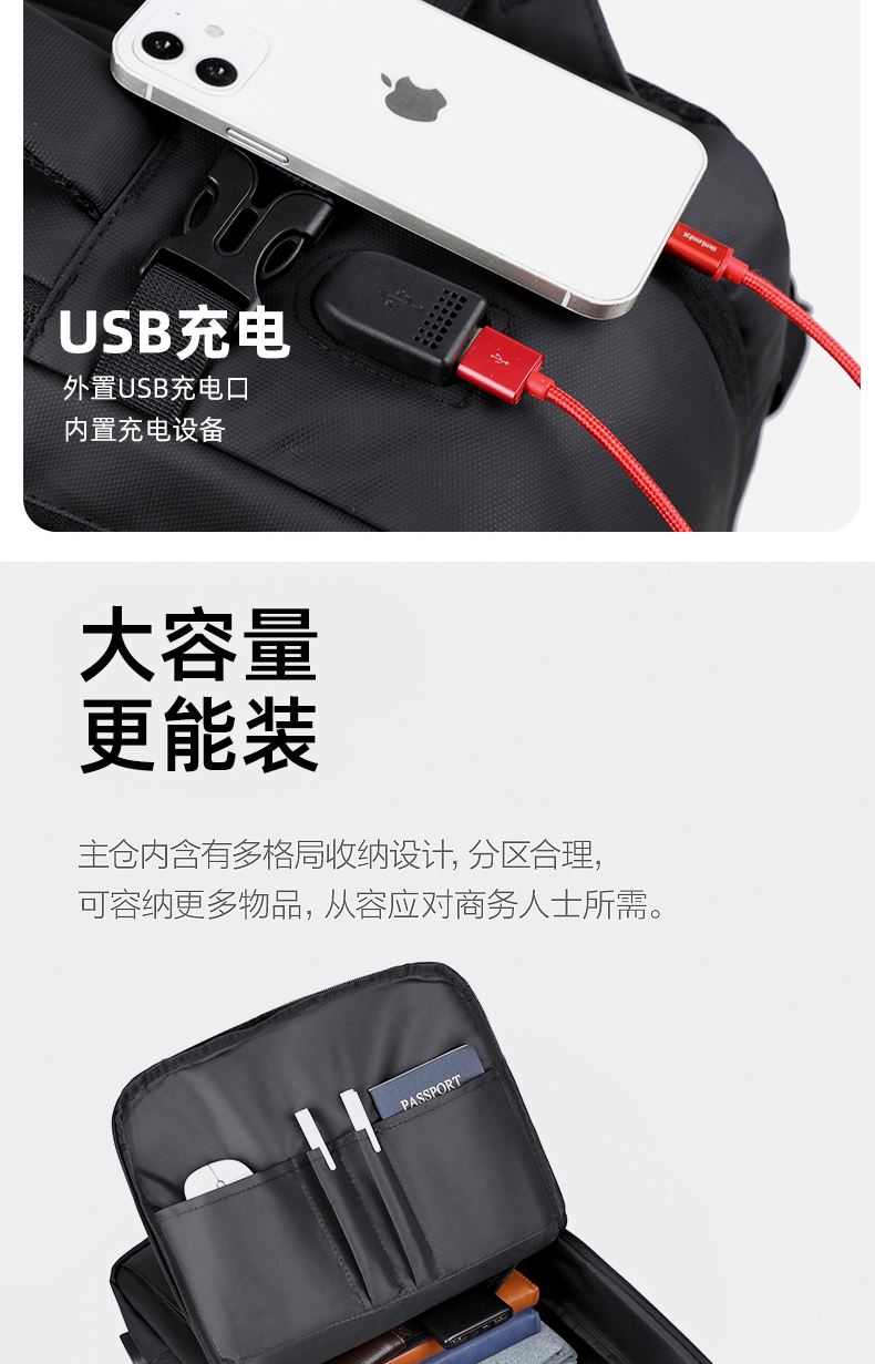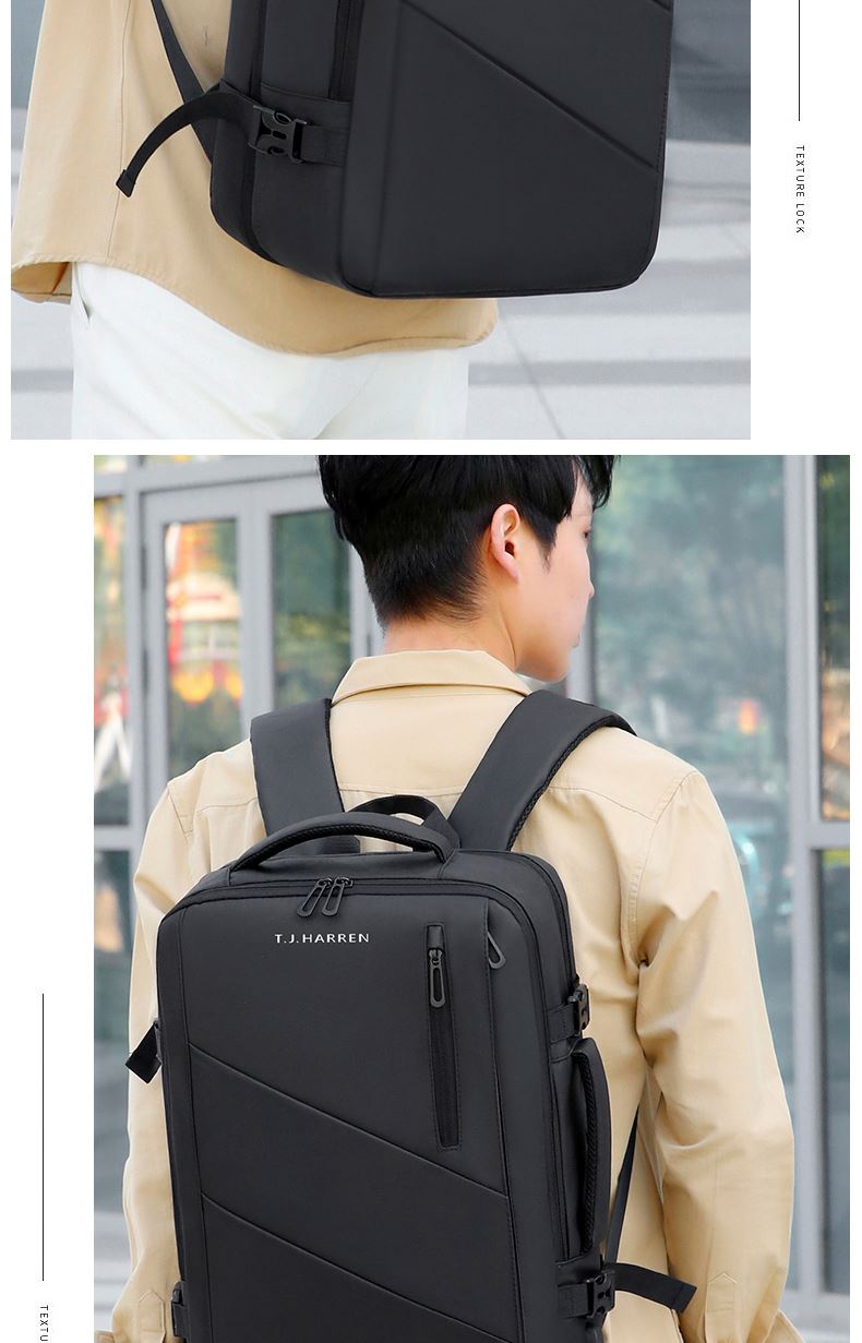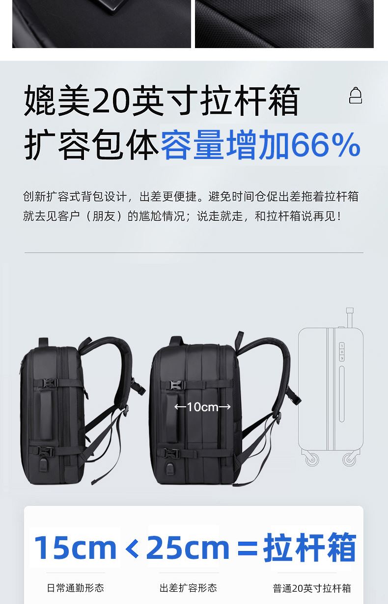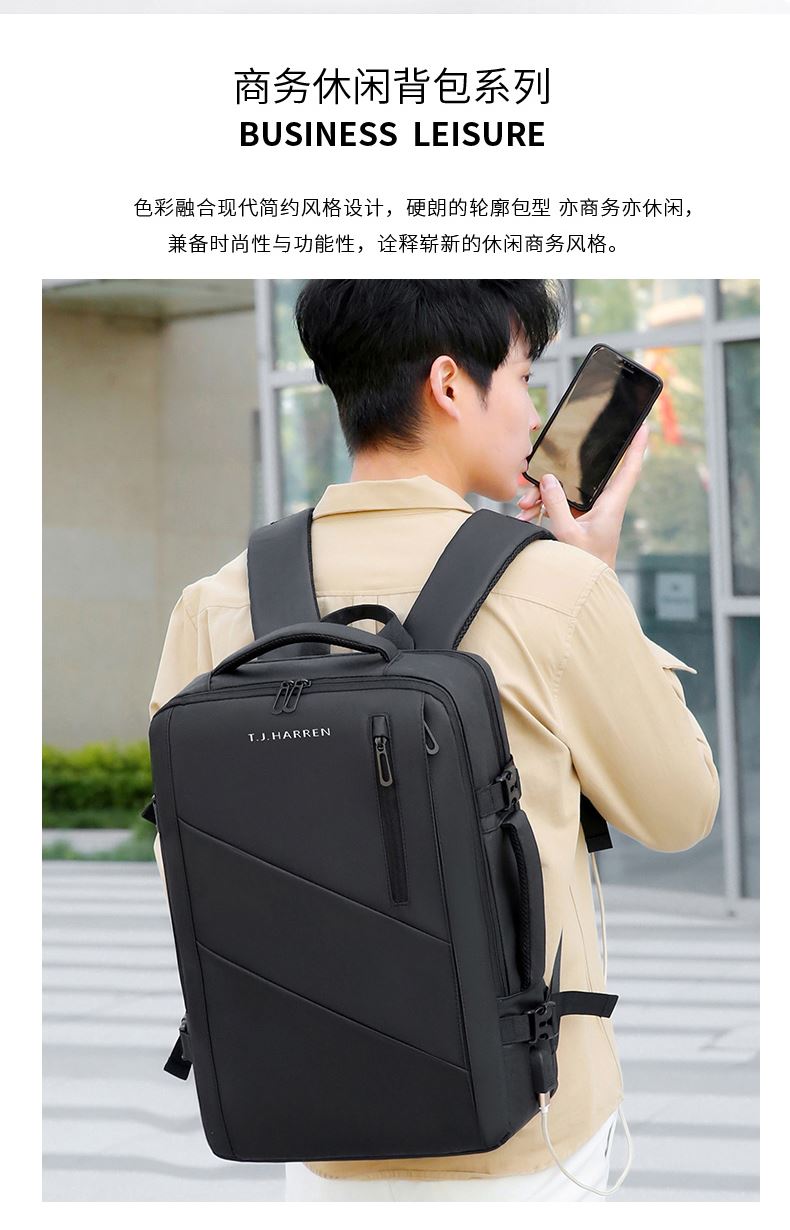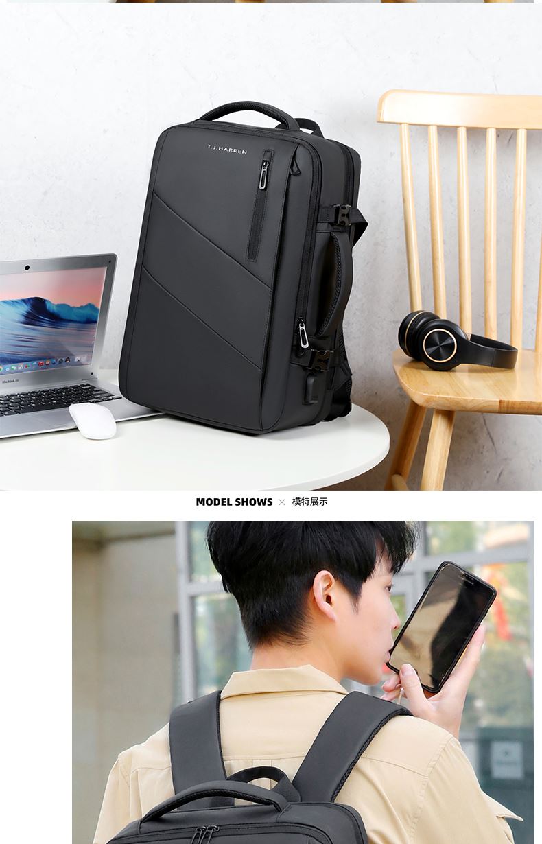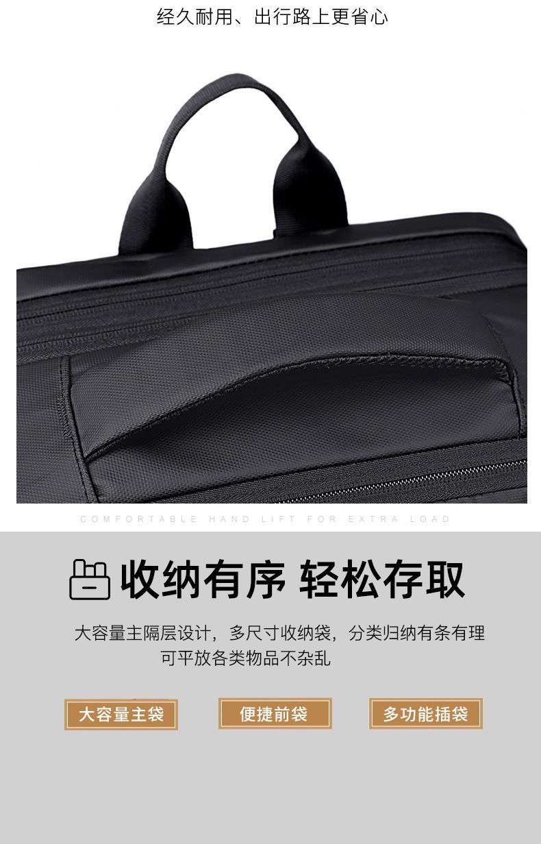 型号:TJ8507 颜色:黑色 面料:柔性防水皮膜织物 里料:织物 扩容前尺寸:约46*32*15CM(容量:约22L) 扩容后尺寸:约46*32*25CM(容量:约36L) 重量:约1KG 等级:一等合格品 执行标准:QB/T 1333-2018 产品特点: 1、新款多功能可扩容设计,超大容量,旅行休闲商务三用;2、柔性防水皮膜面料,一擦即干,轻松打理;3、多隔层结构,分区合理,轻松收纳;4、双主袋扩容前共约22L大容量,适合日常通勤;5、双主袋扩容后共约36L大容量,适合长途旅行;6、独立加棉加厚电脑隔层袋,可放置15.6寸电脑;7、2个大容量前置拉链袋,放置贴身物品;8、带USB充电接口,充电更方便;9、多个内置物袋,方便收纳放置更多小物件;10、拉杆固定束带设计,解放双手;11、透气背负系统,配合加大加厚提手与肩带,可背可提、透气干爽,舒适减压出行;12、支持客户定制。