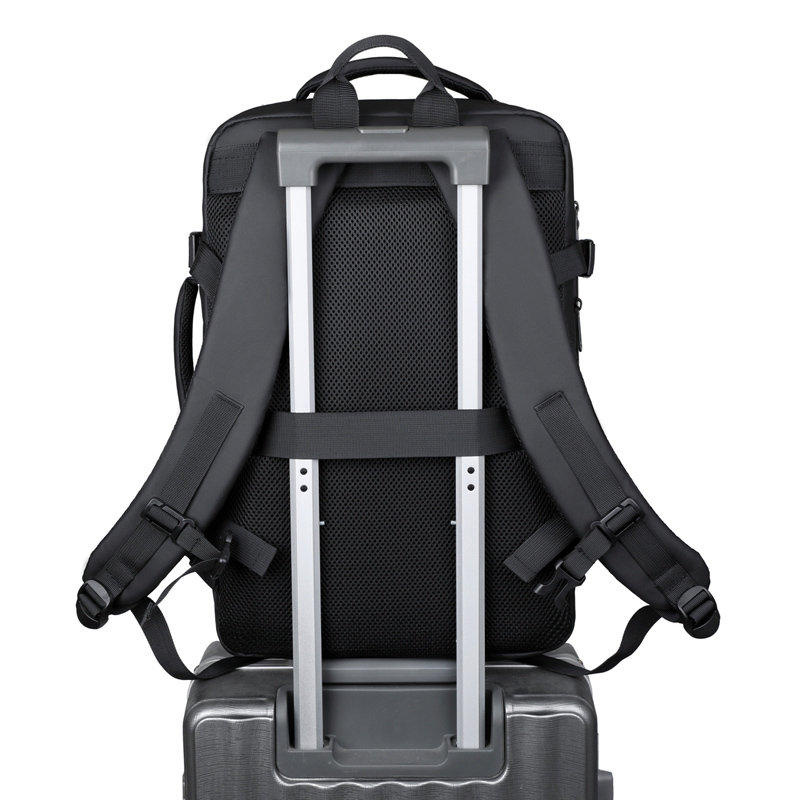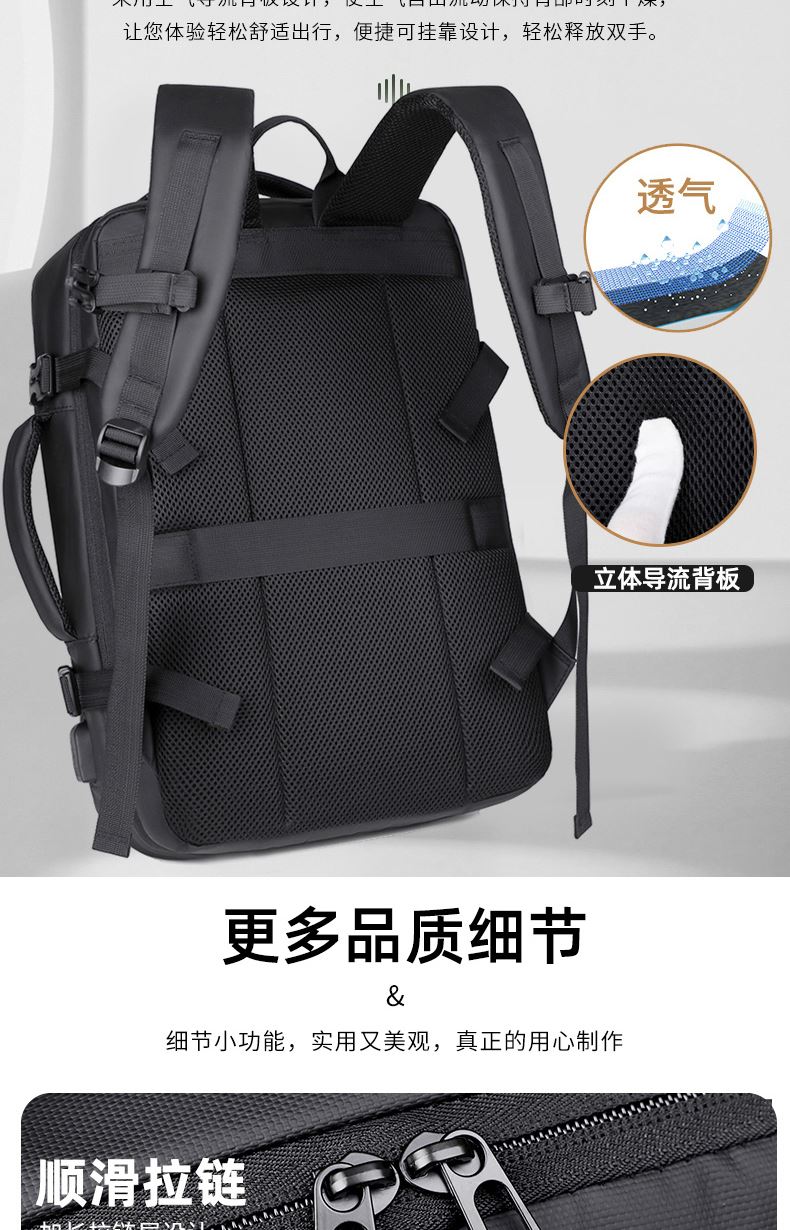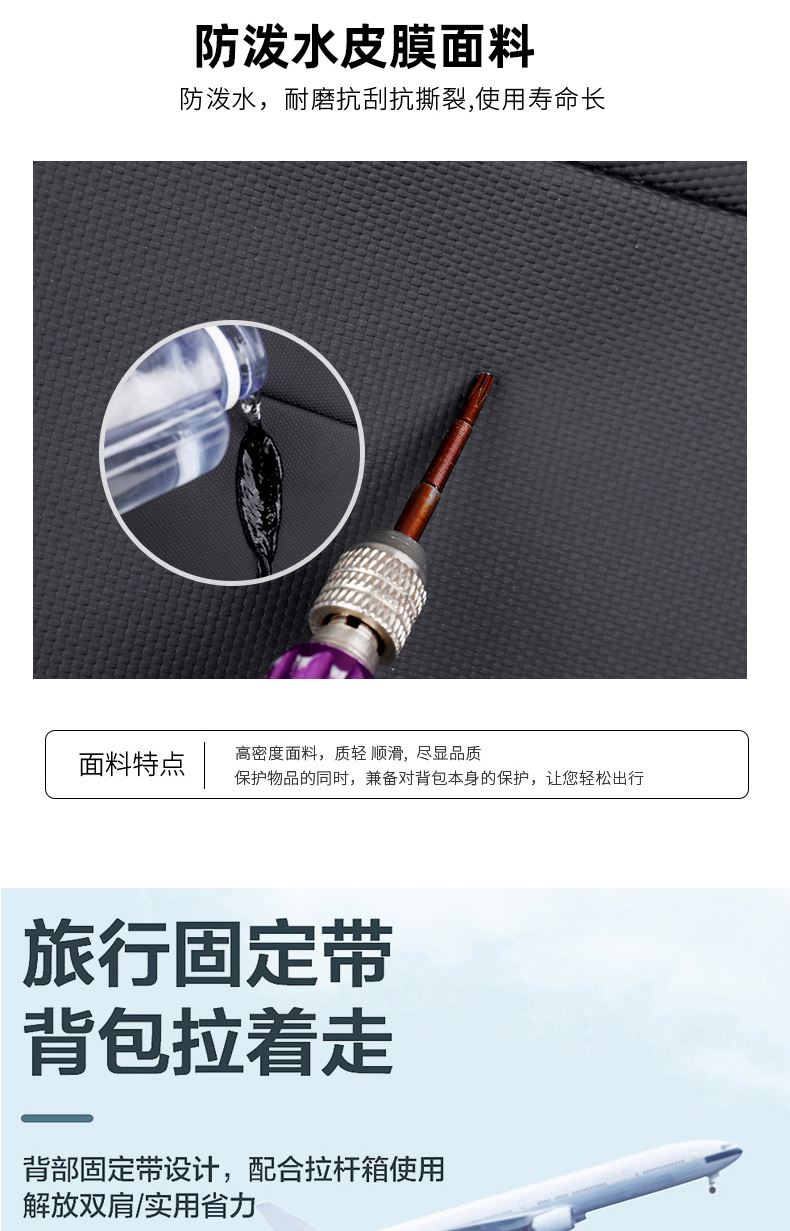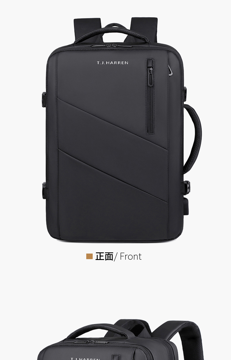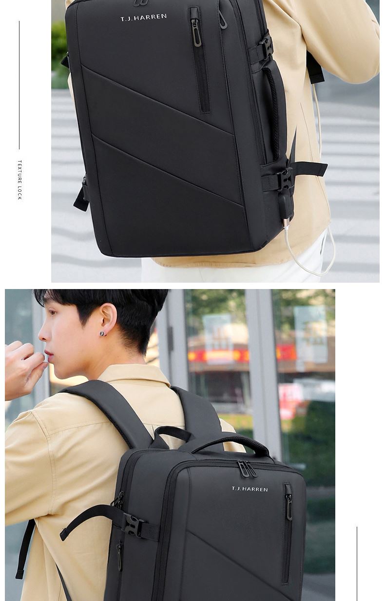 型号:TJ8507 颜色:黑色 面料:柔性防水皮膜织物 里料:织物 扩容前尺寸:约46*32*15CM(容量:约22L) 扩容后尺寸:约46*32*25CM(容量:约36L) 重量:约1KG 等级:一等合格品 执行标准:QB/T 1333-2018 产品特点: 1、新款多功能可扩容设计,超大容量,旅行休闲商务三用;2、柔性防水皮膜面料,一擦即干,轻松打理;3、多隔层结构,分区合理,轻松收纳;4、双主袋扩容前共约22L大容量,适合日常通勤;5、双主袋扩容后共约36L大容量,适合长途旅行;6、独立加棉加厚电脑隔层袋,可放置15.6寸电脑;7、2个大容量前置拉链袋,放置贴身物品;8、带USB充电接口,充电更方便;9、多个内置物袋,方便收纳放置更多小物件;10、拉杆固定束带设计,解放双手;11、透气背负系统,配合加大加厚提手与肩带,可背可提、透气干爽,舒适减压出行;12、支持客户定制。