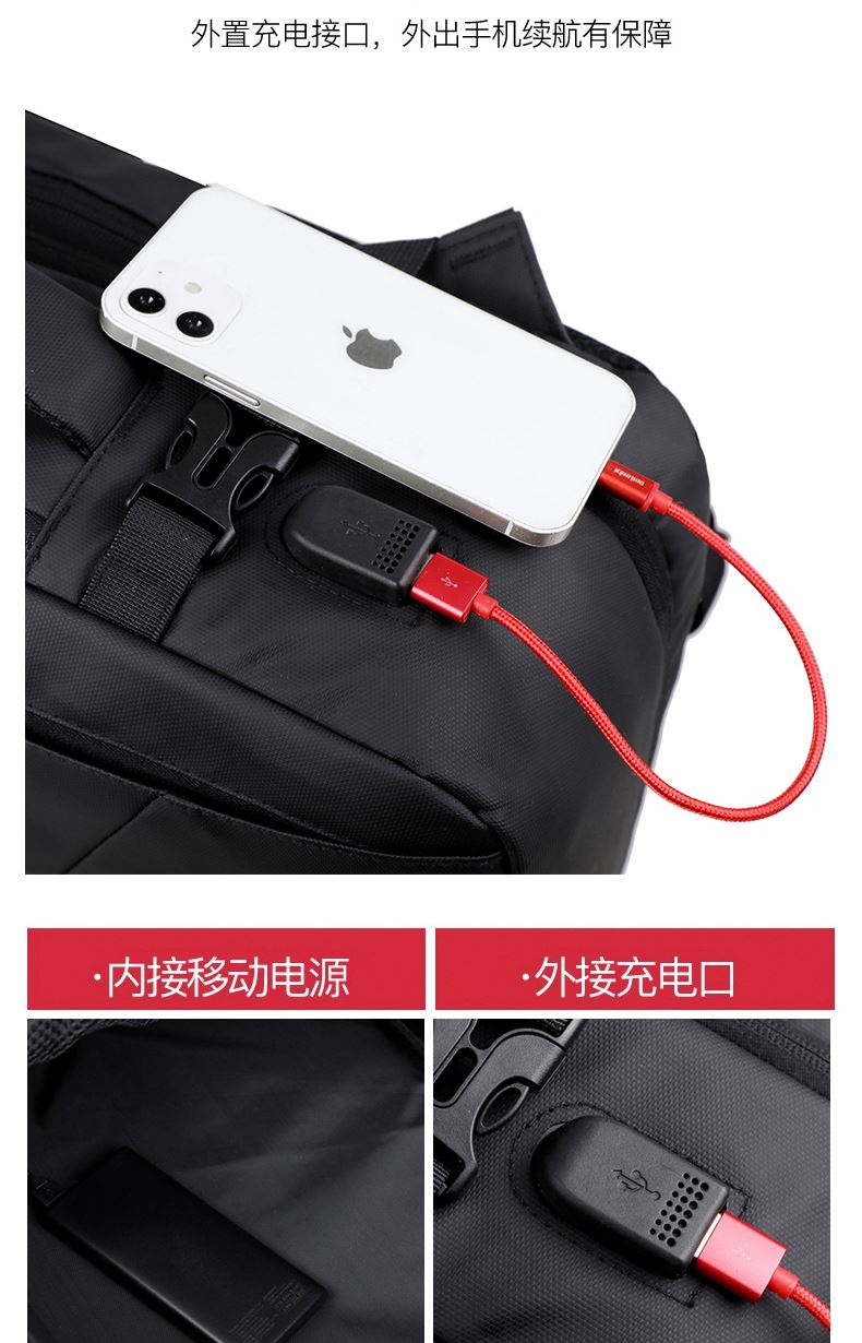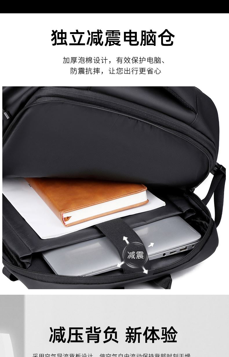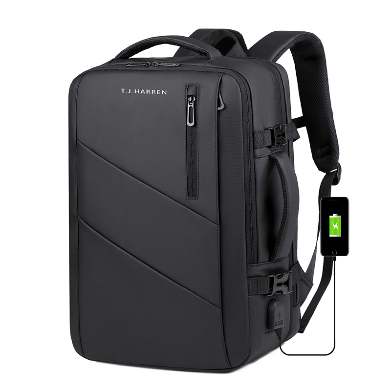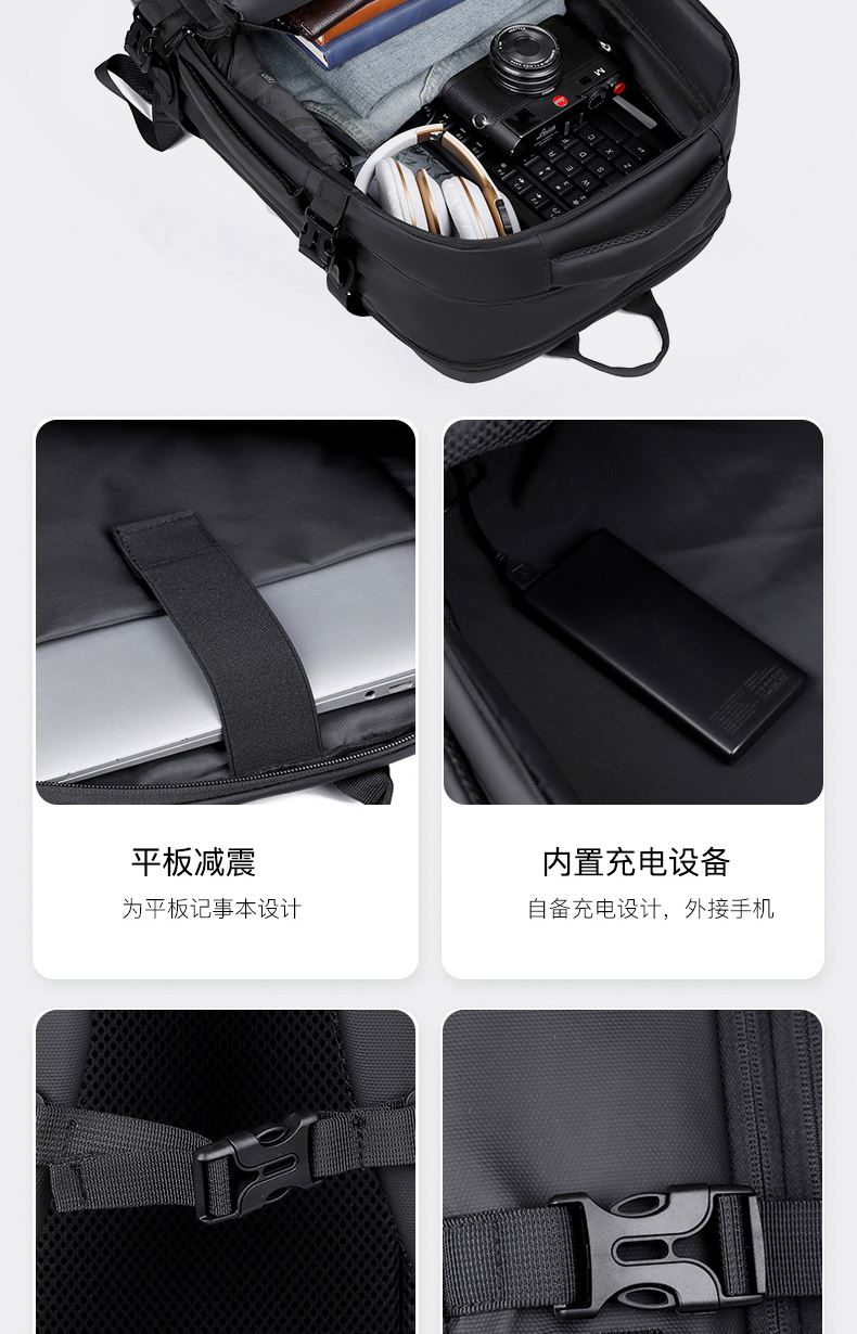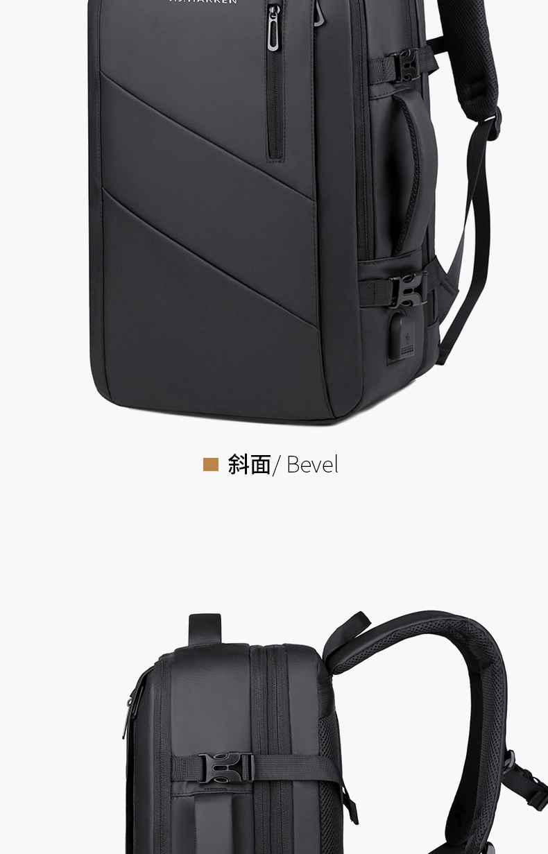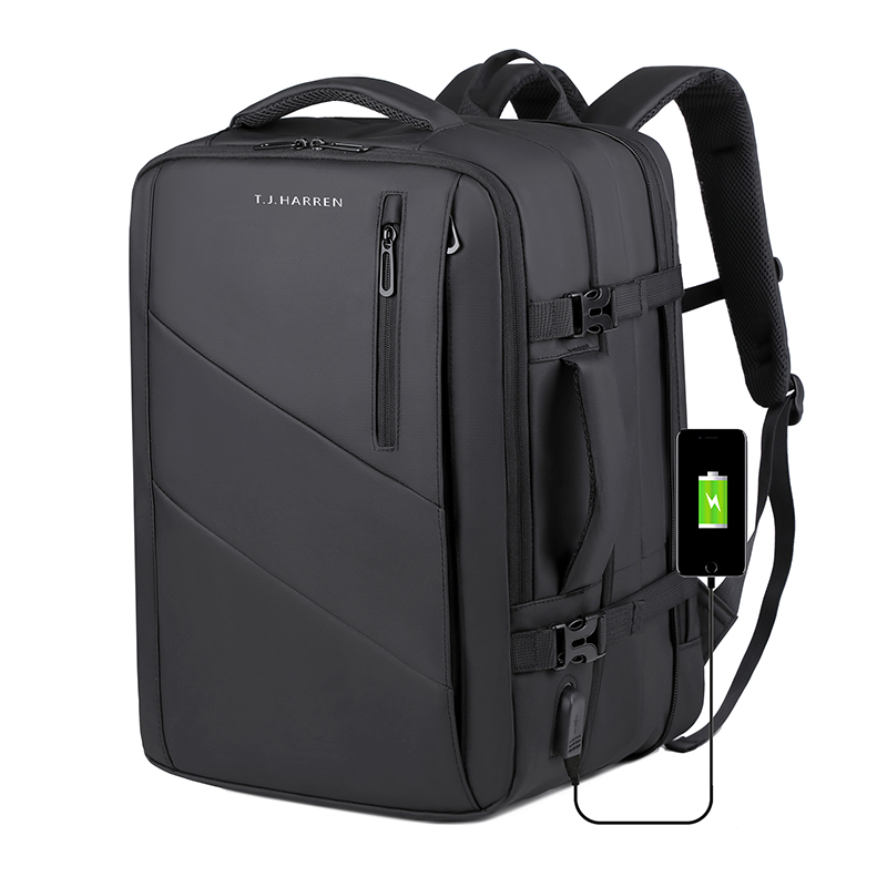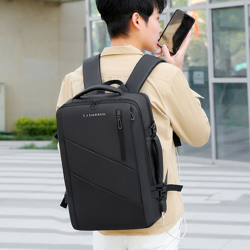 型号:TJ8507 颜色:黑色 面料:柔性防水皮膜织物 里料:织物 扩容前尺寸:约46*32*15CM(容量:约22L) 扩容后尺寸:约46*32*25CM(容量:约36L) 重量:约1KG 等级:一等合格品 执行标准:QB/T 1333-2018 产品特点: 1、新款多功能可扩容设计,超大容量,旅行休闲商务三用;2、柔性防水皮膜面料,一擦即干,轻松打理;3、多隔层结构,分区合理,轻松收纳;4、双主袋扩容前共约22L大容量,适合日常通勤;5、双主袋扩容后共约36L大容量,适合长途旅行;6、独立加棉加厚电脑隔层袋,可放置15.6寸电脑;7、2个大容量前置拉链袋,放置贴身物品;8、带USB充电接口,充电更方便;9、多个内置物袋,方便收纳放置更多小物件;10、拉杆固定束带设计,解放双手;11、透气背负系统,配合加大加厚提手与肩带,可背可提、透气干爽,舒适减压出行;12、支持客户定制。