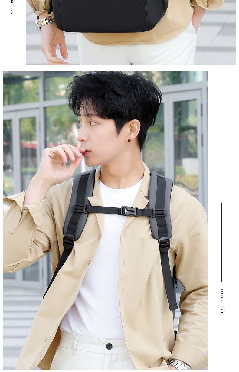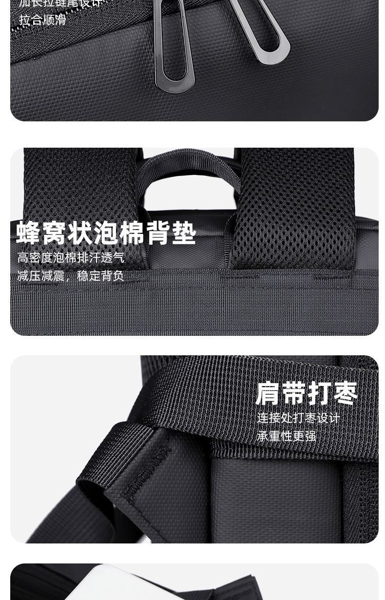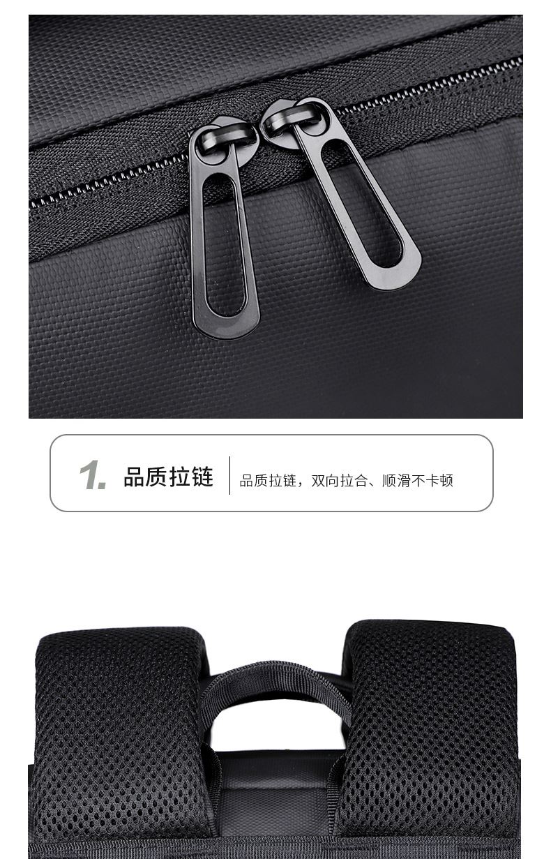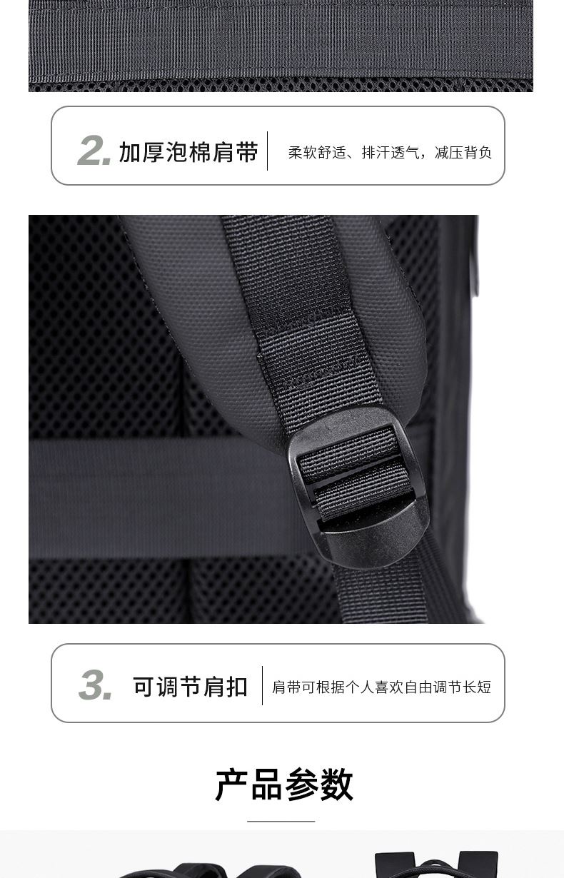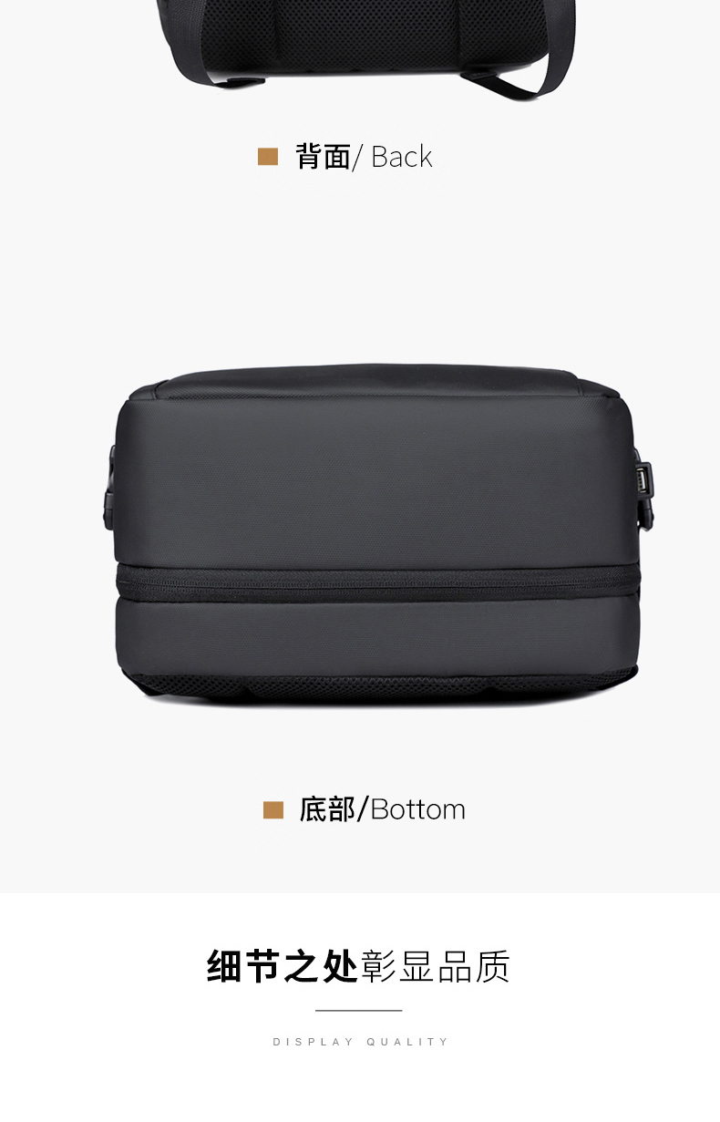型号:TJ8507 颜色:黑色 面料:柔性防水皮膜织物 里料:织物 扩容前尺寸:约46*32*15CM(容量:约22L) 扩容后尺寸:约46*32*25CM(容量:约36L) 重量:约1KG 等级:一等合格品 执行标准:QB/T 1333-2018 产品特点: 1、新款多功能可扩容设计,超大容量,旅行休闲商务三用;2、柔性防水皮膜面料,一擦即干,轻松打理;3、多隔层结构,分区合理,轻松收纳;4、双主袋扩容前共约22L大容量,适合日常通勤;5、双主袋扩容后共约36L大容量,适合长途旅行;6、独立加棉加厚电脑隔层袋,可放置15.6寸电脑;7、2个大容量前置拉链袋,放置贴身物品;8、带USB充电接口,充电更方便;9、多个内置物袋,方便收纳放置更多小物件;10、拉杆固定束带设计,解放双手;11、透气背负系统,配合加大加厚提手与肩带,可背可提、透气干爽,舒适减压出行;12、支持客户定制。