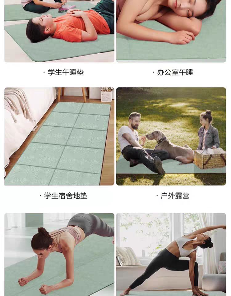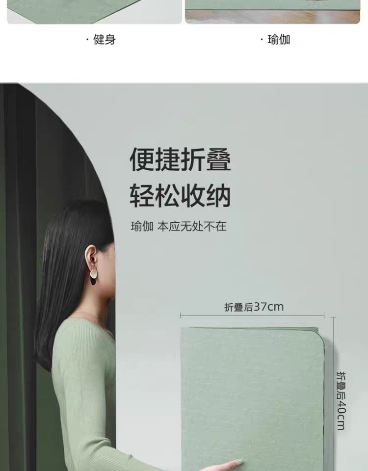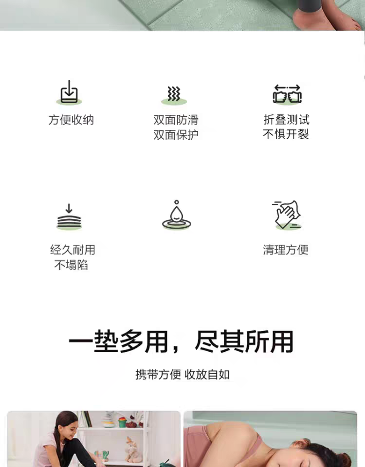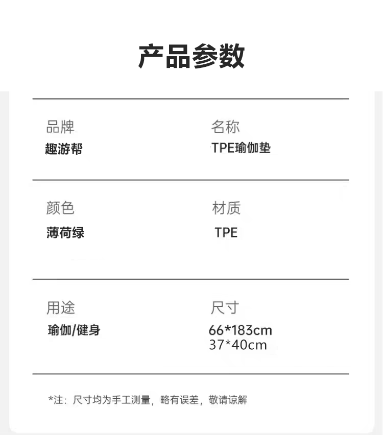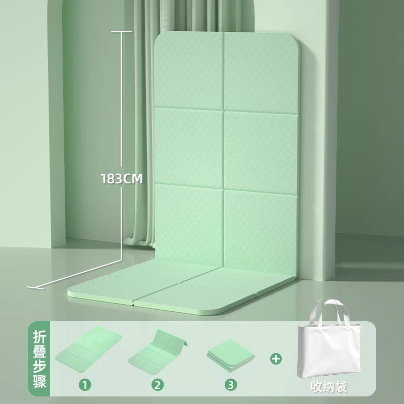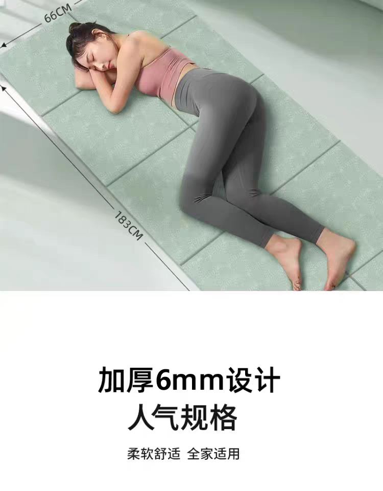 材质 TPE环保材质 颜色 薄荷绿 尺寸 打开,183*66*0.6cm;收纳,37*40cm 重量 800g 便携·防滑·多场景运动伴侣; 双面防滑 一面止滑一面抓地 3秒折叠,体积缩小50%,便于携带 防水止汗,清水或湿纸巾擦拭即可 赠送无纺布收纳袋,易收纳;