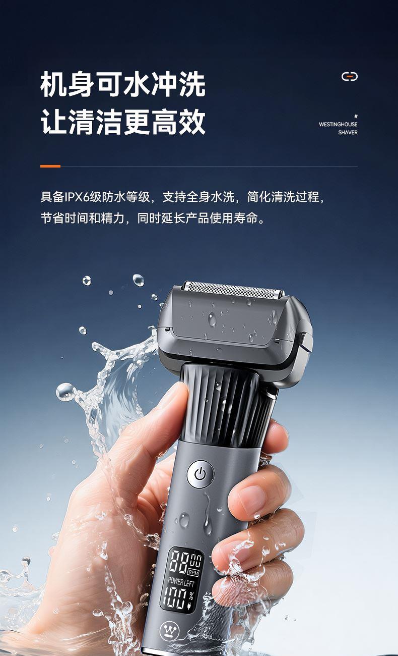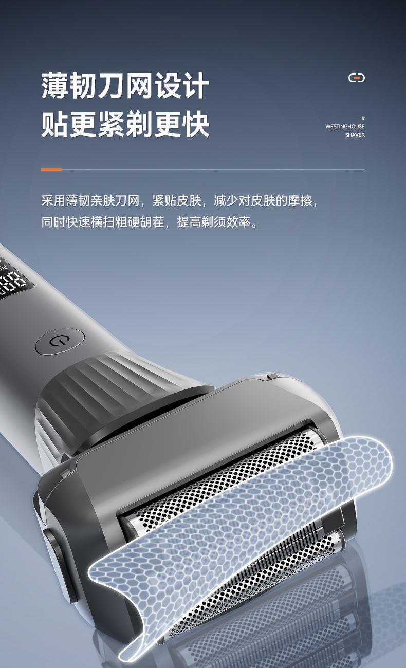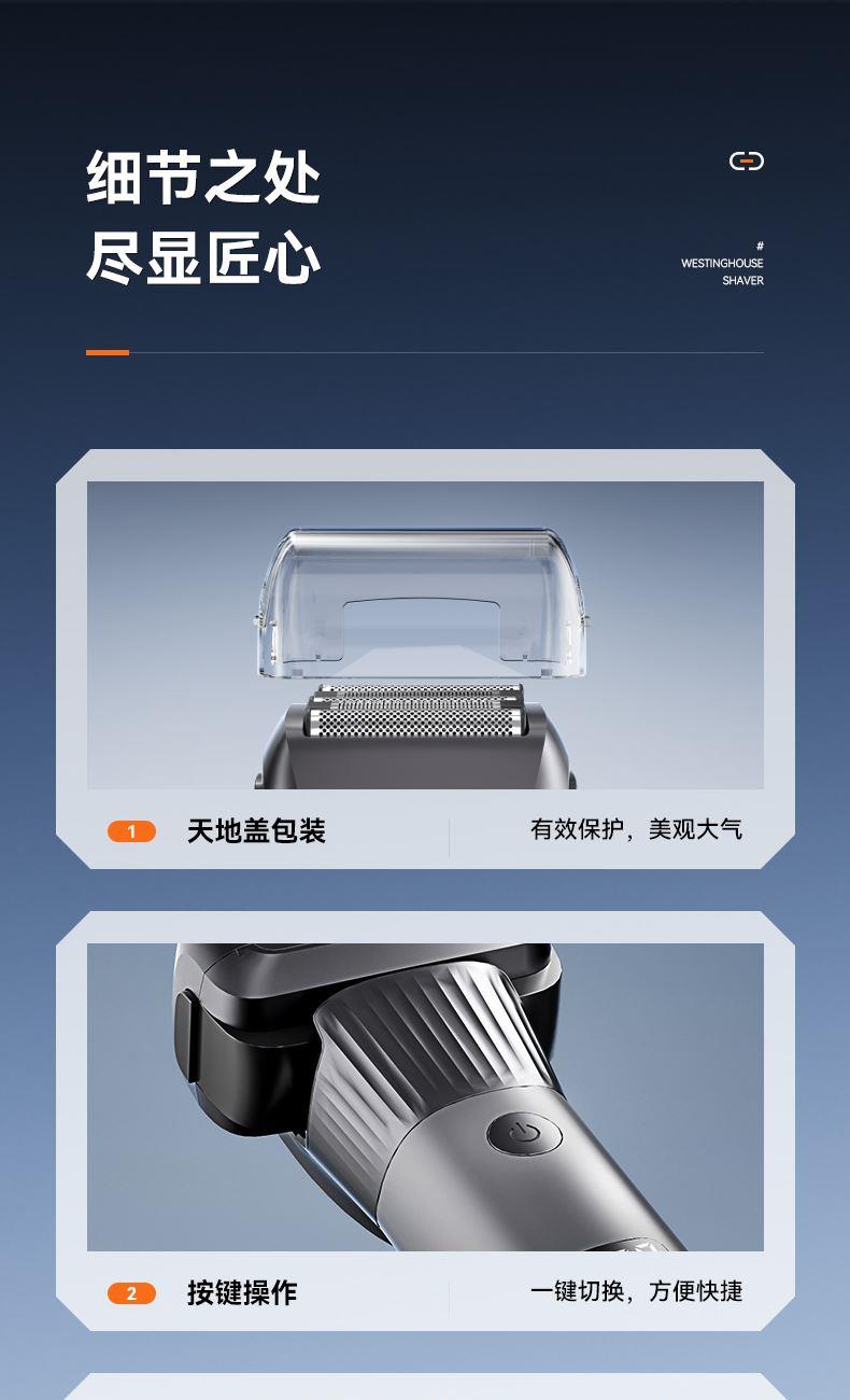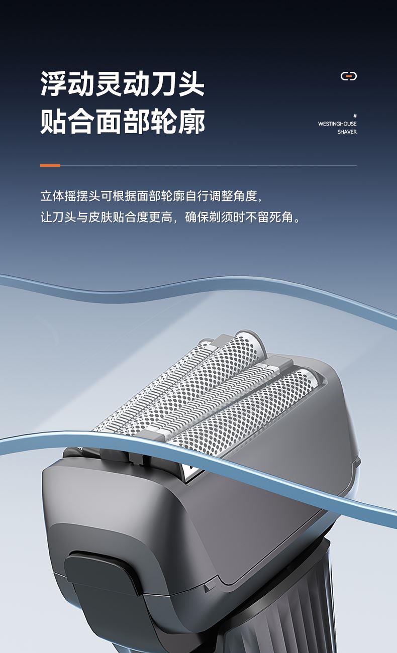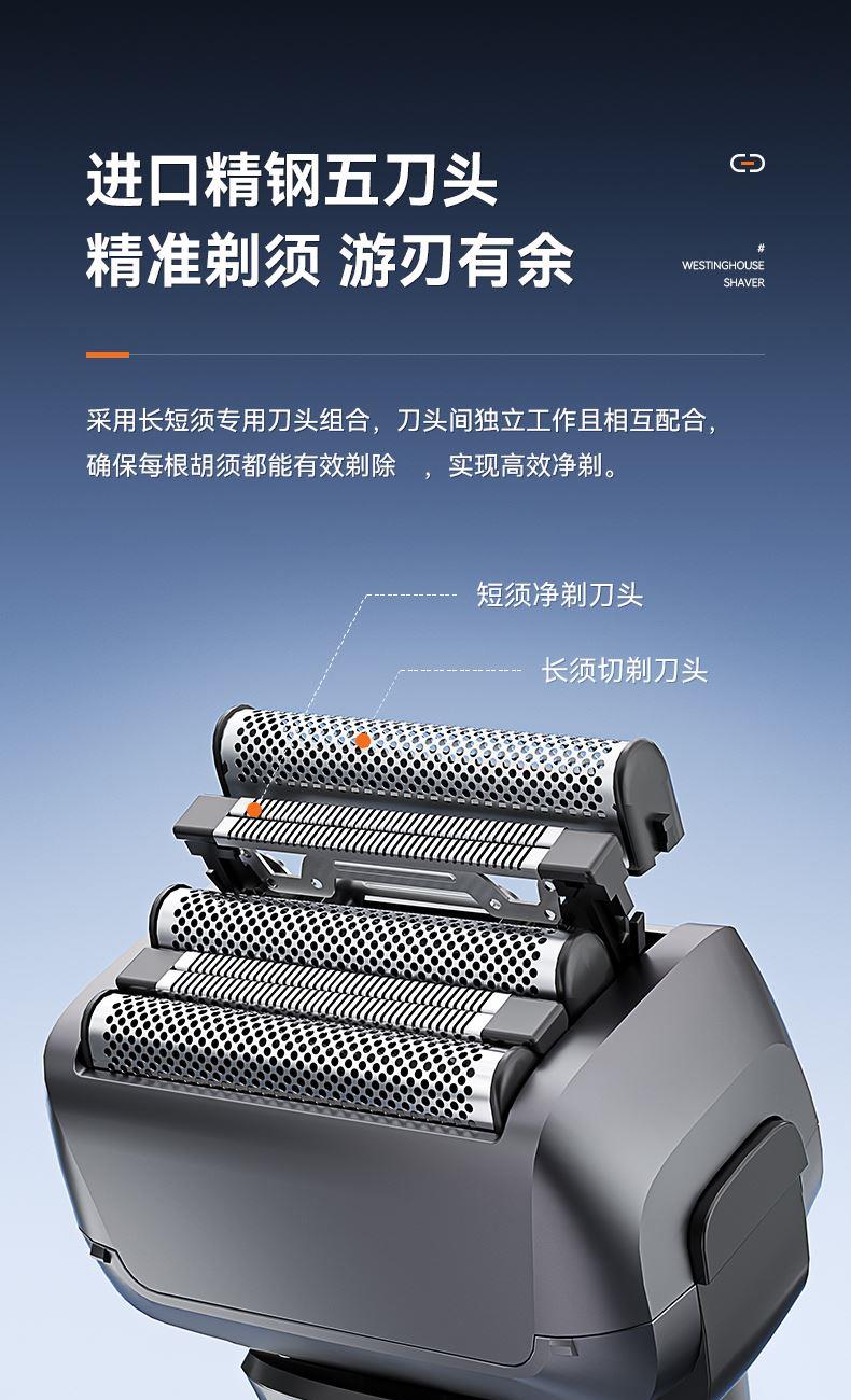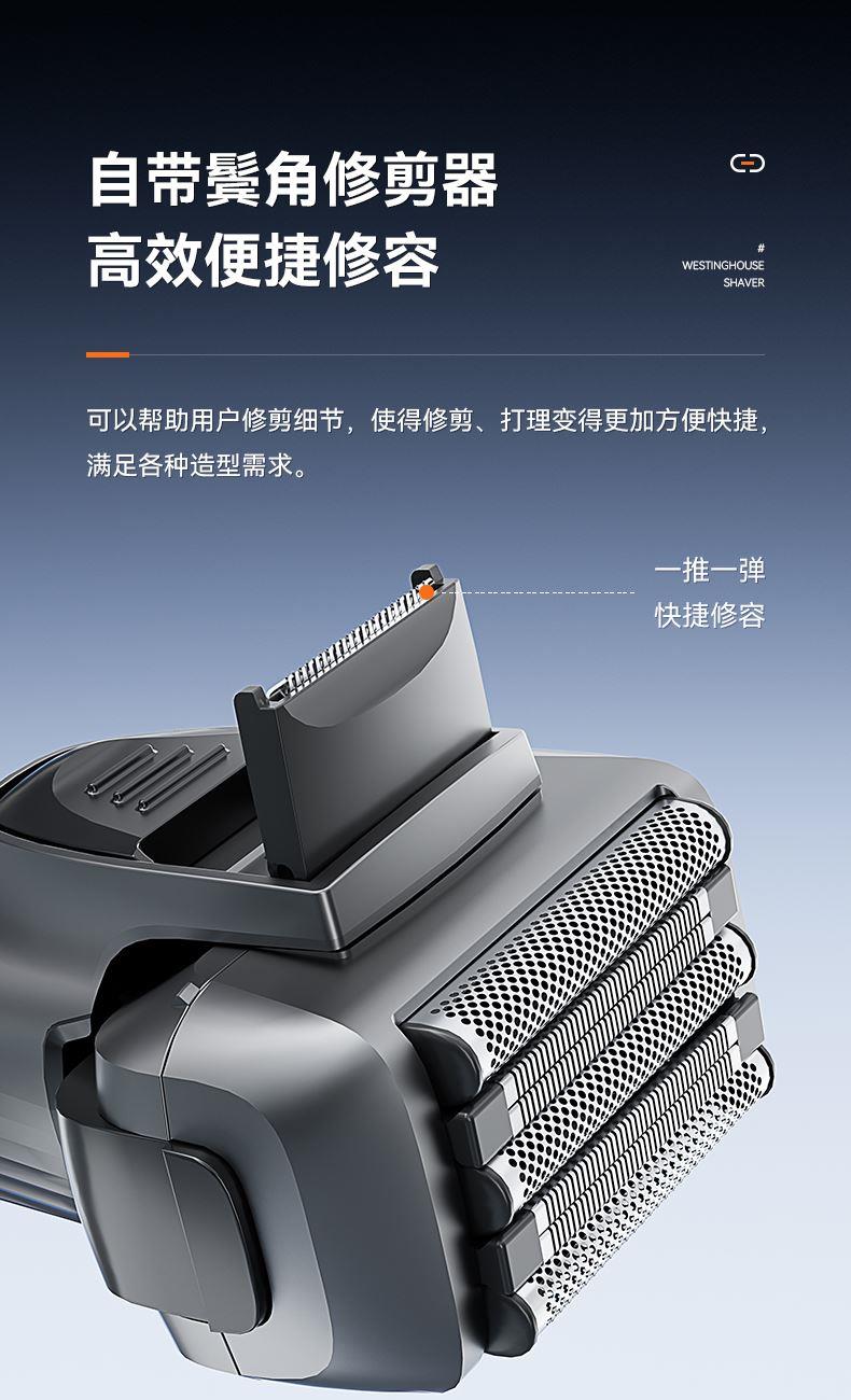 LED智能数显,运行实时掌控; 双档动力,适应各种胡须; 进口五刀头,深剃不留须; 全身防水,干湿两剃; 鬓角修剪器,满足长须修剪; 约100min超长续航。 产品附件:毛刷、USB充电线、保护盖