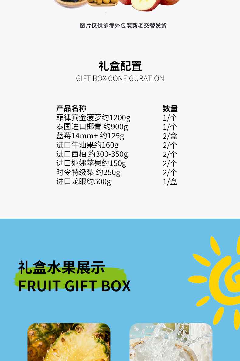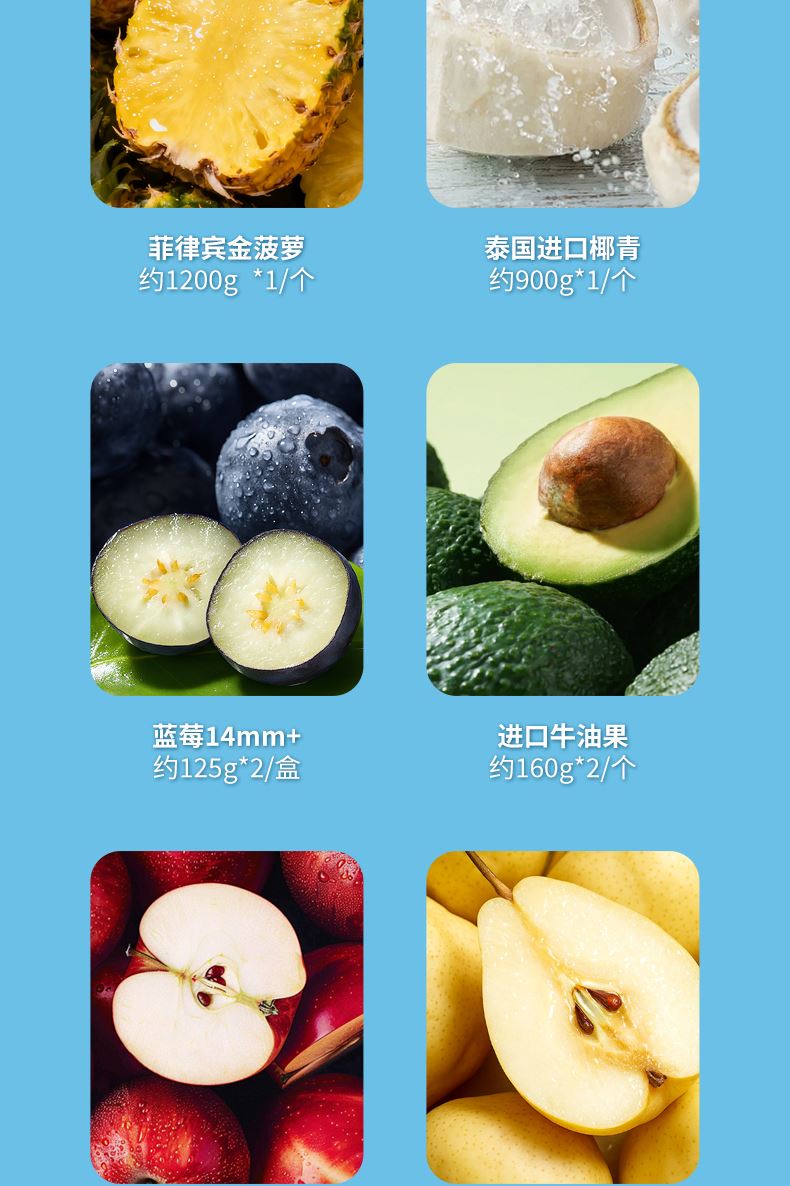 菲律宾金菠萝约1200g*1/个 泰国进口椰青 约900g*1/个 蓝莓14mm+ 约125g*2/盒 进口牛油果约160g*2/个 进口西柚 约300-350g*2/个 进口姬娜苹果约150g*2/个 时令特级梨 约250g*2/个 进口龙眼约500g*1/盒"