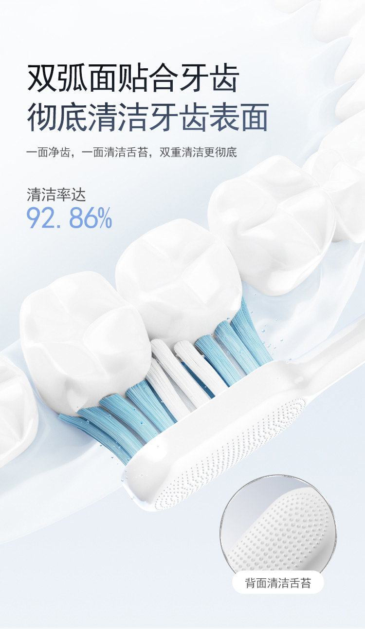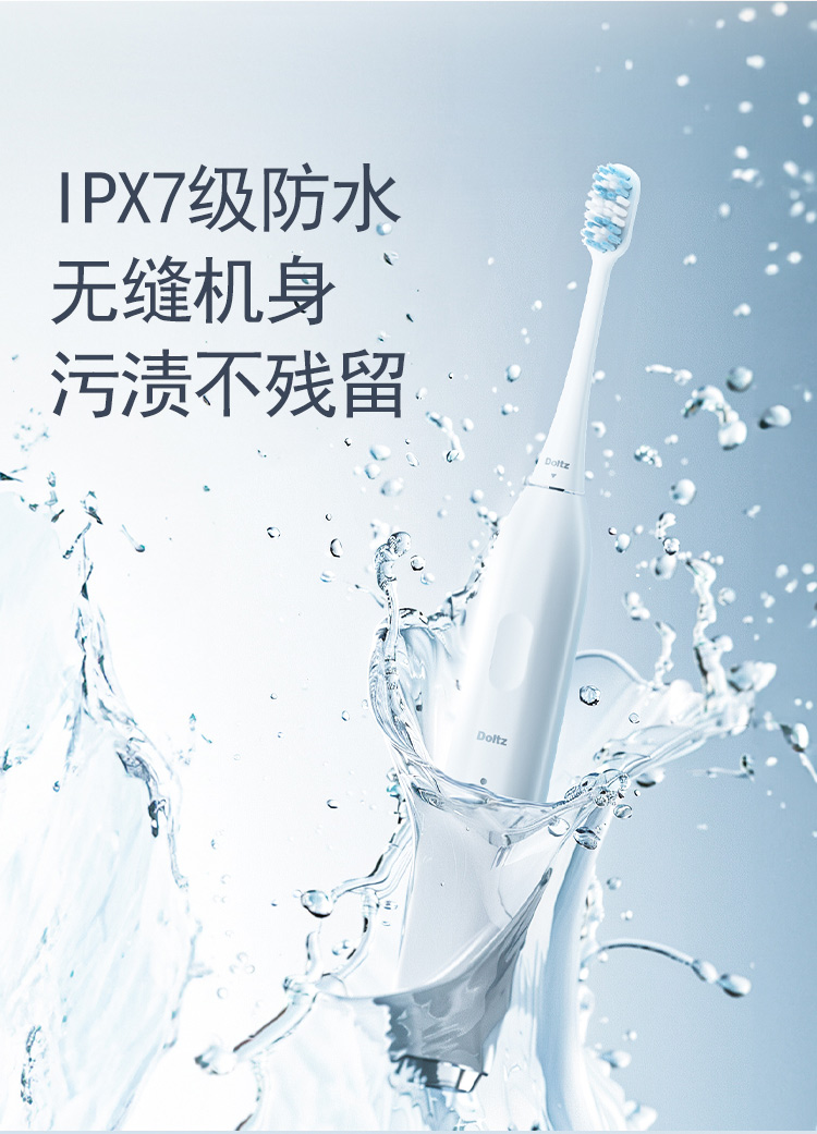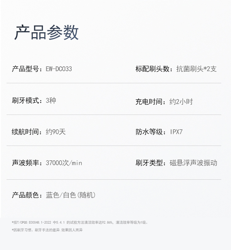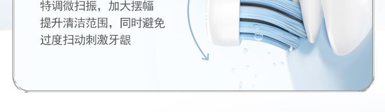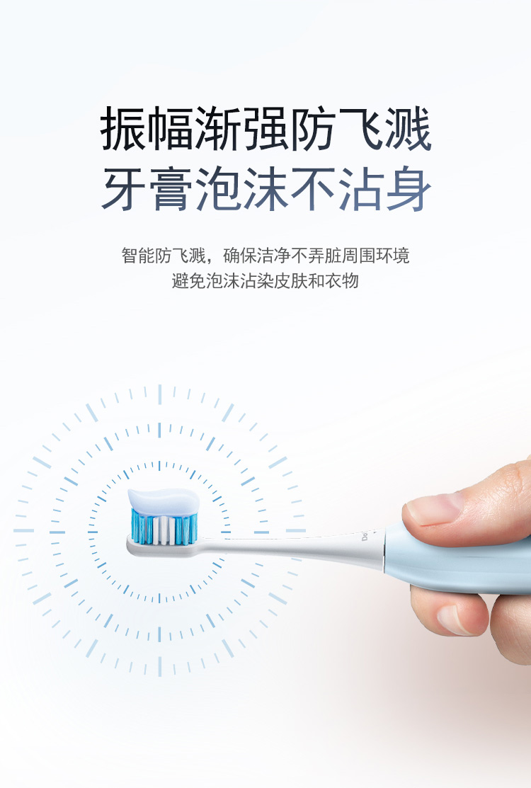 颜 色:蓝色、白色 产品尺寸:234*26*26mm 产品重量:90g 包装清单:主机*1、刷头*2、刷头保护盖*1、包装盒*1、说明书*1、充电线*1 三大清洁模式,定制口腔清洁; 智能溅强防飞溅,牙膏泡沫不沾身; 巴氏刷牙法机身设计,轻松掌握45°清洁牙龈; IPX7级防水,无缝机身,污渍不残留; 智能设计不盲刷,科学规划刷牙时间; 2小时快速充电,长效续航,支持2分钟闪充功能;
