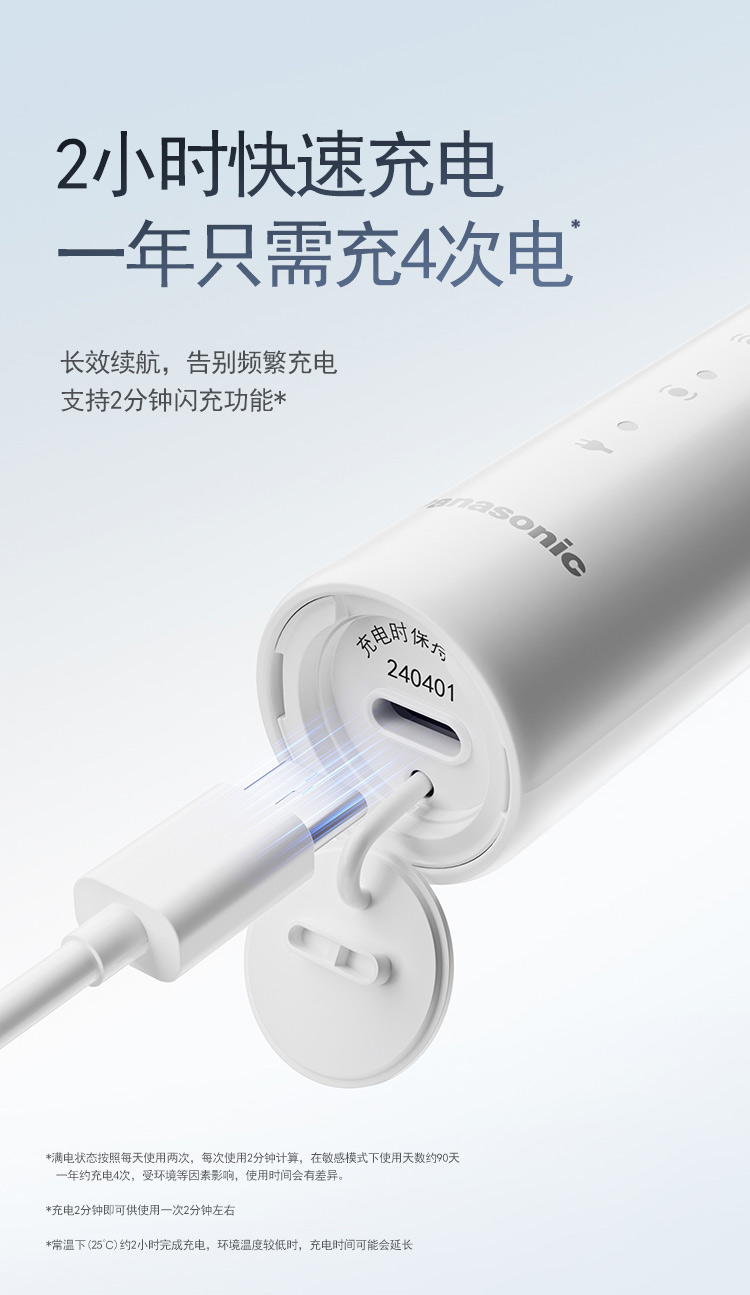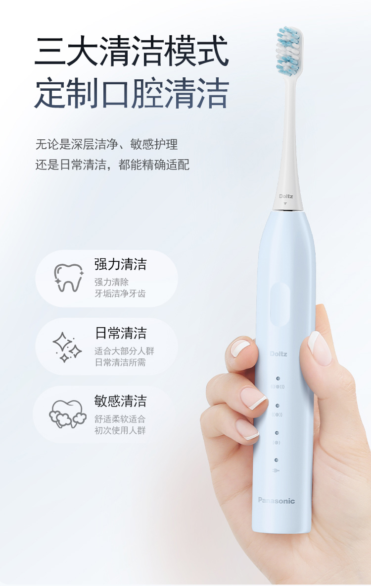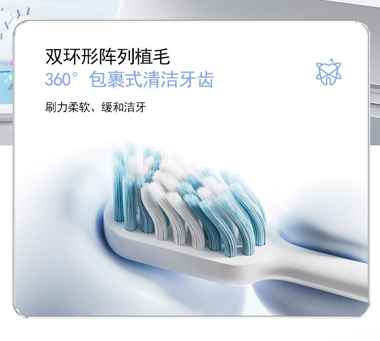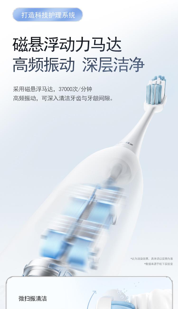 颜 色:蓝色、白色 产品尺寸:234*26*26mm 产品重量:90g 包装清单:主机*1、刷头*2、刷头保护盖*1、包装盒*1、说明书*1、充电线*1 三大清洁模式,定制口腔清洁; 智能溅强防飞溅,牙膏泡沫不沾身; 巴氏刷牙法机身设计,轻松掌握45°清洁牙龈; IPX7级防水,无缝机身,污渍不残留; 智能设计不盲刷,科学规划刷牙时间; 2小时快速充电,长效续航,支持2分钟闪充功能;