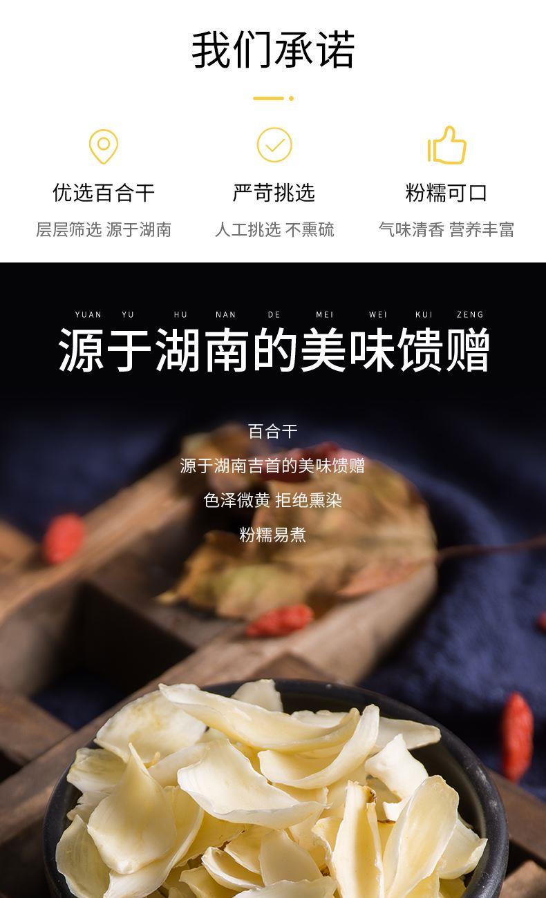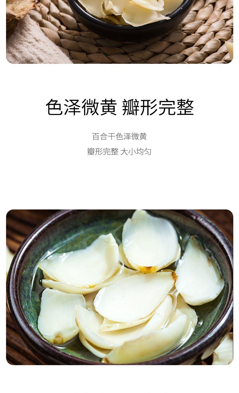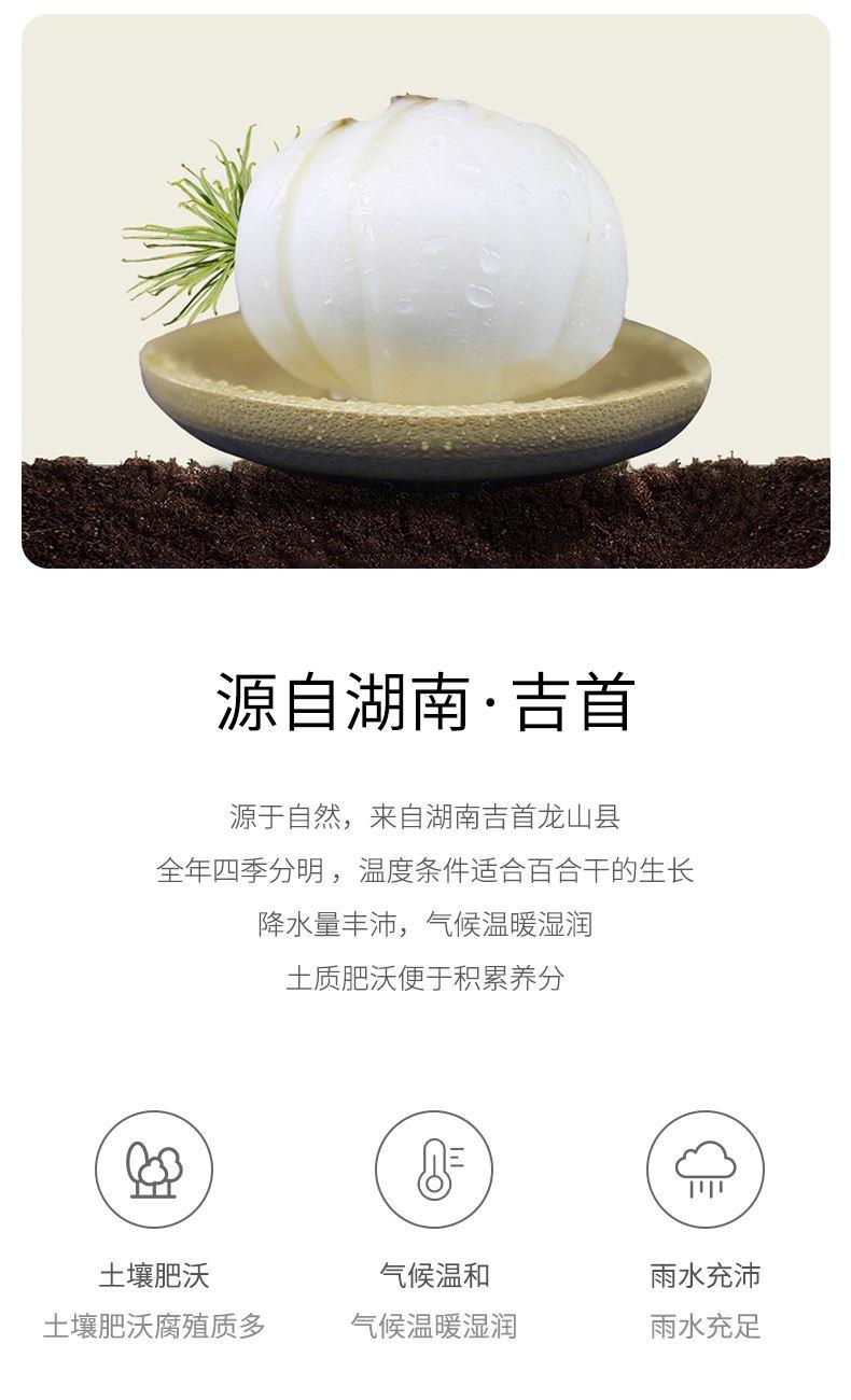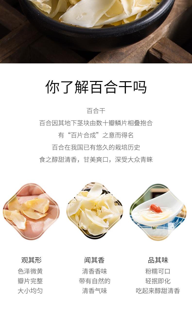 配料:百合干 原料产地:湖南省龙山县 净含量:150克 保质期:12个月 生产日期:见包装物打印处 食用方法:用清水浸泡回软洗净后,可炖、炒、烩。 百合因其他地下茎块由数十瓣鳞片相叠抱合,有“百片合成”之意而得名。百合在我国已有悠久的栽培历史、食之醇甜清香、甘美爽口,深受大众青睐。