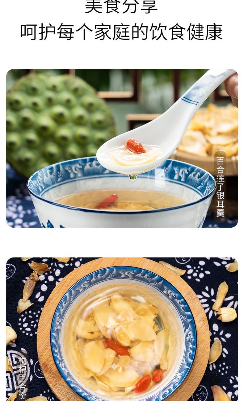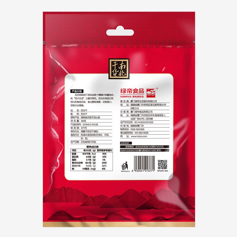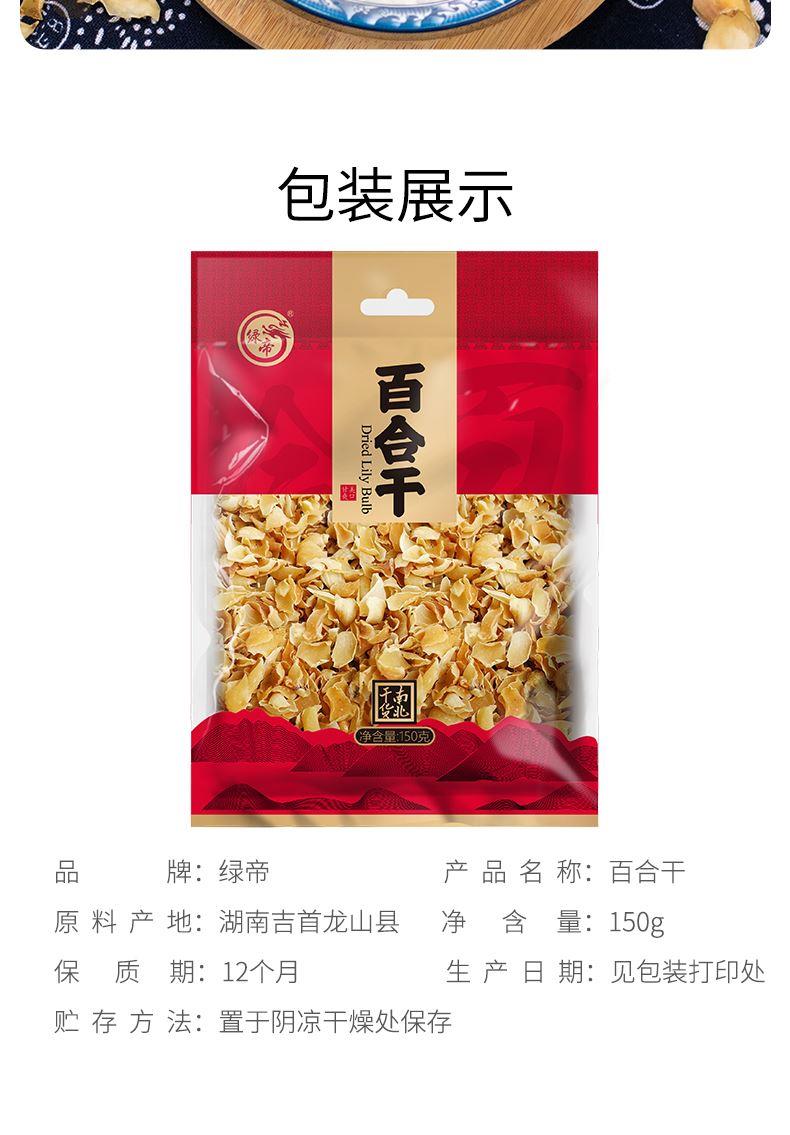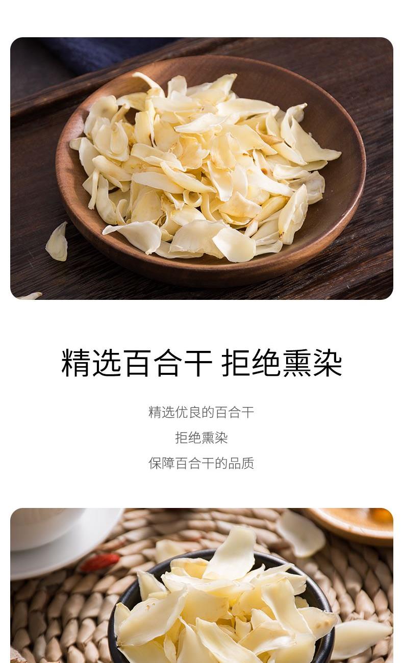 配料:百合干 原料产地:湖南省龙山县 净含量:150克 保质期:12个月 生产日期:见包装物打印处 食用方法:用清水浸泡回软洗净后,可炖、炒、烩。 百合因其他地下茎块由数十瓣鳞片相叠抱合,有“百片合成”之意而得名。百合在我国已有悠久的栽培历史、食之醇甜清香、甘美爽口,深受大众青睐。