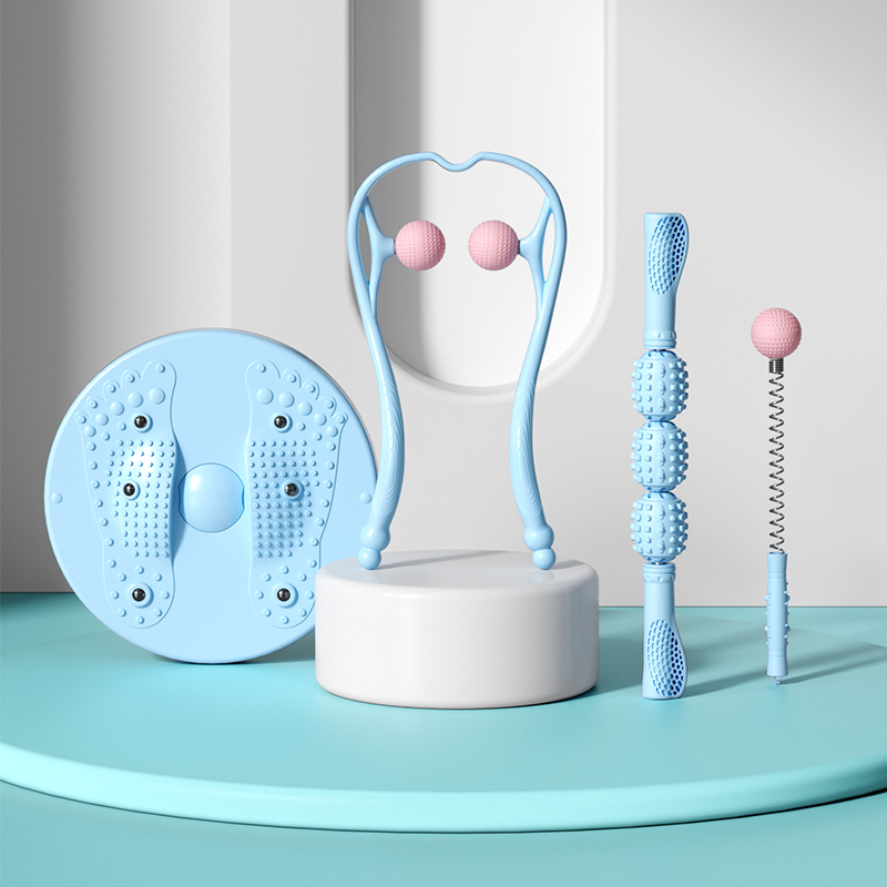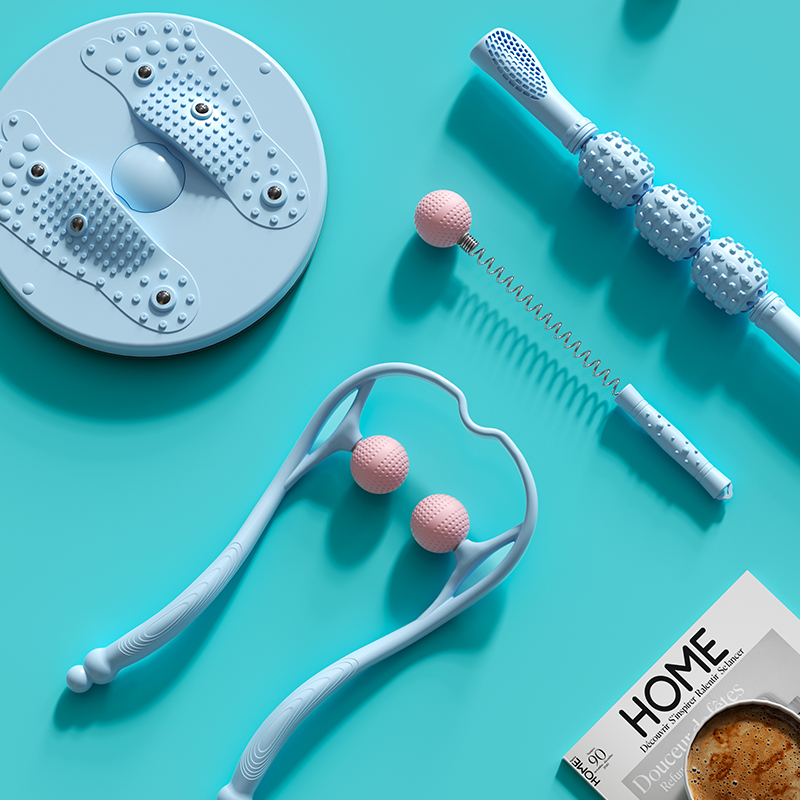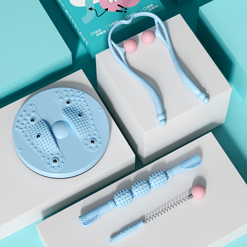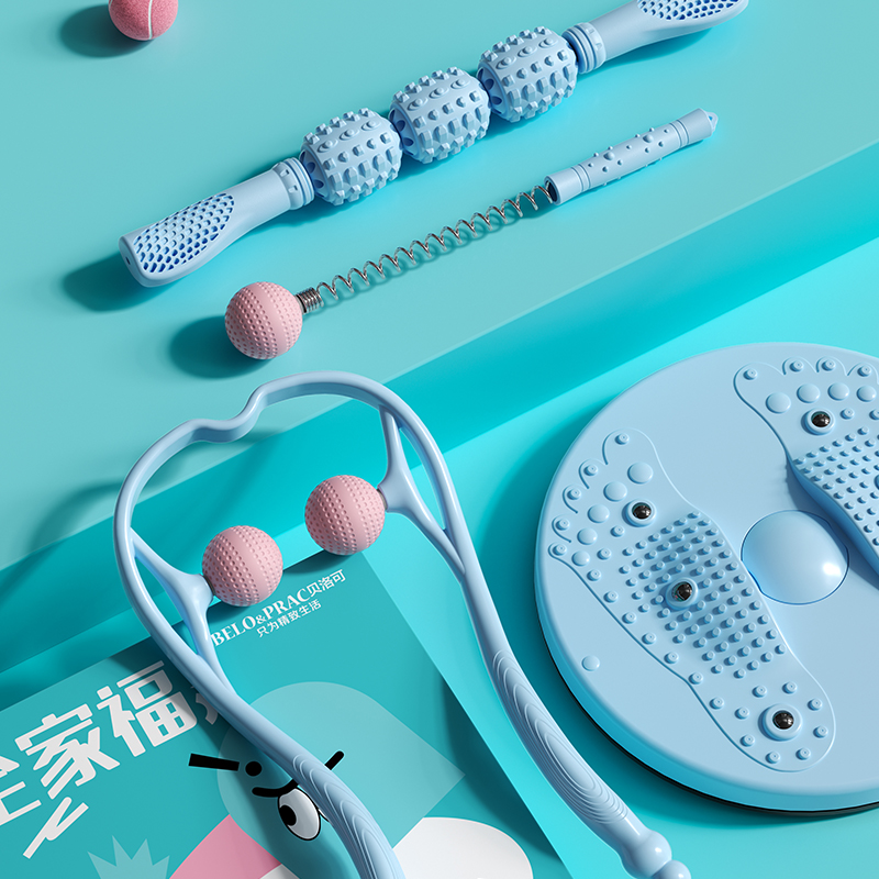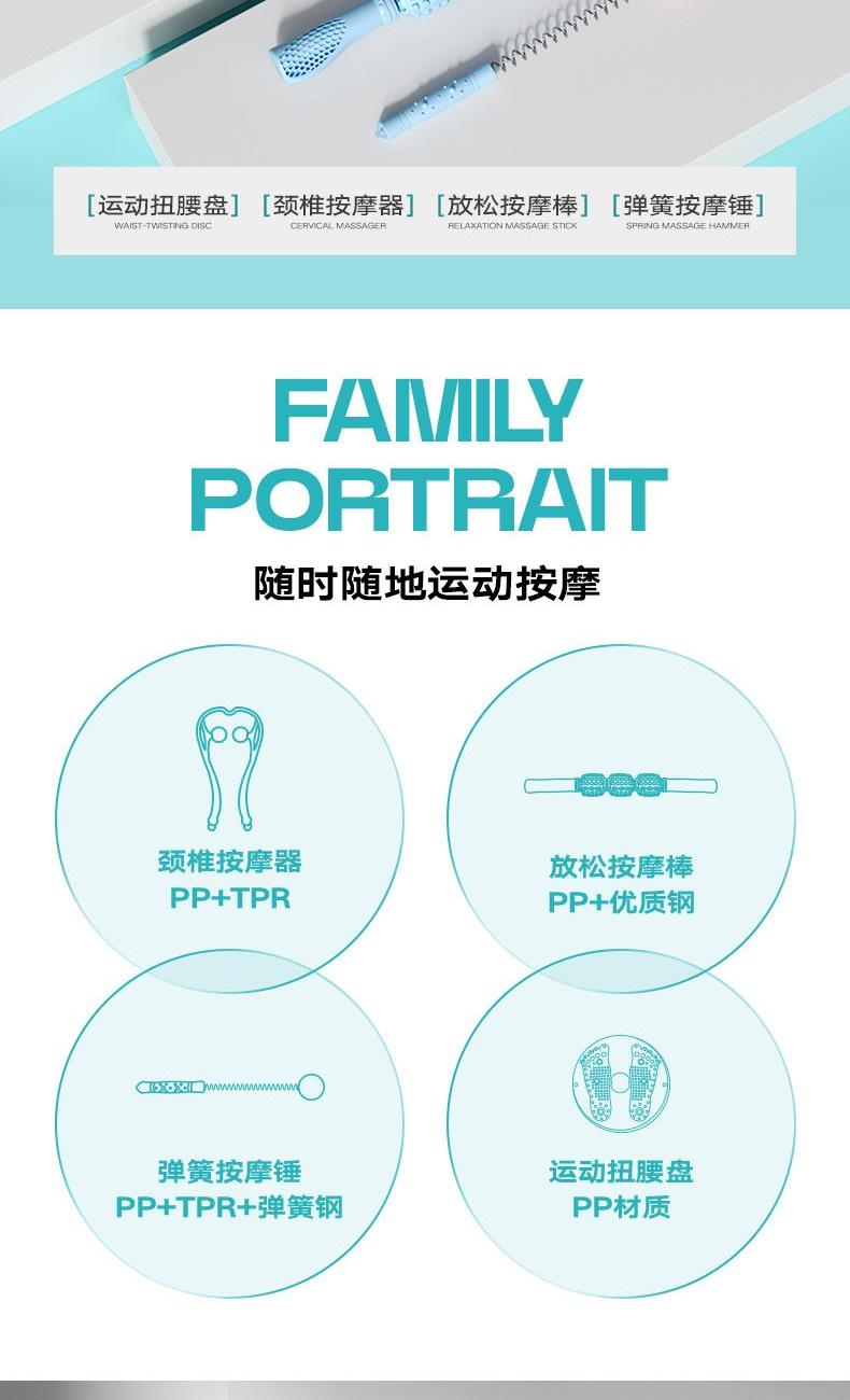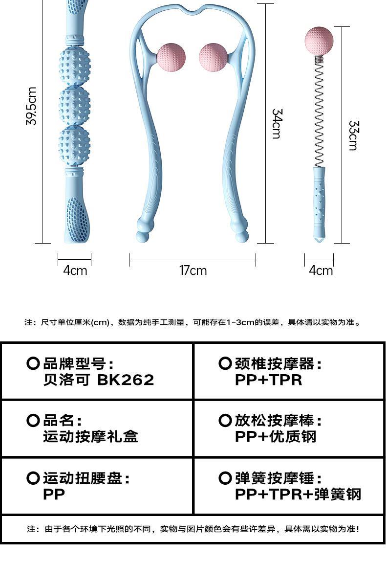 运动按摩礼盒,按摩瘦身,一盒搞定 多种选择,多种场景适用,居家、办公都适宜用 磁石扭腰盘, 磁珠镶嵌3D颗粒,密集凸点,有效刺激足底,贴合脚掌弧度设计。 颈椎按摩器:圆弧设计更贴合颈部, 受力舒爽, 角度自由把控。 放松按摩棒:滚动按摩,缓解疲劳,全身可用,不锈钢转轴,坚固受力。 弹簧按摩锤:筋络按摩锤,优质柔软圆球,触感舒适 运动扭腰盘:PP 颈椎按摩器:PP+TPR 放松按摩棒:PP+优质钢 弹簧按摩锤:PP+TPR+弹簧钢 彩盒尺寸:41*11*28.5cm 外箱尺寸:56.5*42*59cm