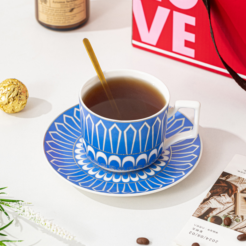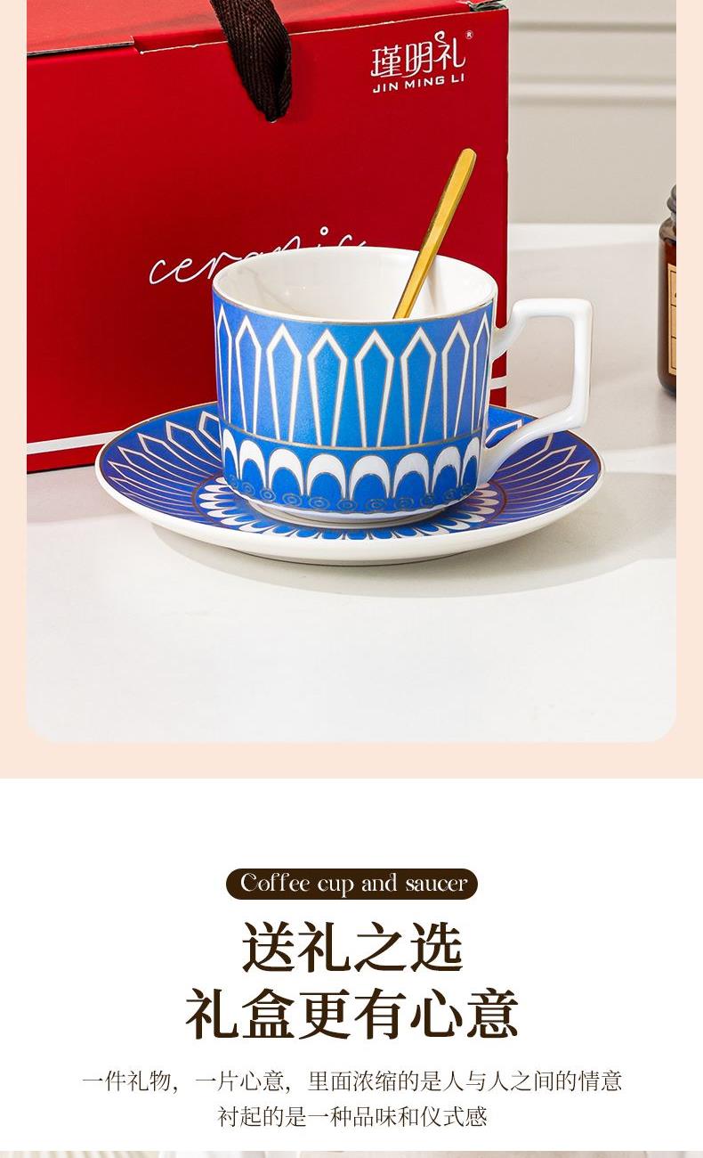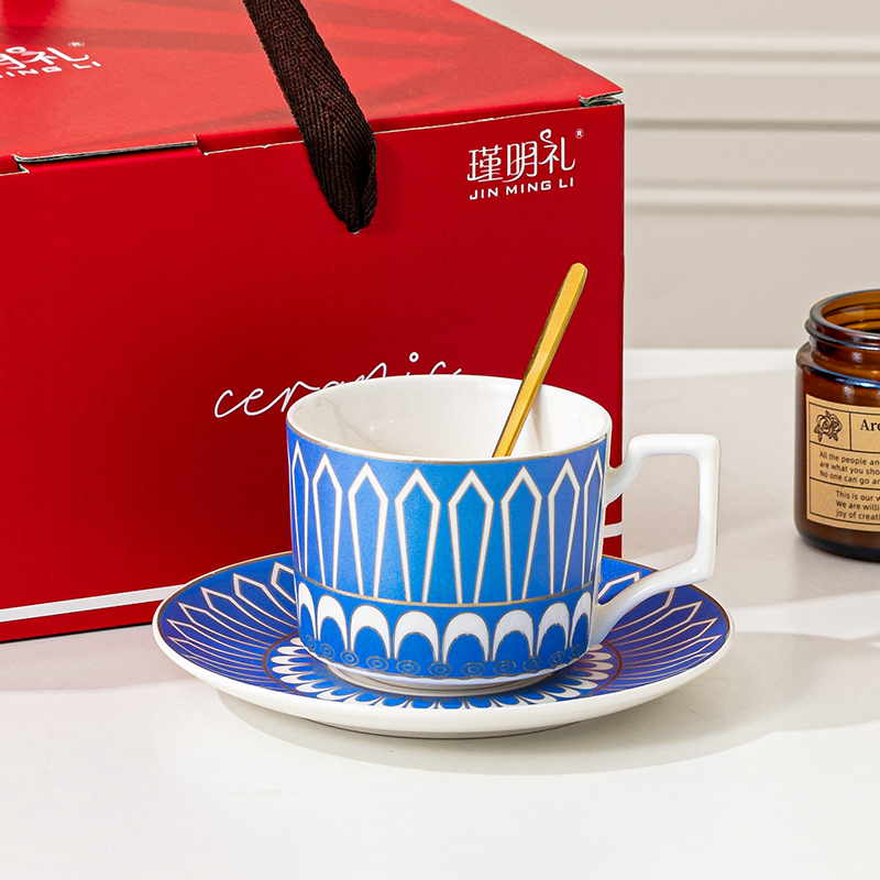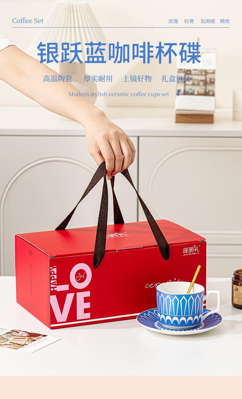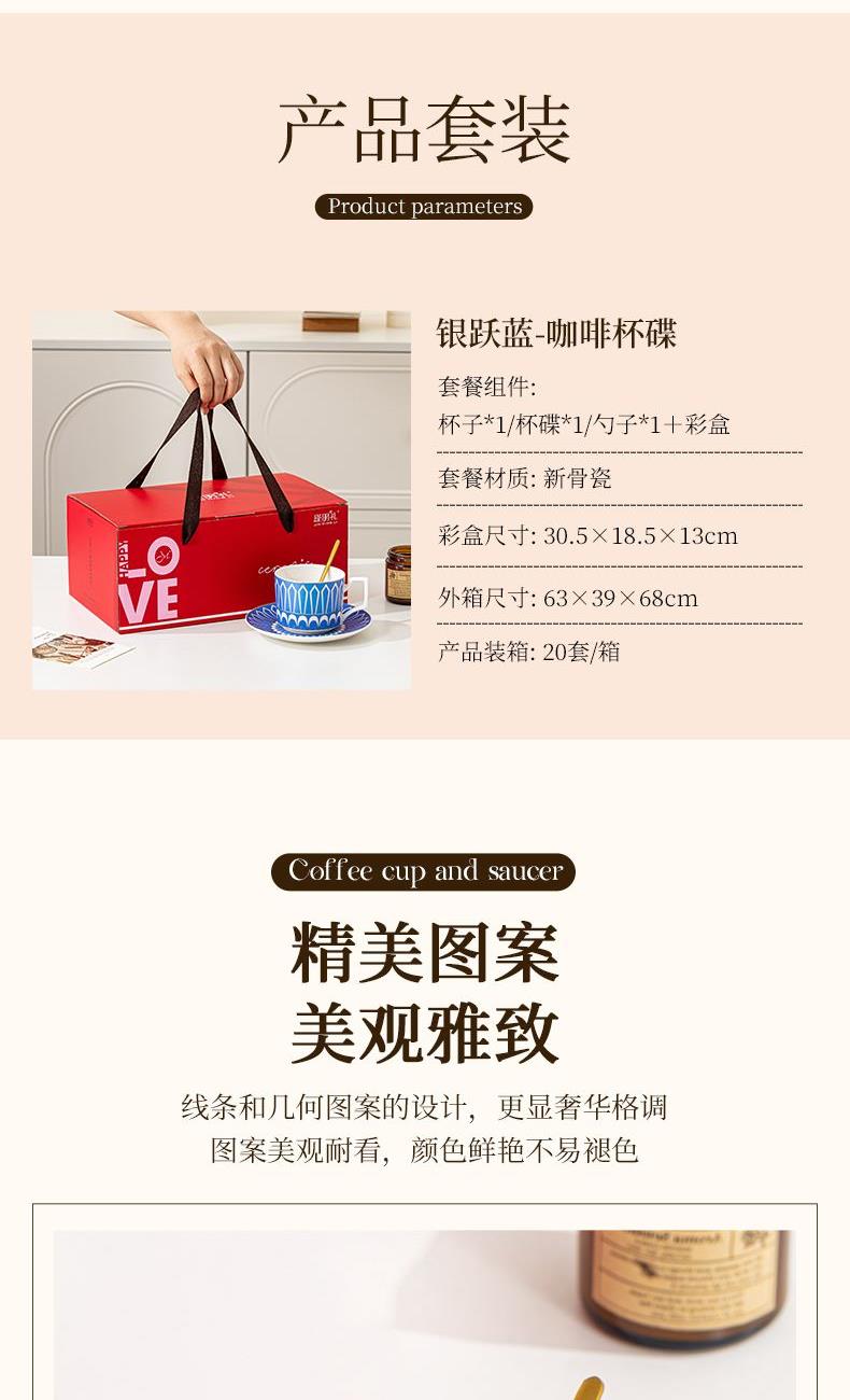 瑾明礼-银跃蓝-咖啡杯碟-1杯1碟1勺 - 产品组成:整套=1杯1碟1勺+彩盒 产品材质:新骨瓷 产品规格:咖啡杯=口径8.5cm,高度6.8cm,容量240ml;碟=直径15cm,高2cm;金勺=长度13cm; 彩盒尺寸:30.5*18.5*13cm 产品毛重:0.8kg 整箱毛重:18kg 外箱尺寸:63*39*68cm - 线条和几何形状的设计往往带有一种抽象艺术的风格,能够满足消费者对于时尚和艺术的追求。这种设计不仅适合现代家居环境,还能成为时尚人士展示个性的单品。