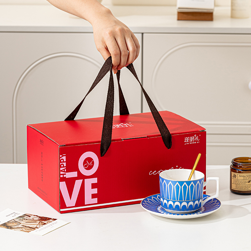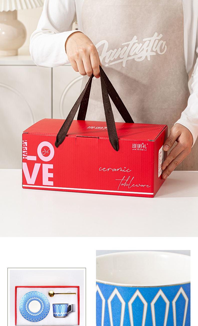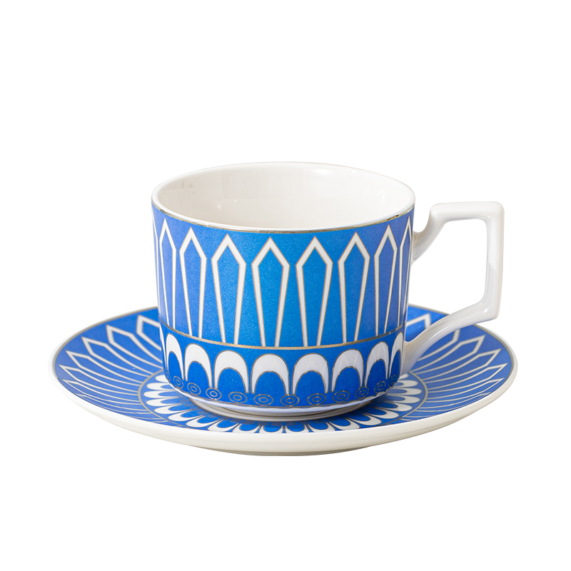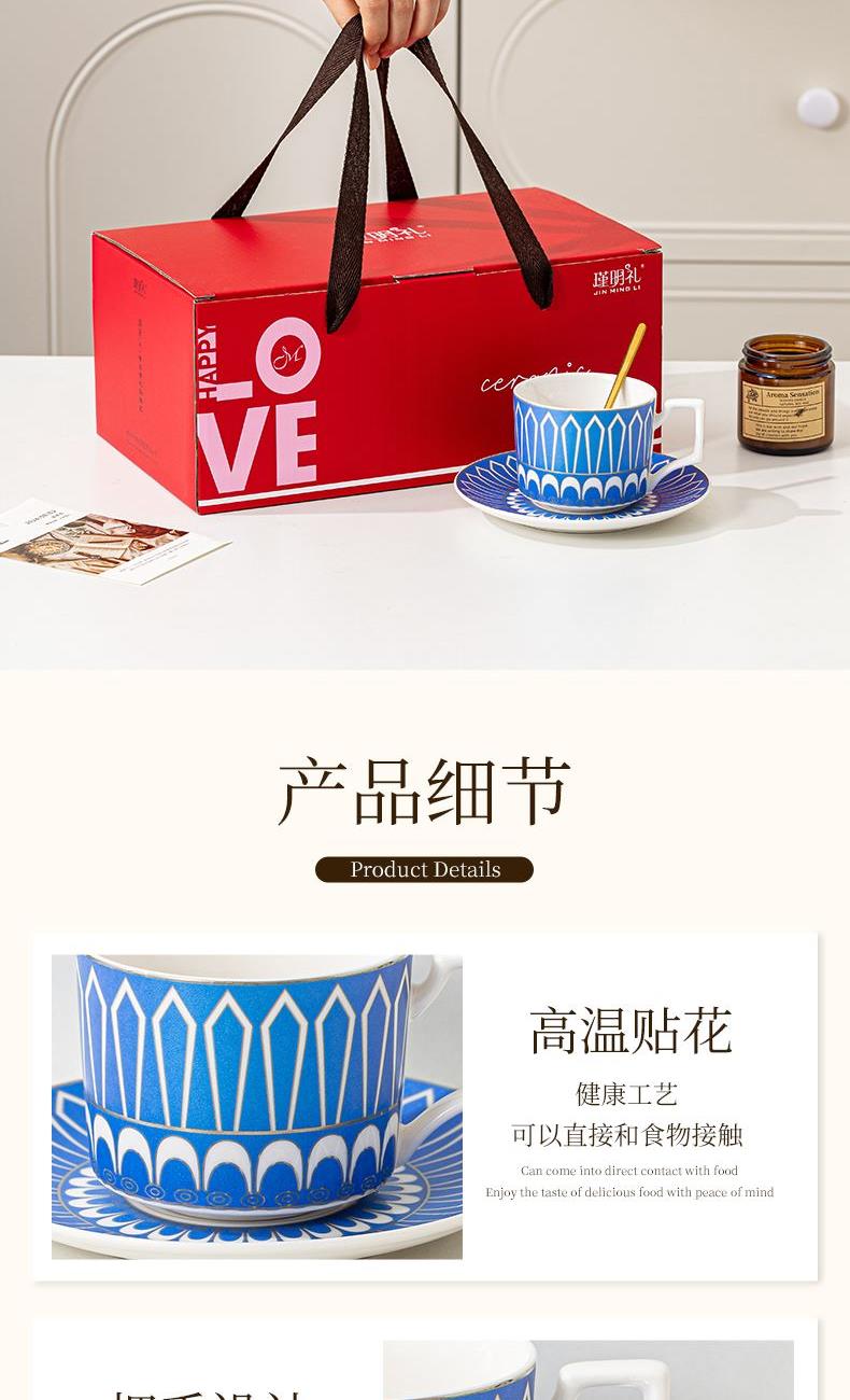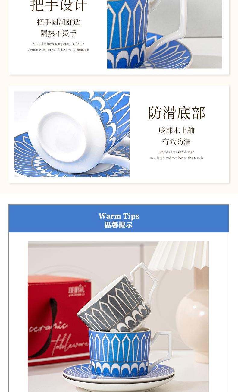 瑾明礼-银跃蓝-咖啡杯碟-1杯1碟1勺 - 产品组成:整套=1杯1碟1勺+彩盒 产品材质:新骨瓷 产品规格:咖啡杯=口径8.5cm,高度6.8cm,容量240ml;碟=直径15cm,高2cm;金勺=长度13cm; 彩盒尺寸:30.5*18.5*13cm 产品毛重:0.8kg 整箱毛重:18kg 外箱尺寸:63*39*68cm - 线条和几何形状的设计往往带有一种抽象艺术的风格,能够满足消费者对于时尚和艺术的追求。这种设计不仅适合现代家居环境,还能成为时尚人士展示个性的单品。