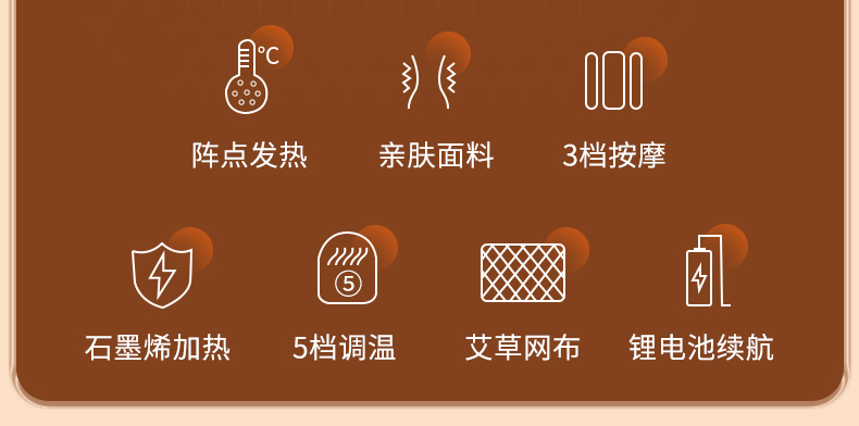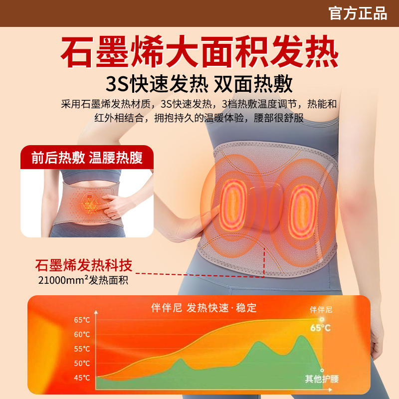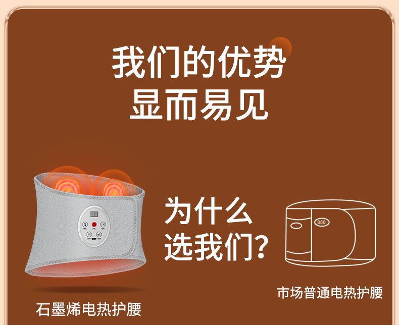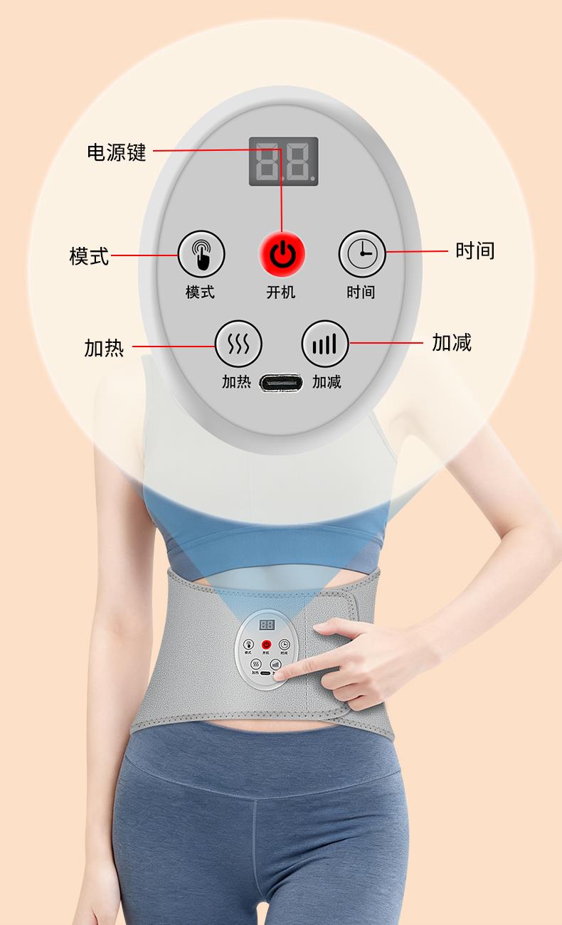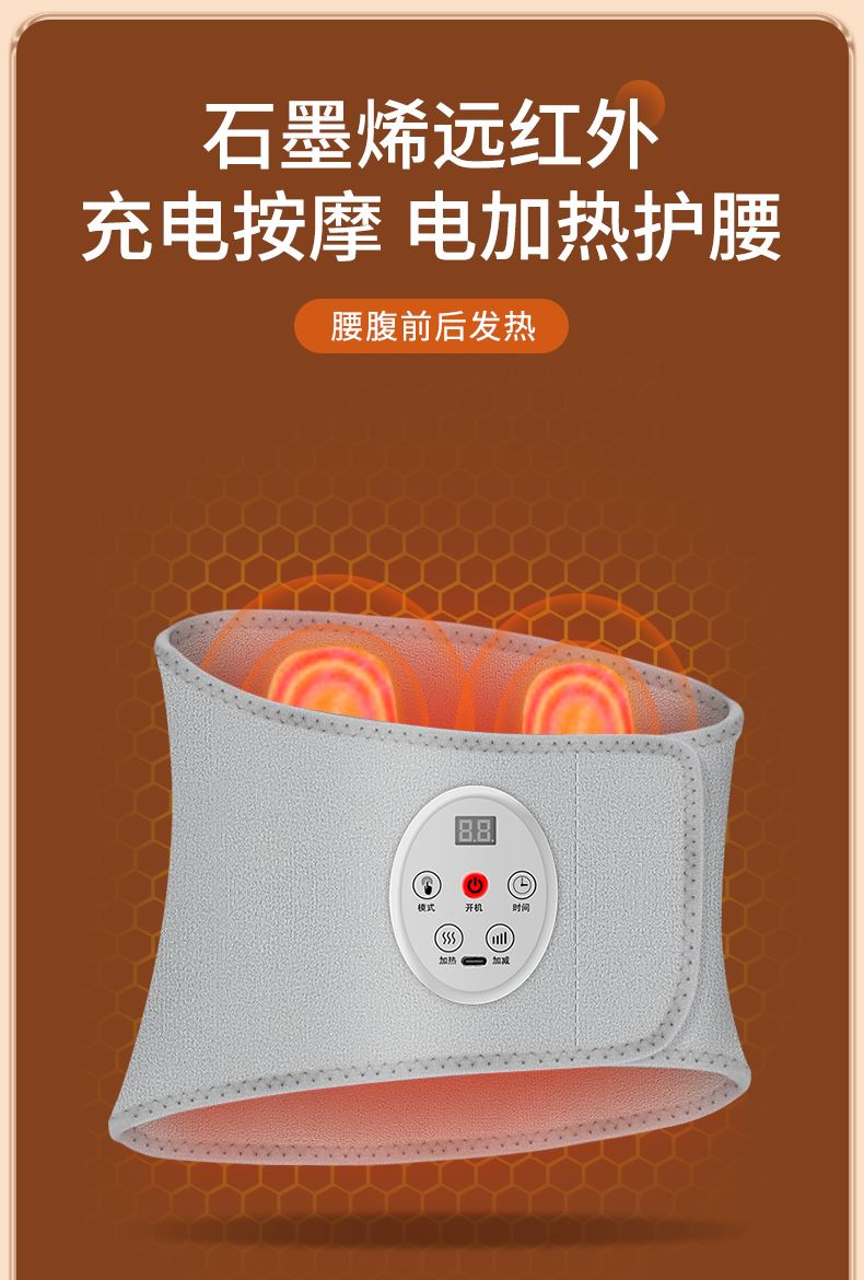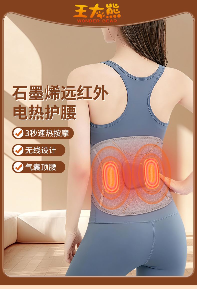 产品型号:WD-H3 产品材质:OK布 输 入:5V⎓1A 产品尺寸:102*22cm 电池容量 :5000mAh 五档温度热敷,整个腰暖暖的 腰腹前后大面积发热,暖腰暖宫暖胃暖肚子 腰部双气囊顶腰牵引拉伸,腰椎护理 5000mAh蓄电池设计,耐用续航