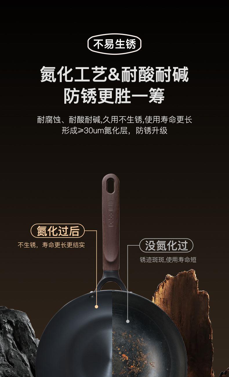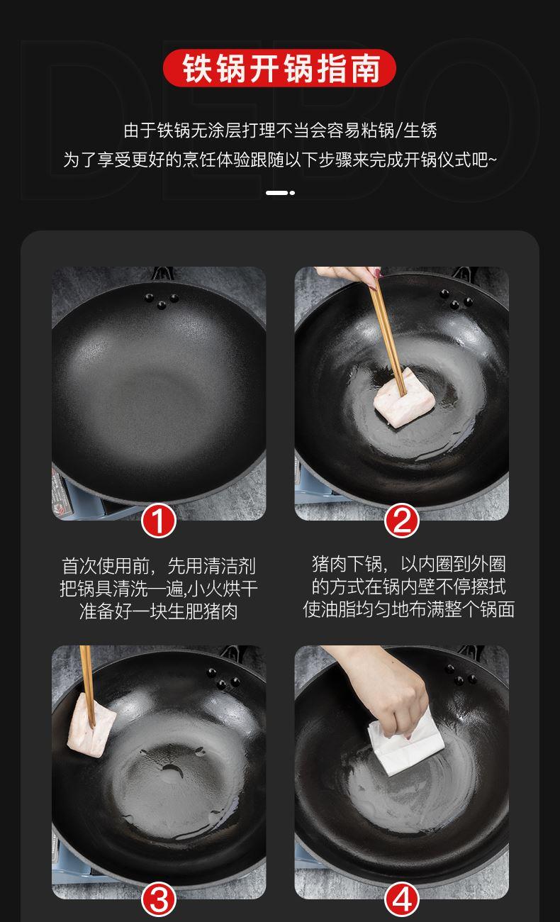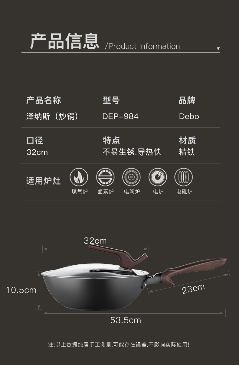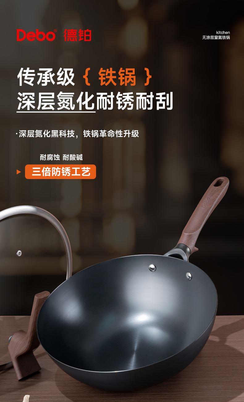 型号:DEP-984 口径:32cm 容量:5L 材质:精铁 包装尺寸:535*135*335mm 配置:锅身*1、玻璃盖*1 1. 采用深层液氮处理工艺,为锅身加上一层紧密的防锈保护屏障,增加耐磨抗腐蚀性; 2. 厚底薄壁,导热均匀,畅快爆炒,轻松翻炒一道菜; 3. 可立式锅盖,能稳稳立在台面,不占地,随手一放方便整洁; 4. 舒适握感手柄,贴合手感设计,握感饱满更舒服; 5. 精工制作,锅体极具质感,精致美观。