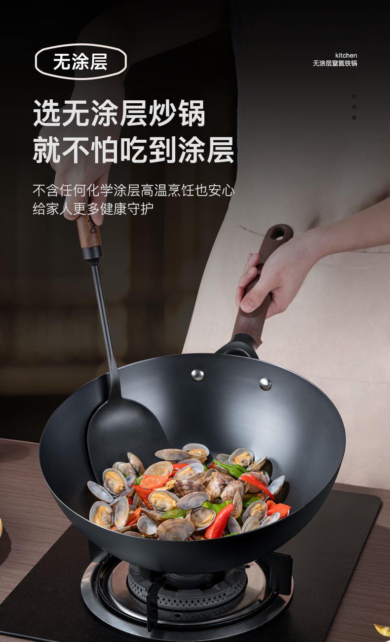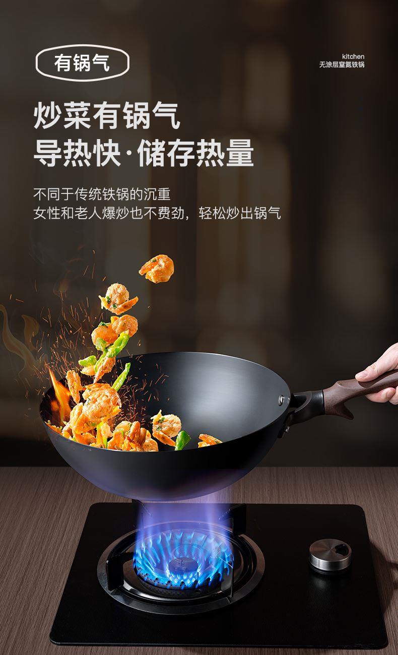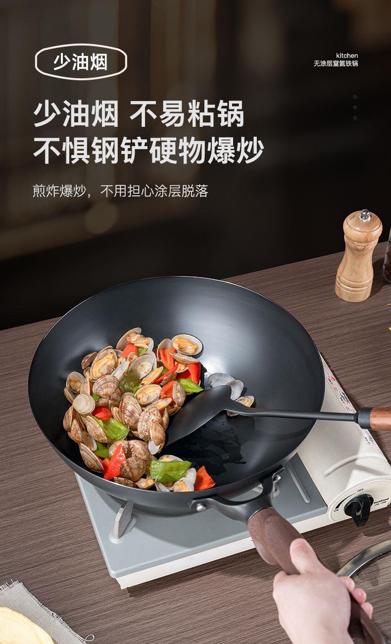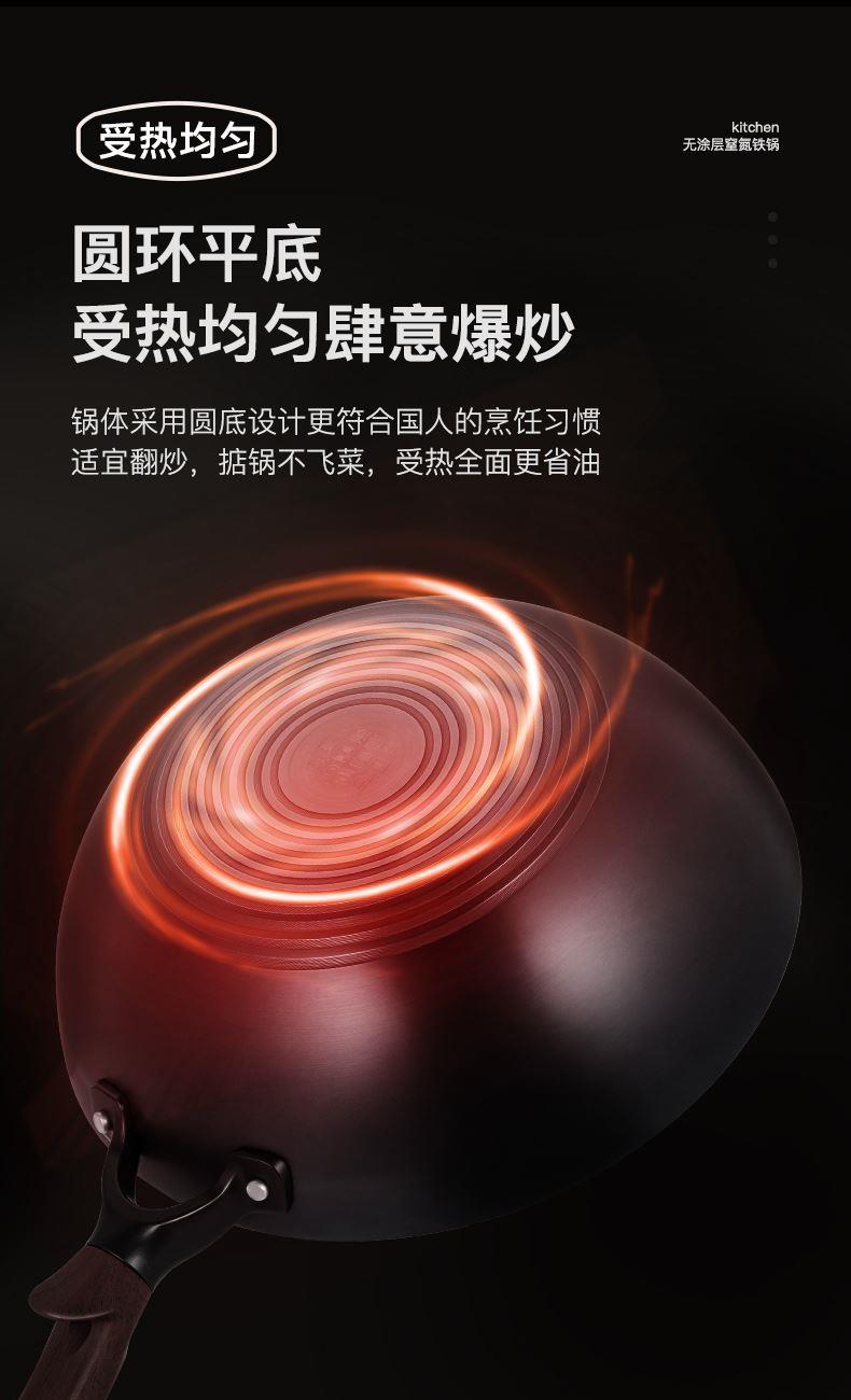 型号:DEP-984 口径:32cm 容量:5L 材质:精铁 包装尺寸:535*135*335mm 配置:锅身*1、玻璃盖*1 1. 采用深层液氮处理工艺,为锅身加上一层紧密的防锈保护屏障,增加耐磨抗腐蚀性; 2. 厚底薄壁,导热均匀,畅快爆炒,轻松翻炒一道菜; 3. 可立式锅盖,能稳稳立在台面,不占地,随手一放方便整洁; 4. 舒适握感手柄,贴合手感设计,握感饱满更舒服; 5. 精工制作,锅体极具质感,精致美观。