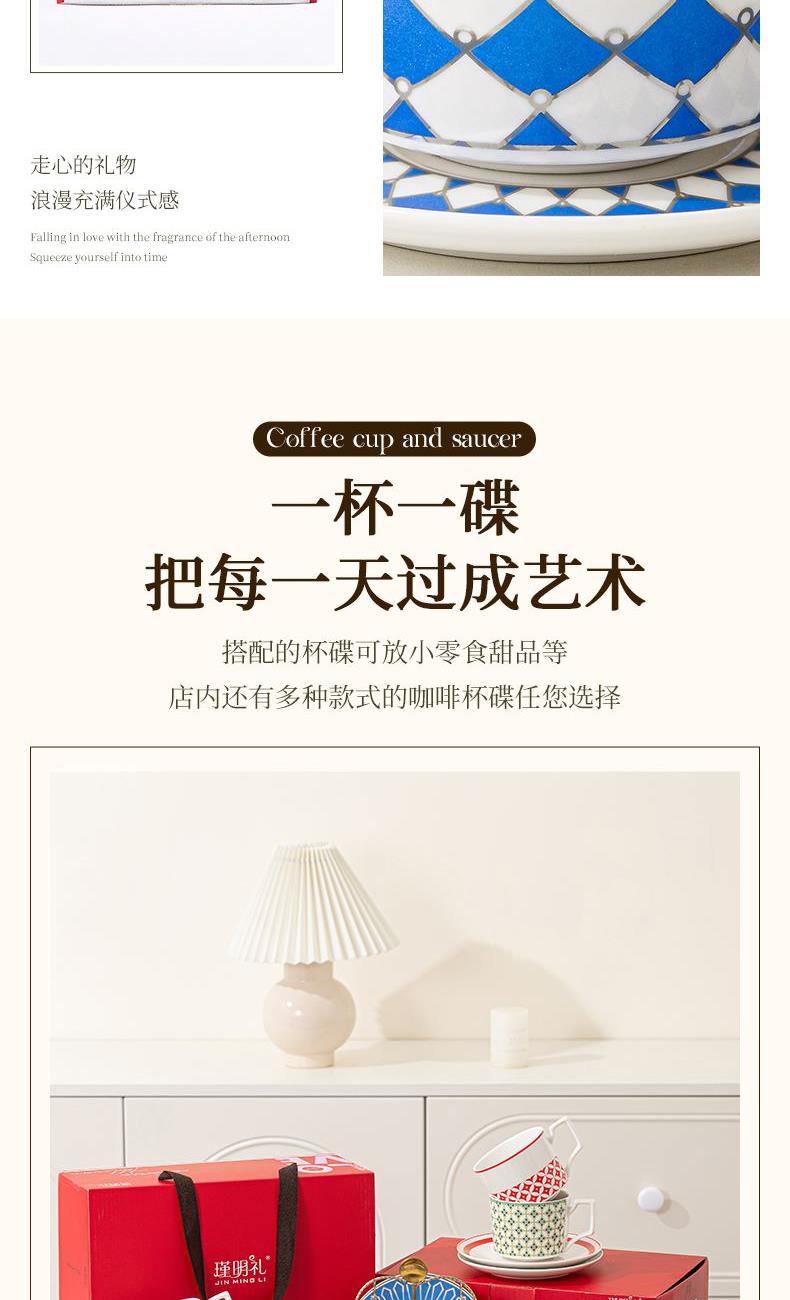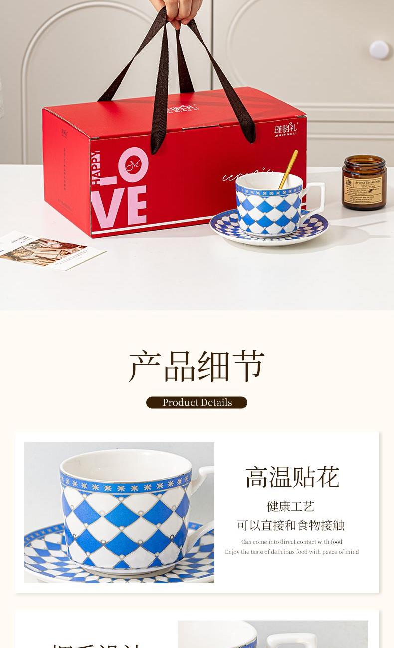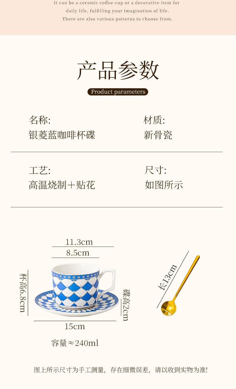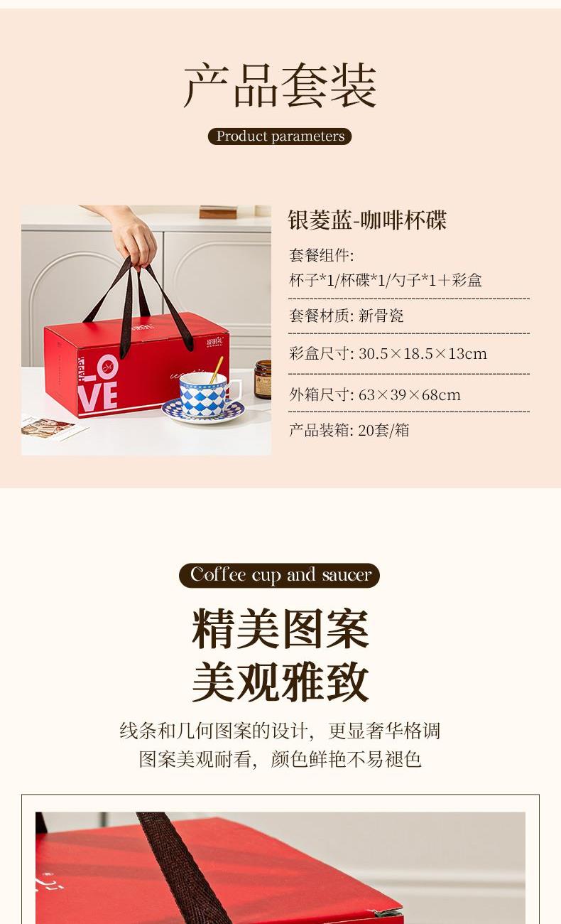 瑾明礼-银菱蓝-咖啡杯碟-1杯1碟1勺 - 产品组成:整套=1杯1碟1勺+彩盒 产品材质:新骨瓷 产品规格:咖啡杯=口径8.5cm,高度6.8cm,容量240ml;碟=直径15cm,高2cm;金勺=长度13cm; 彩盒尺寸:30.5*18.5*13cm 产品毛重:0.8kg 整箱毛重:18kg 外箱尺寸:63*39*68cm - 线条和几何形状的设计往往带有一种抽象艺术的风格,能够满足消费者对于时尚和艺术的追求。这种设计不仅适合现代家居环境,还能成为时尚人士展示个性的单品。
