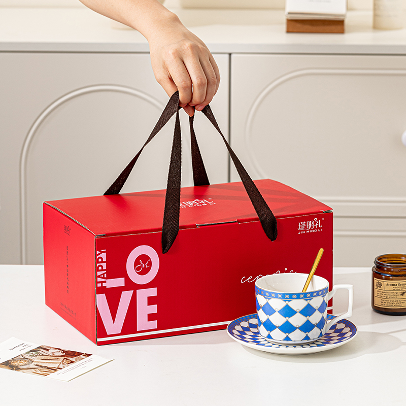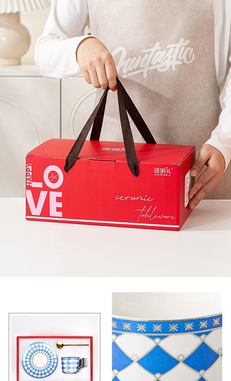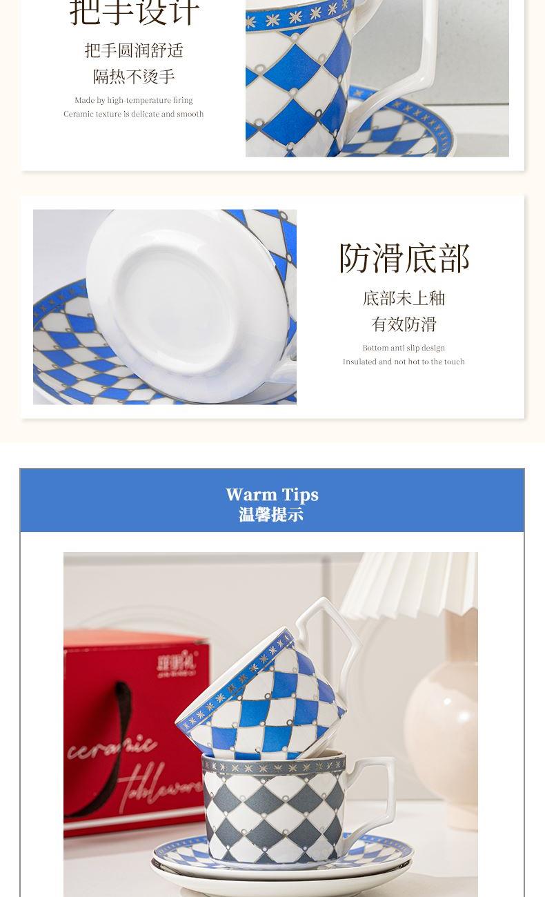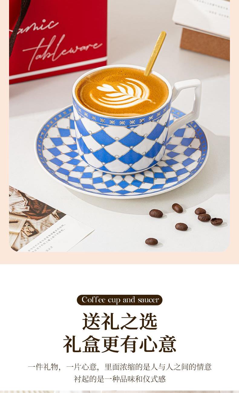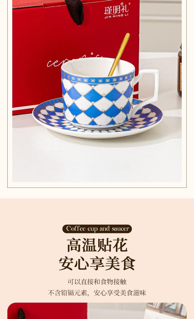 瑾明礼-银菱蓝-咖啡杯碟-1杯1碟1勺 - 产品组成:整套=1杯1碟1勺+彩盒 产品材质:新骨瓷 产品规格:咖啡杯=口径8.5cm,高度6.8cm,容量240ml;碟=直径15cm,高2cm;金勺=长度13cm; 彩盒尺寸:30.5*18.5*13cm 产品毛重:0.8kg 整箱毛重:18kg 外箱尺寸:63*39*68cm - 线条和几何形状的设计往往带有一种抽象艺术的风格,能够满足消费者对于时尚和艺术的追求。这种设计不仅适合现代家居环境,还能成为时尚人士展示个性的单品。