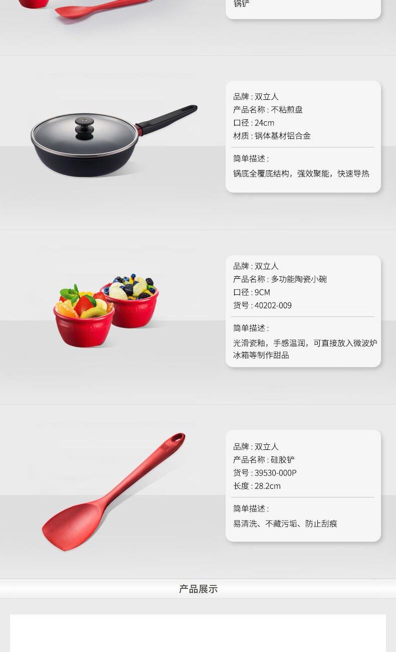货号:1022029 产品包含:24cm不粘煎炒锅1个,多功能陶瓷小碗2件 ,28cm硅胶铲1个 尺寸约: 煎炒锅直径:24cm 硅胶铲 28.2CM 陶瓷小碗 :9CM 锅材质:铝合金锅身+玻璃锅盖 产品重量:3.2kg 产品组成及介绍: 1、24cm不粘煎炒锅 : 煎炒真不粘,全覆底结构,导热均匀、轻松烹饪。方便易洁,省时省力。 2、 多功能陶瓷小碗两件 :光滑瓷釉,手感温润,可直接放入微波炉冰箱等制作甜品 3、 搭配小号 硅胶铲,高温耐热,不粘锅专用,防止刮痕,食品接触级硅胶安全健康 4、 适用于电磁炉、电陶炉、卤素炉、燃气灶。