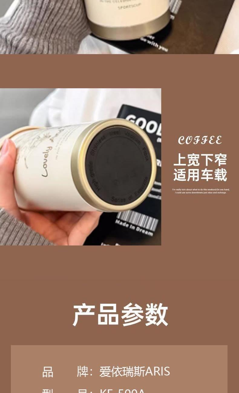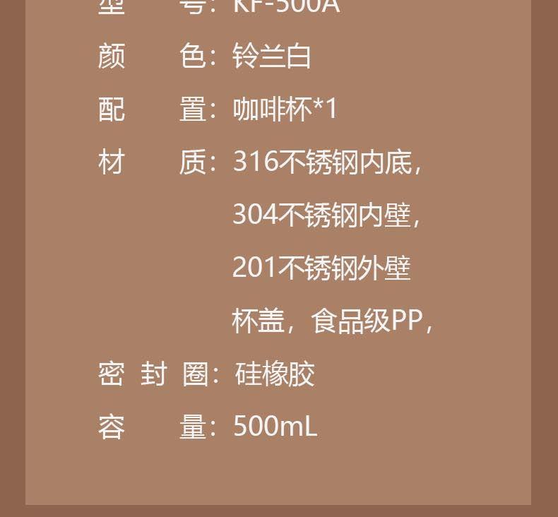 品 牌:爱依瑞斯ARIS 型 号:KF-500A 颜 色:铃兰白 配 置:咖啡杯*1 材 质:316不锈钢内底,304不锈钢内壁,201不锈钢外壁 杯盖,食品级PP,密封圈:硅橡胶 容 量:500mL 产品尺寸:65*190mm 产品特点 1、保温杯超大容量:500ml大容量,轻松完成当日补水kpi! 2、一盖双饮,喝出花样。 3、保温保冷,便携提绳。 4、上宽下窄,适用车载。