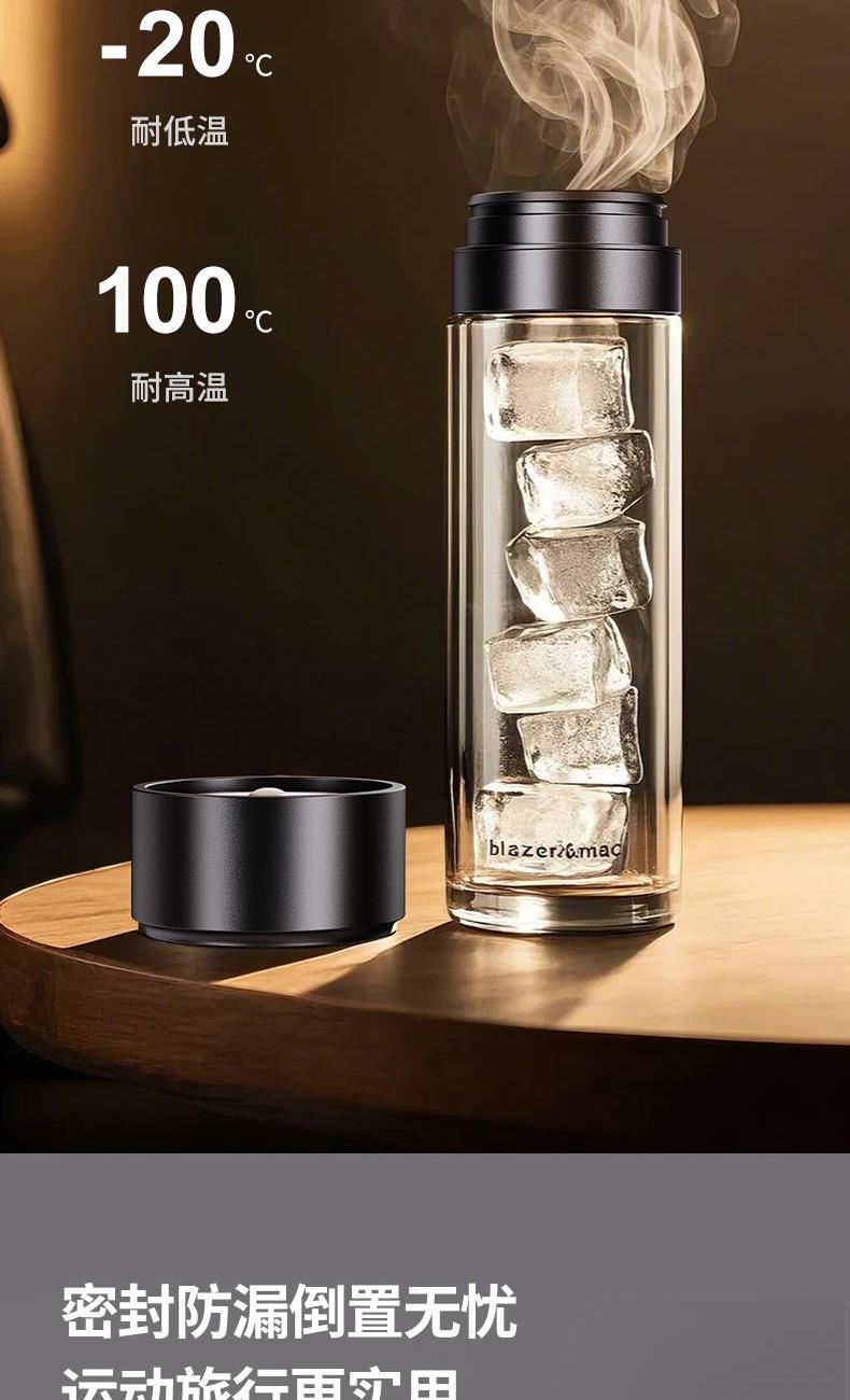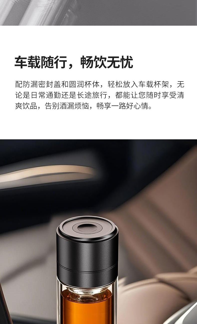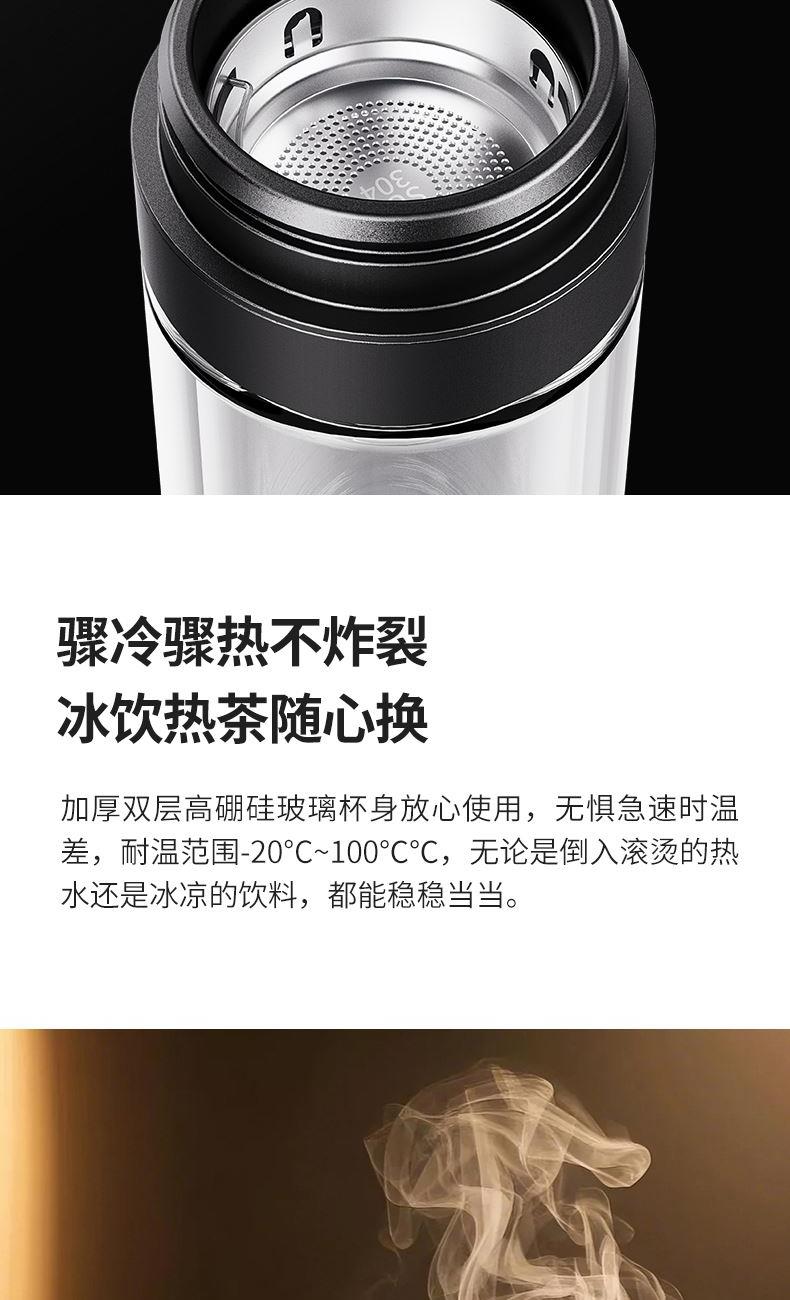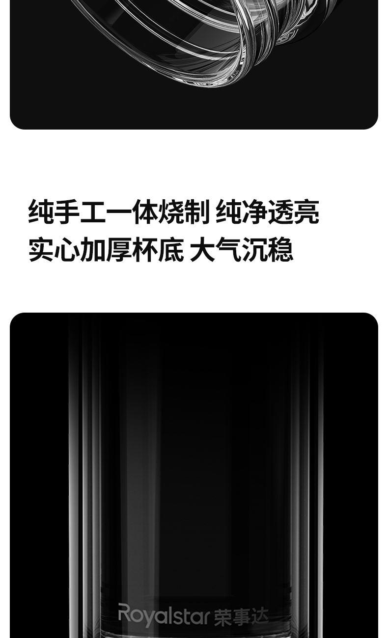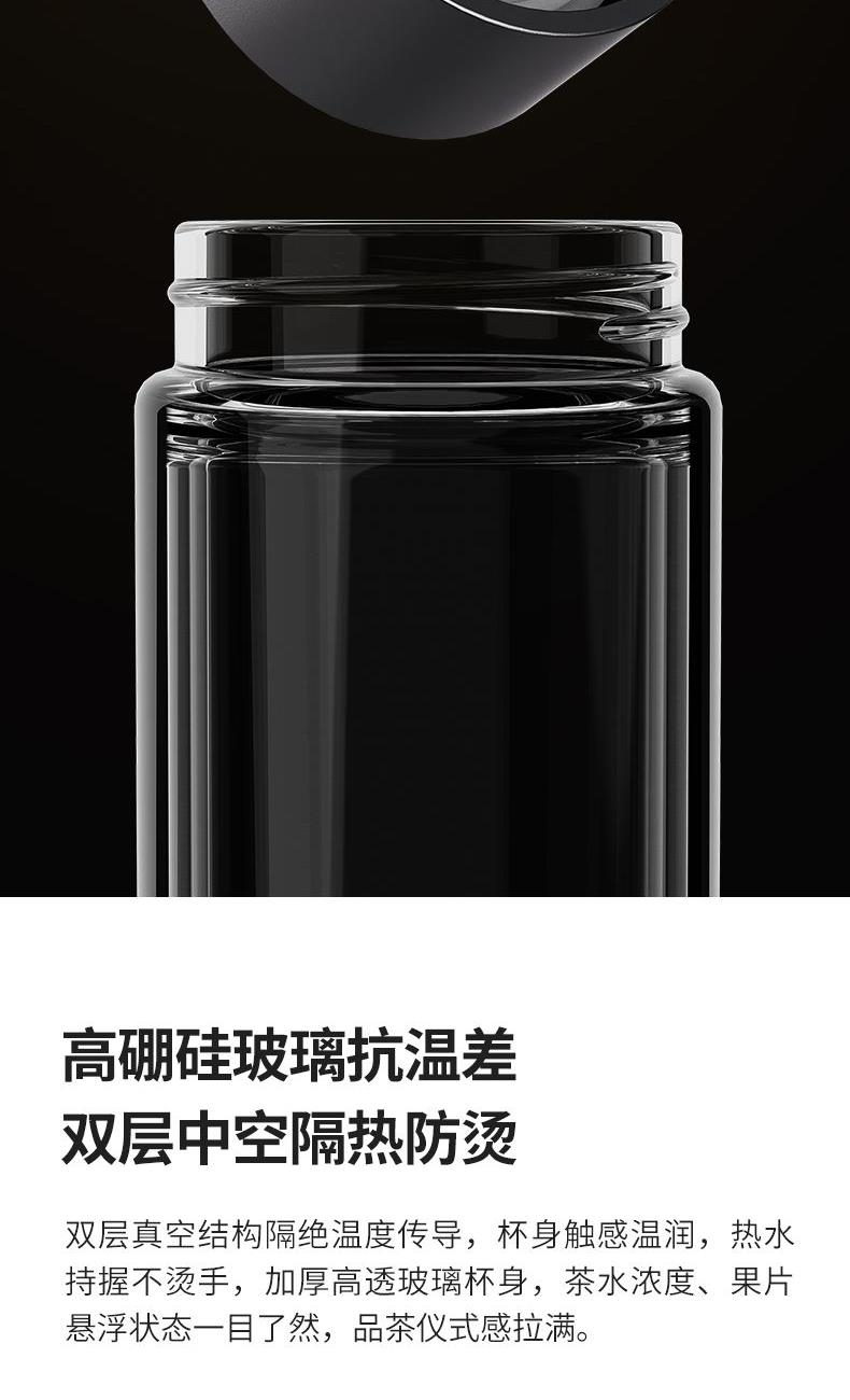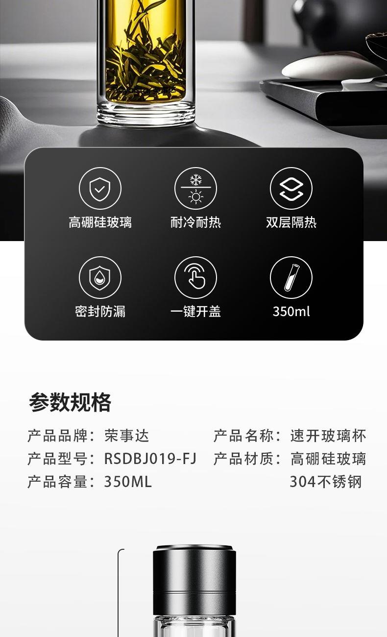 产品型号:RSDBJ019-FJ 产品容量:350ML 产品尺寸:6.5*6.5*22.7cm 产品材质:高硼硅玻璃+304不锈钢 彩盒尺寸:7.2*7.2*23.5cm 外箱尺寸:61*38.5*25cm 采用双层高硼硅高透明玻璃构造,经600多度的高温烧制而成,新型绿色环保,晶莹剔透,质感好; 双层玻璃隔热不烫手,延缓温度流失。 优质食品级PP组杯盖加以不锈钢内塞,工艺严谨,造型简约大气,手感细腻舒适。