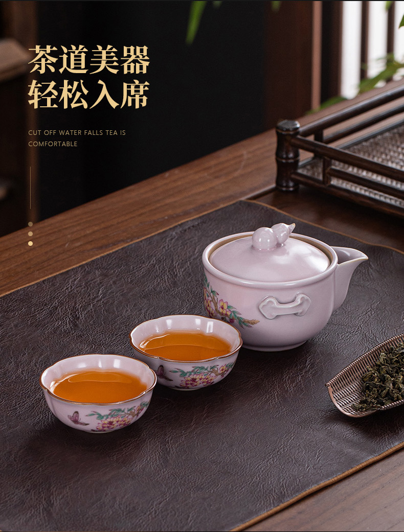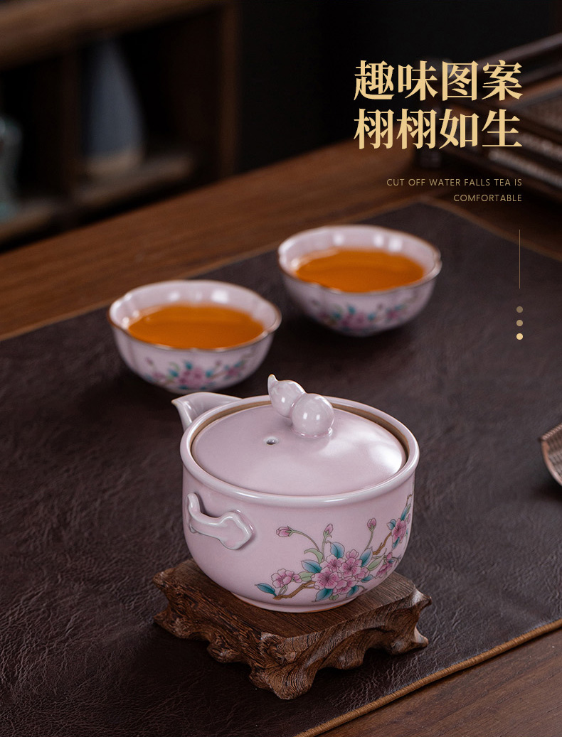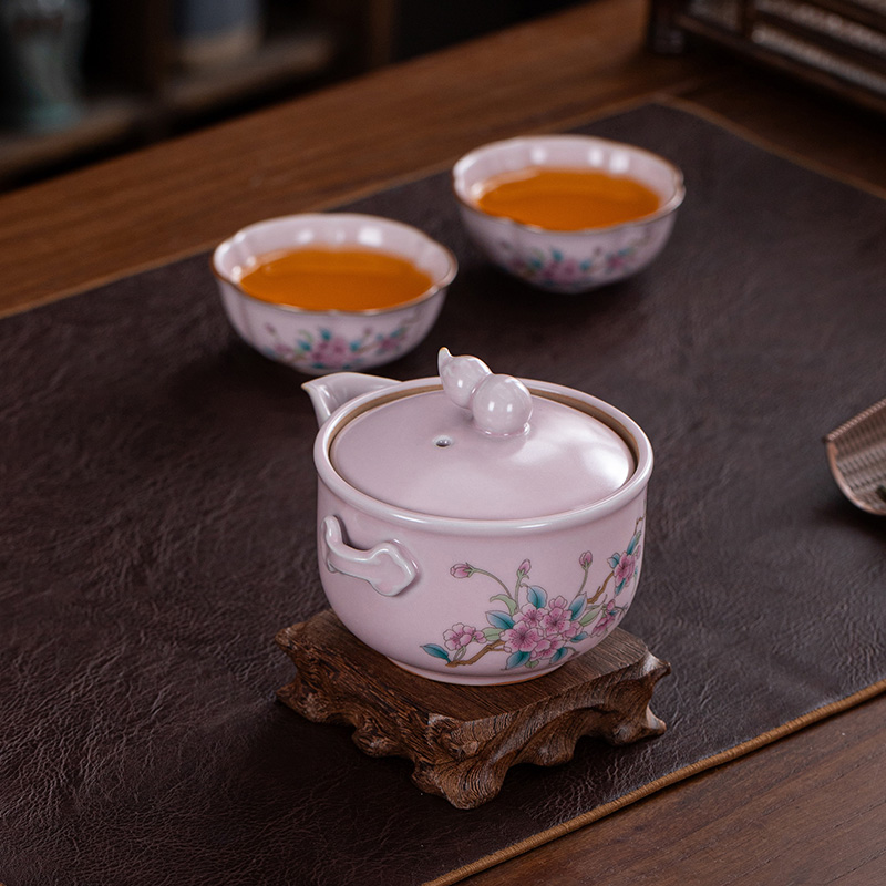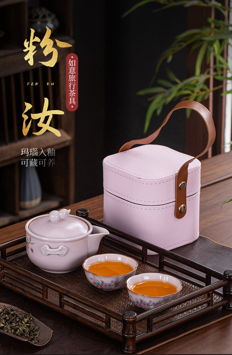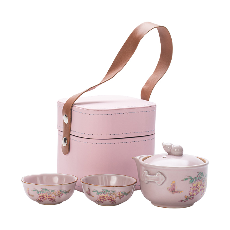 茶壶1:宽高11.3*8.3cm/容量190ml 茶杯2:宽高7.5*3.2cm/容量55ml 旅行包1:长宽高12.7*12.3*11.7cm 严选泥料,经数十道工序,高温烧制,大器天成。 外壁玛瑙入釉,蕴润柔和,如脂似玉,肥厚莹润。 盖钮葫芦造型,寓意吉祥,承载美好祝福。 人体工学设计,祥云防烫抓手,细节满满。 精美图案搭配粉色风格,时尚精致。
