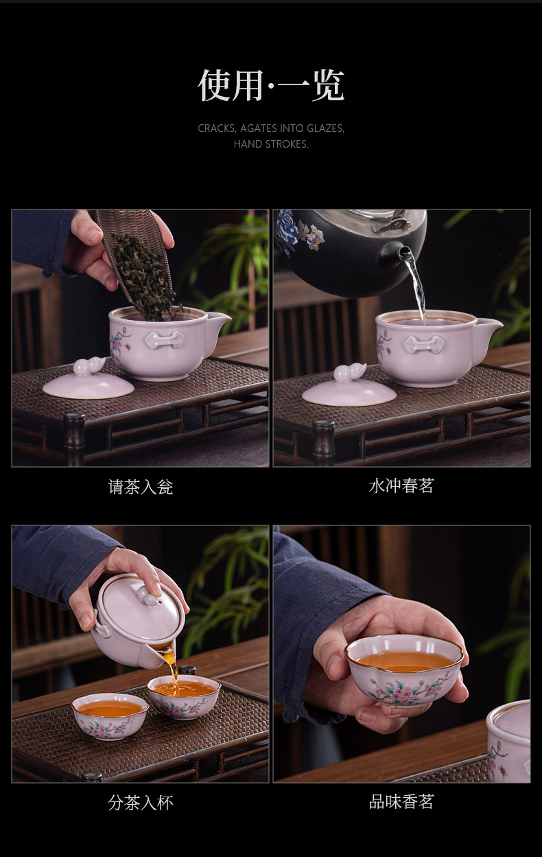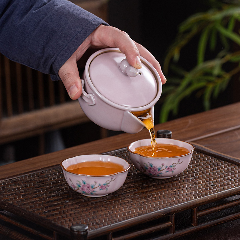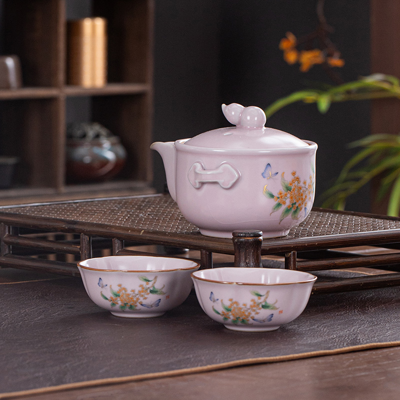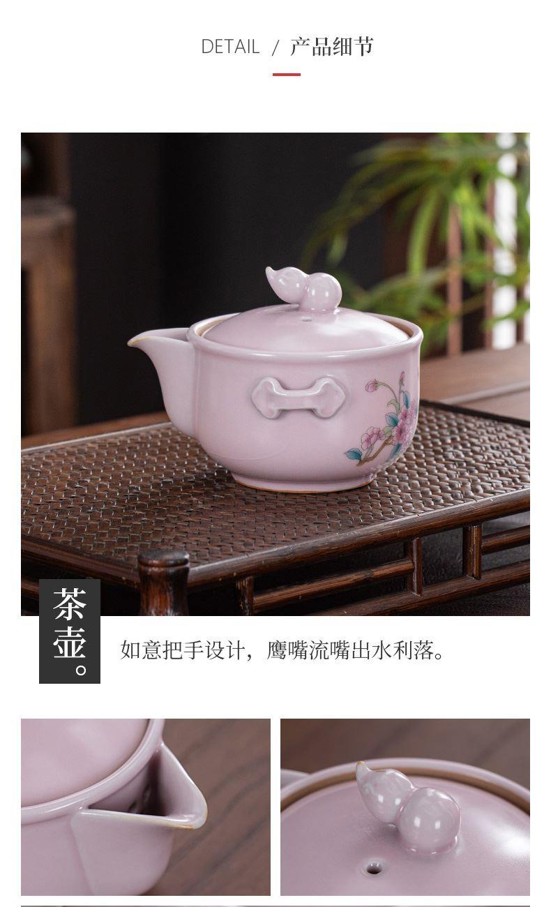 茶壶1:宽高11.3*8.3cm/容量190ml 茶杯2:宽高7.5*3.2cm/容量55ml 旅行包1:长宽高12.7*12.3*11.7cm 严选泥料,经数十道工序,高温烧制,大器天成。 外壁玛瑙入釉,蕴润柔和,如脂似玉,肥厚莹润。 盖钮葫芦造型,寓意吉祥,承载美好祝福。 人体工学设计,祥云防烫抓手,细节满满。 精美图案搭配粉色风格,时尚精致。