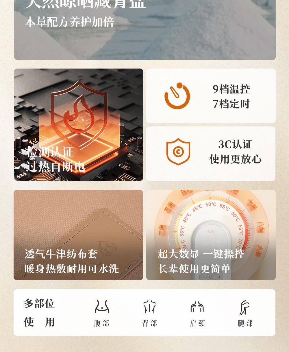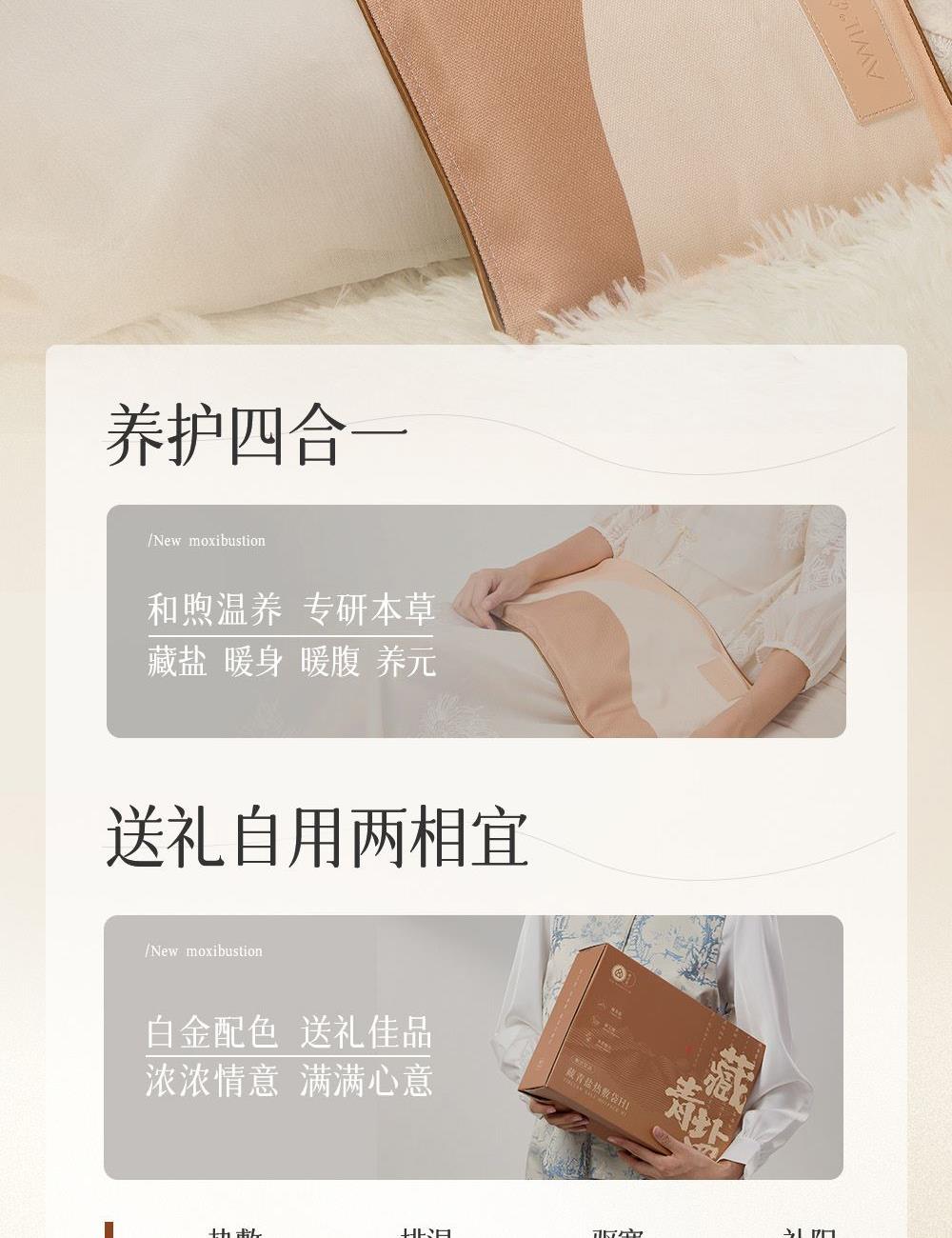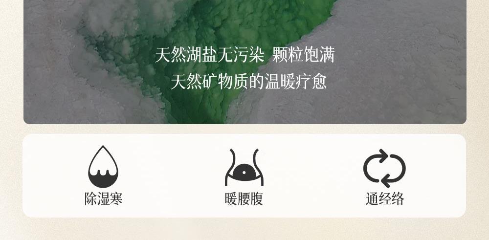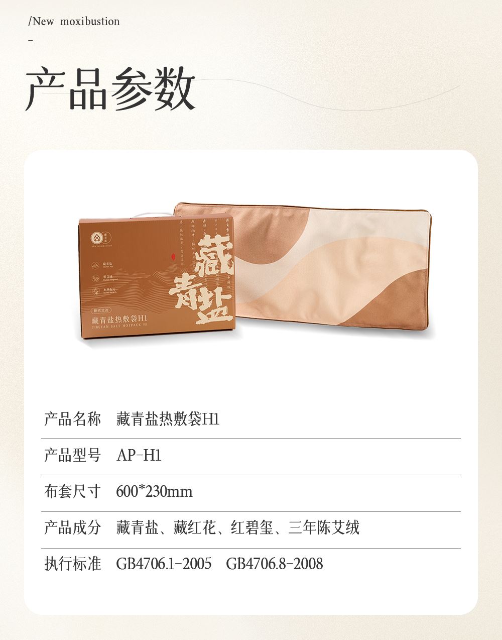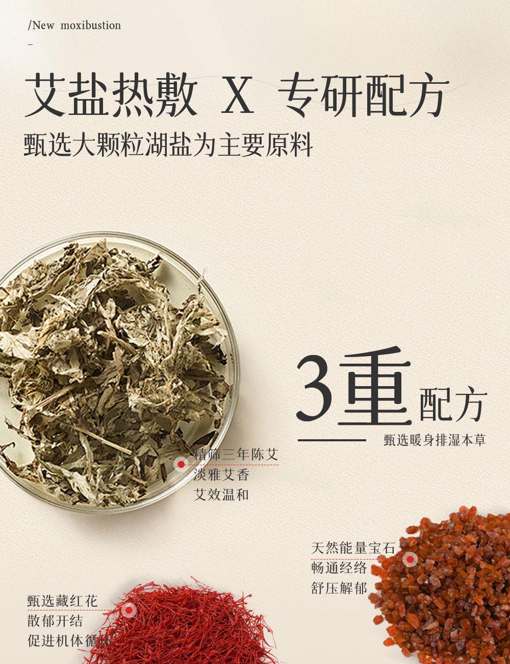 1、藏青盐热敷四大好处:明,富含矿物质;润,清凉热血,润肠通便;活,促进全身血液循环;化,祛湿散寒,补气; 2、青藏高原藏青盐,天然无污染,经海拔3100米高强度紫外线日照自然晒制而成。 3、纯艾+天然本草,有药更有效;科学配比,更易渗入肌肤; 4、CCC认证,更安全,三档控时控温,小巧精致,使用更方便。