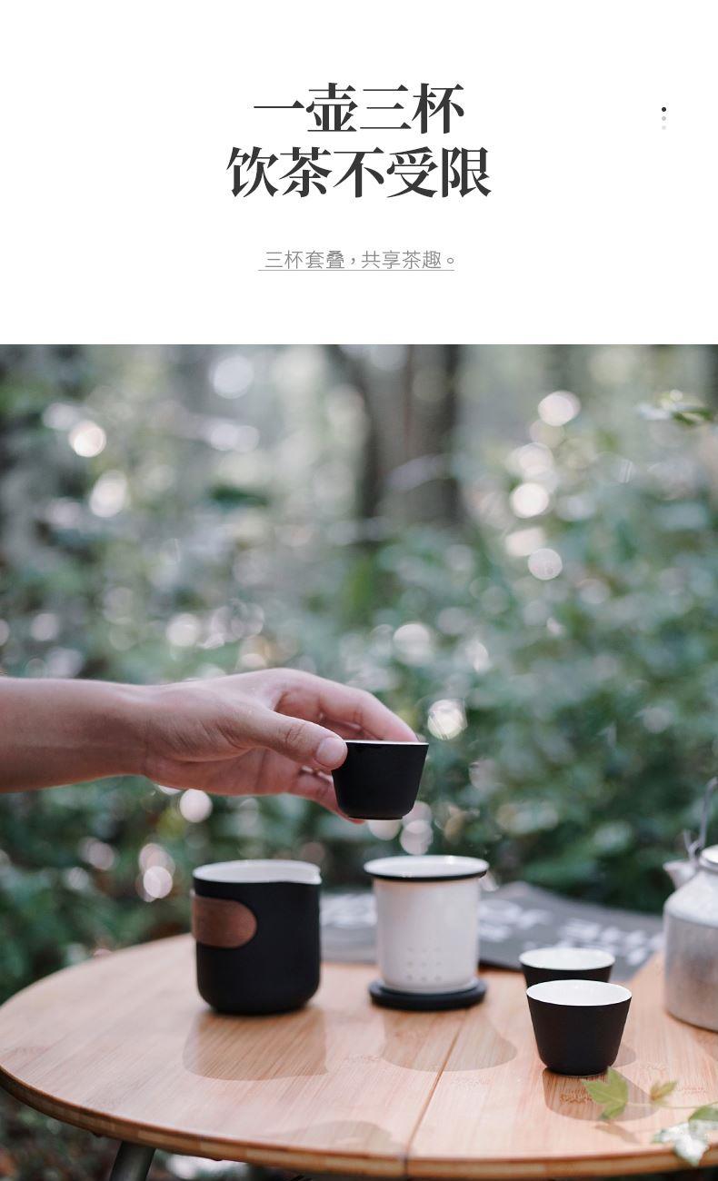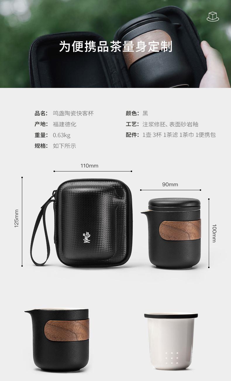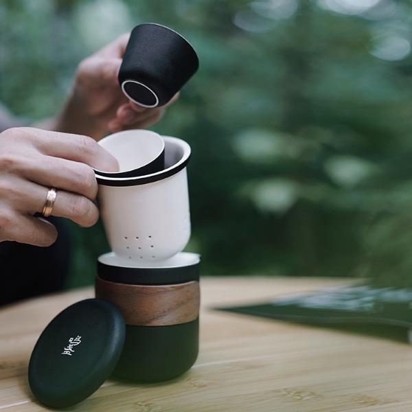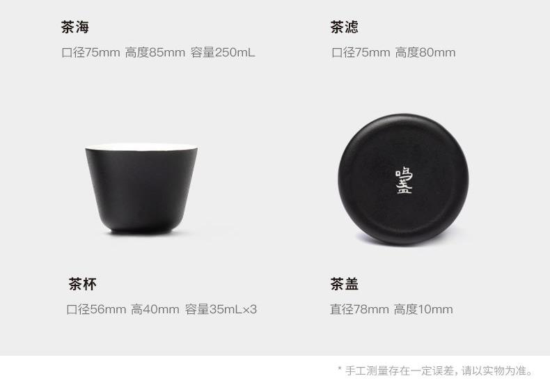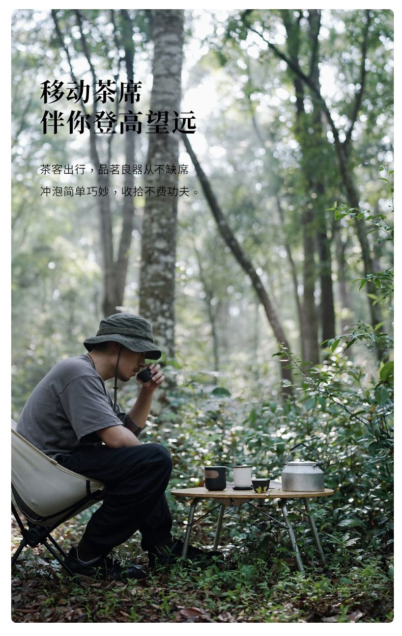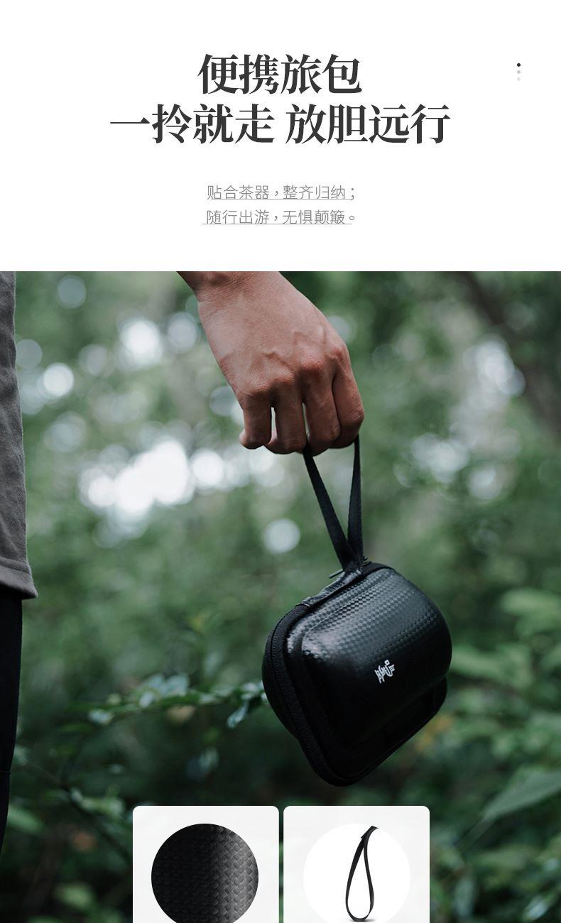 产品容量:茶海250mL/茶杯35mL 产品颜色:曜岩黑 产品尺寸:彩盒135Lx100Wx98H/邮盒200Lx140Wx156H 整体:90×80×100/茶海:90×81×87/茶漏:Φ80×82/茶盖:Φ78×12/茶杯:Φ55×42 产品重量:产品净重0.63kg/邮盒毛重0.9kg 材质:陶瓷、曲木、EVA 标准配件:茶海*1、茶漏*1、茶盖*1、茶杯*3、茶巾*1、便携包*1 为茶客出行设计的便捷品茶套装。使用嵌套式设计,一个茶壶收纳茶杯茶滤全套茶具,拎包即可出门泡茶。为保留茶席上的仪式感,茶器选用德化瓷土烧制,表面有保留磨砂黑釉的原始质感。泡茶壶上贴心加上防烫木纹饰片,并内置大容量的茶滤用于茶水分离,在户外还原茶室的专业体验。