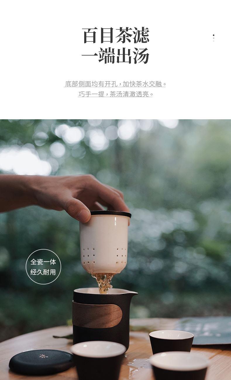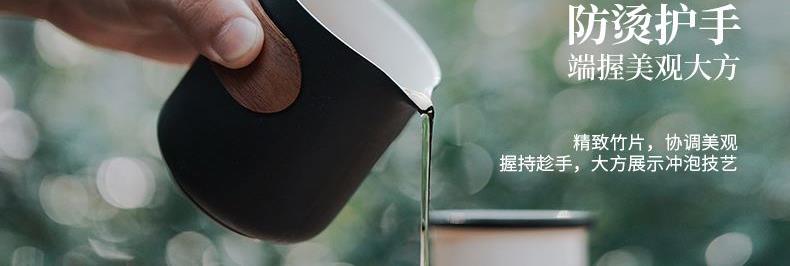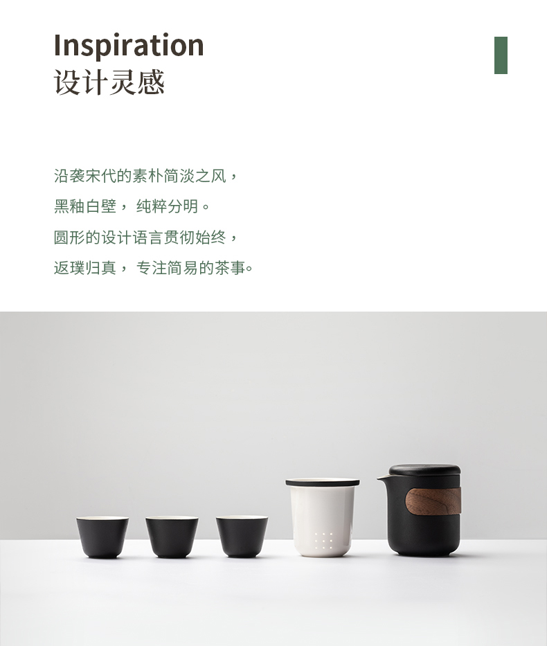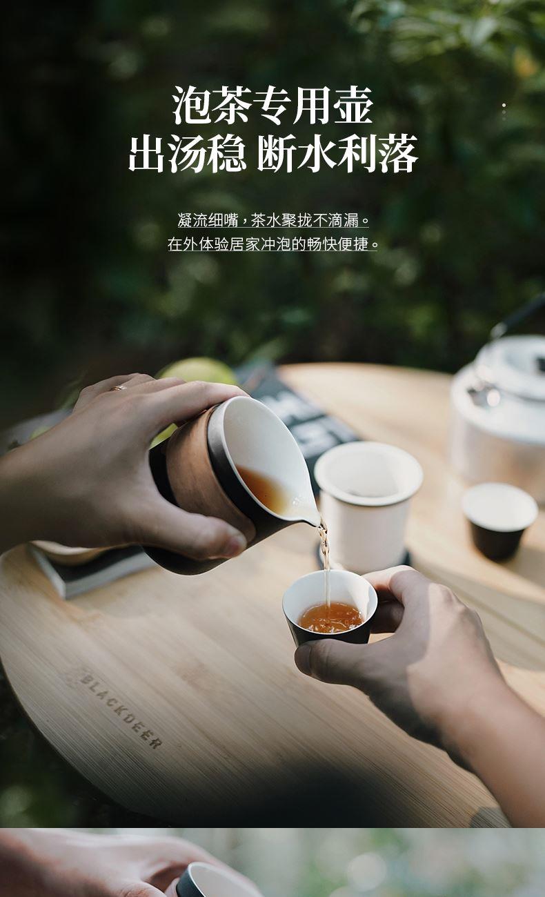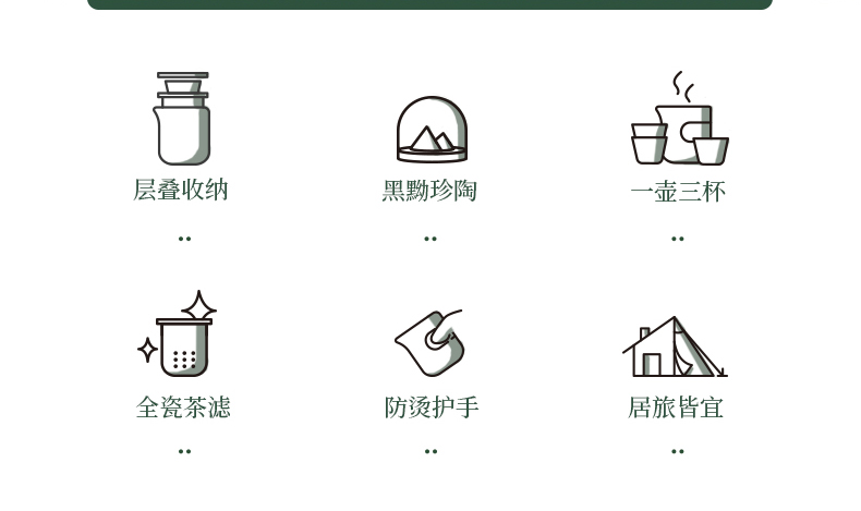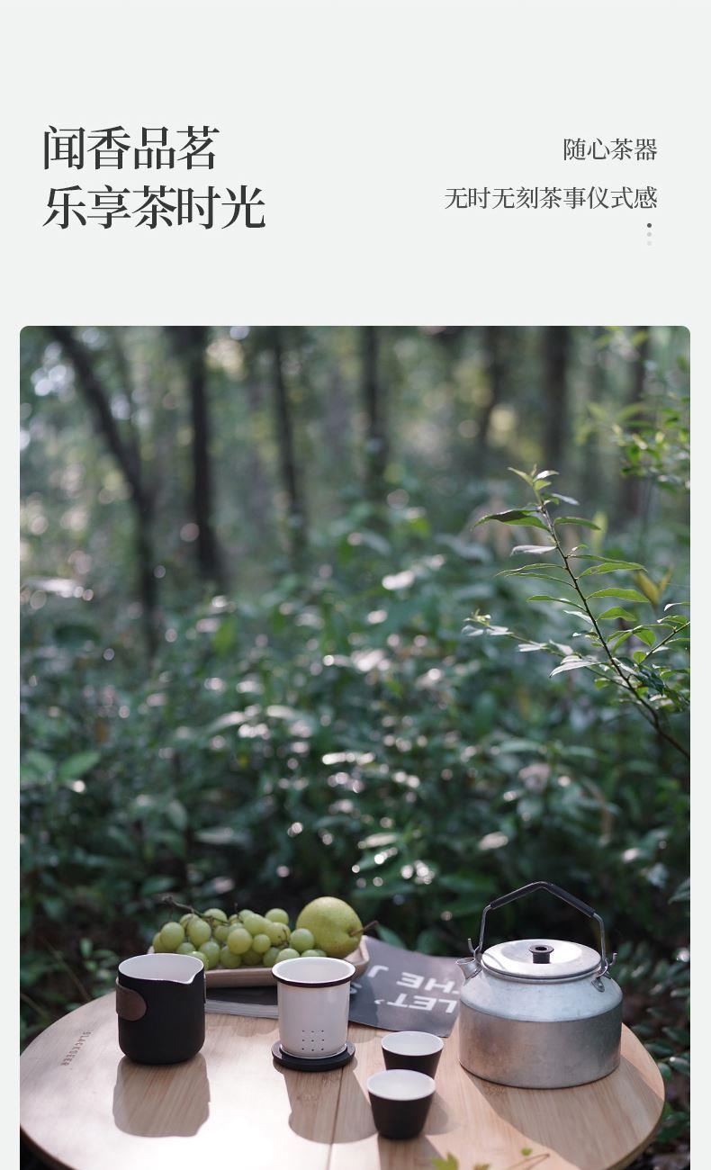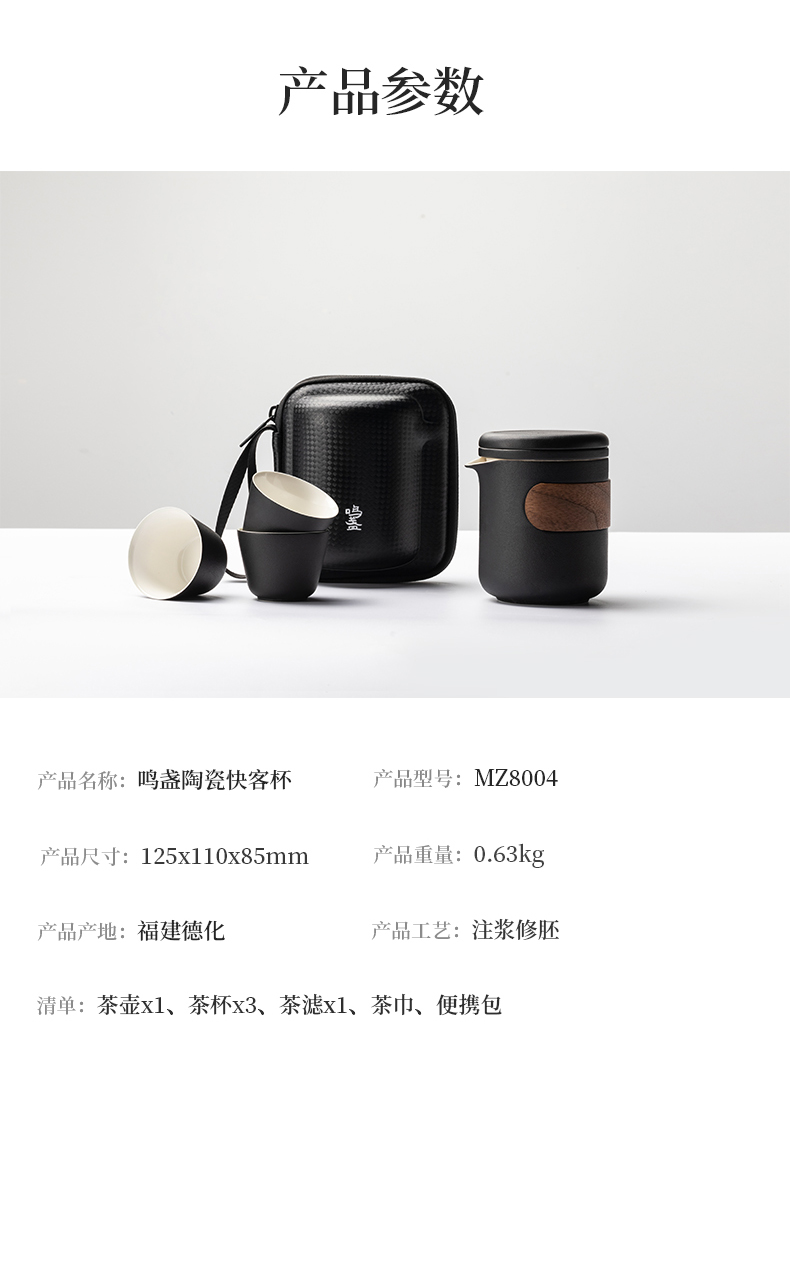 产品容量:茶海250mL/茶杯35mL 产品颜色:曜岩黑 产品尺寸:彩盒135Lx100Wx98H/邮盒200Lx140Wx156H 整体:90×80×100/茶海:90×81×87/茶漏:Φ80×82/茶盖:Φ78×12/茶杯:Φ55×42 产品重量:产品净重0.63kg/邮盒毛重0.9kg 材质:陶瓷、曲木、EVA 标准配件:茶海*1、茶漏*1、茶盖*1、茶杯*3、茶巾*1、便携包*1 为茶客出行设计的便捷品茶套装。使用嵌套式设计,一个茶壶收纳茶杯茶滤全套茶具,拎包即可出门泡茶。为保留茶席上的仪式感,茶器选用德化瓷土烧制,表面有保留磨砂黑釉的原始质感。泡茶壶上贴心加上防烫木纹饰片,并内置大容量的茶滤用于茶水分离,在户外还原茶室的专业体验。